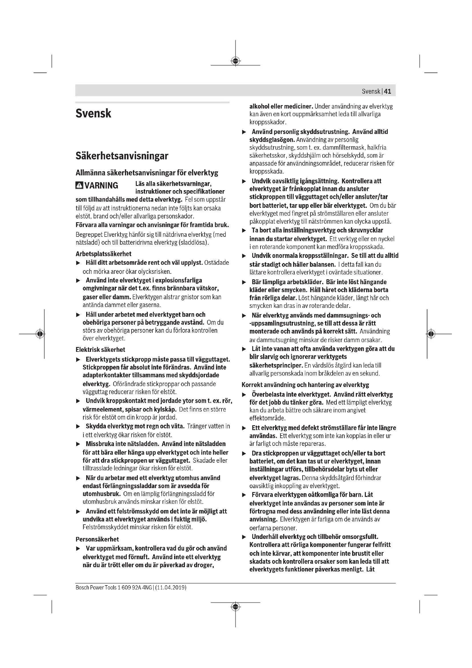 < 2,5 1,5 < 2,5 1,5 3,3 1,5 Den vibrationsnivå och det bullervärde som anges i dessa anvisningar har uppmätts enligt en mätmetod som normerats och kan användas för att jämföra elverktyg med varandra. Mätmetoden är även lämplig för preliminär bedömning av vibrations- och bullernivån. Den angivna vibrations- och bullernivån representerar den huvudsakliga användningen av elverktyget. Om däremot elverktyget används för andra ändamål, med andra insatsverktyg eller inte underhållits ordentligt kan vibrations- och bullernivån avvika. Då kan vibrations- och bullernivån under arbetsperioden öka betydligt under hela arbetstiden. För en exakt bedömning av vibrations- och bullernivån bör även de tider beaktas när elverktyget är avstängt eller är igång, men inte används. Detta reducerar vibrations- och bullerbelastningen för den totala arbetsperioden betydligt. Bestäm extra säkerhetsåtgärder för att skydda operatören mot vibrationernas inverkan t.ex.: underhåll av elverktyget och insatsverktygen, att hålla händerna varma, organisation av arbetsförloppen. Montage u Dra stickproppen ur nätuttaget innan arbeten utförs på elverktyget. Verktygsbyte (se bild A) Dra av djupanslaget (4) framåt. Dra ut skruvbiten (1). Vid behov kan även universalbithållaren (10) dras ut och bytas. Sätt på djupanslaget efter verktygsbyte. Drift Driftstart u Beakta nätspänningen! Kontrollera att strömkällans spänning överensstämmer med uppgifterna på elverktygets typskylt. Elverktyg märkta med 230V kan även anslutas till 220V. Inställning av rotationsriktning Med riktningsomkopplaren (8) kan elverktygets rotationsriktning ändras. Vid nedtryckt strömställare Till/ Från (7) kan omkoppling inte ske. – Högergång: För att skruva in skruvar skjuter du rotationsriktningsomkopplaren (8) till vänster ända till anslaget. – Vänstergång: För att lossa eller skruva ut skruvar skjuter du rotationsriktningsomkopplaren (8) till höger ända till anslag. Bosch Power Tools 1 609 92A 4NG | (11.04.2019)44 | Norsk In- och urkoppling Tryck för start av elverktyget ned strömställaren Till/Från (7) och håll den nedtryckt. För att fastställa den intryckta strömbrytaren, (7) tryck på spärrknappen (6). För att stänga av elverktyget släpper du strömbrytaren (7), eller om den är låst med spärrknappen (6) trycker du kort på strömbrytaren (7) och släpper den sedan. Inställning av varvtal Du kan reglera det startade elverktygets varvtal medan det är igång, beroende på hur långt du trycker in på-/avknappen (7). Ett lätt tryck på strömställaren Till/Från (7) ger ett lågt varvtal. Med tilltagande tryck ökar varvtalet. Ställ in inskruvningsdjupet (se bild B) Med inställningshylsan (3) kan skruvhuvudets inskruvningsdjup i arbetsstycket väljas i 8 steg per varv. Varje steg motsvarar en förändring av inskruvningsdjupet på 0,25mm. Vridning av inställningshylsan (3) medsols ger ett större inskruvningsdjup, vridning motsols ett mindre inskruvningsdjup. Inställningen som behövs fastställer du lättast genom en provskruvning. Arbetsanvisningar u Dra stickproppen ur nätuttaget innan arbeten utförs på elverktyget. u Elverktyget ska vara avstängt när det förs mot muttern/skruven. Roterande insatsverktyg kan slira bort. För skruven till skruvbiten (1). Skruven hålls genom universalbithållarens (10) magnetkraft. Tryck skruvspetsen kraftigt mot materialet som ska skruvas tills skruvdjupsanslaget (4) står mot arbetsstycket. Sätt på elverktyget. Skruven skruvas in i arbetsstycket tills önskat inskruvningsdjup har uppnåtts. Drivningen kopplas från, verktygsfästet roterar inte längre. Kontrollera inskruvningsdjupet och justera det vid behov. För att lossa skruvar, ställ riktningsomkopplaren (8) på vänstergång och dra av skruvdjupsanslaget (4) framåt utan att vrida inställningshylsan. Du kan också arbeta med monterat skruvdjupsanslag (4) när du anpassat inskruvningsdjupet. Bältesclips Med bältesclipsen (5) kan elverktyget hängas t ex på ett bälte. Vid upphängt elverktyg är båda händerna lediga och elverktyget är alltid till hands. Underhåll och service Underhåll och rengöring u Dra stickproppen ur nätuttaget innan arbeten utförs på elverktyget. u Håll elverktyget och dess ventilationsöppningar rena för bra och säkert arbete. Om nätsladden för bibehållande av verktygets säkerhet måste bytas ut, ska byte ske hos Bosch eller en auktoriserad serviceverkstad för Bosch elverktyg. Kundtjänst och applikationsrådgivning Kundservicen ger svar på frågor beträffande reparation och underhåll av produkter och reservdelar. Explosionsritningar och informationer om reservdelar hittar du också under: www.bosch-pt.com Boschs applikationsrådgivnings-team hjälper dig gärna med frågor om våra produkter och tillbehören till dem. Ange alltid det 10‑siffriga produktnumret, som finns på produktens typskylt, vid förfrågningar och reservdelsbeställningar. Svenska Bosch Service Center Telegrafvej 3 2750 Ballerup Danmark Tel.: (08) 7501820 (inom Sverige) Fax: (011) 187691 Avfallshantering Elverktyg, tillbehör och förpackning ska omhändertas på miljövänligt sätt för återvinning. Släng inte elverktyg bland hushållsavfallet! Endast för EU‑länder: Enligt det europeiska direktivet 2012/19/EU om förbrukade elektriska och elektroniska apparater och dess omsättning i nationell rätt måste obrukbara elverktyg omhändertas separat och på ett miljövänligt sätt lämnas in för återvinning. Norsk Sikkerhetsanvisninger Generelle sikkerhetsanvisninger for elektroverktøy ADVARSEL Les alle sikkerhetsanvisningene, instruksjonene, illustrasjonene og spesifikasjonene som følger med dette elektroverktøyet. Manglende overholdelse av anvisningene nedenfor kan medføre elektrisk støt, brann og/ eller alvorlige personskader. Ta godt vare på alle advarslene og all informasjonen. 1 609 92A 4NG | (11.04.2019) Bosch