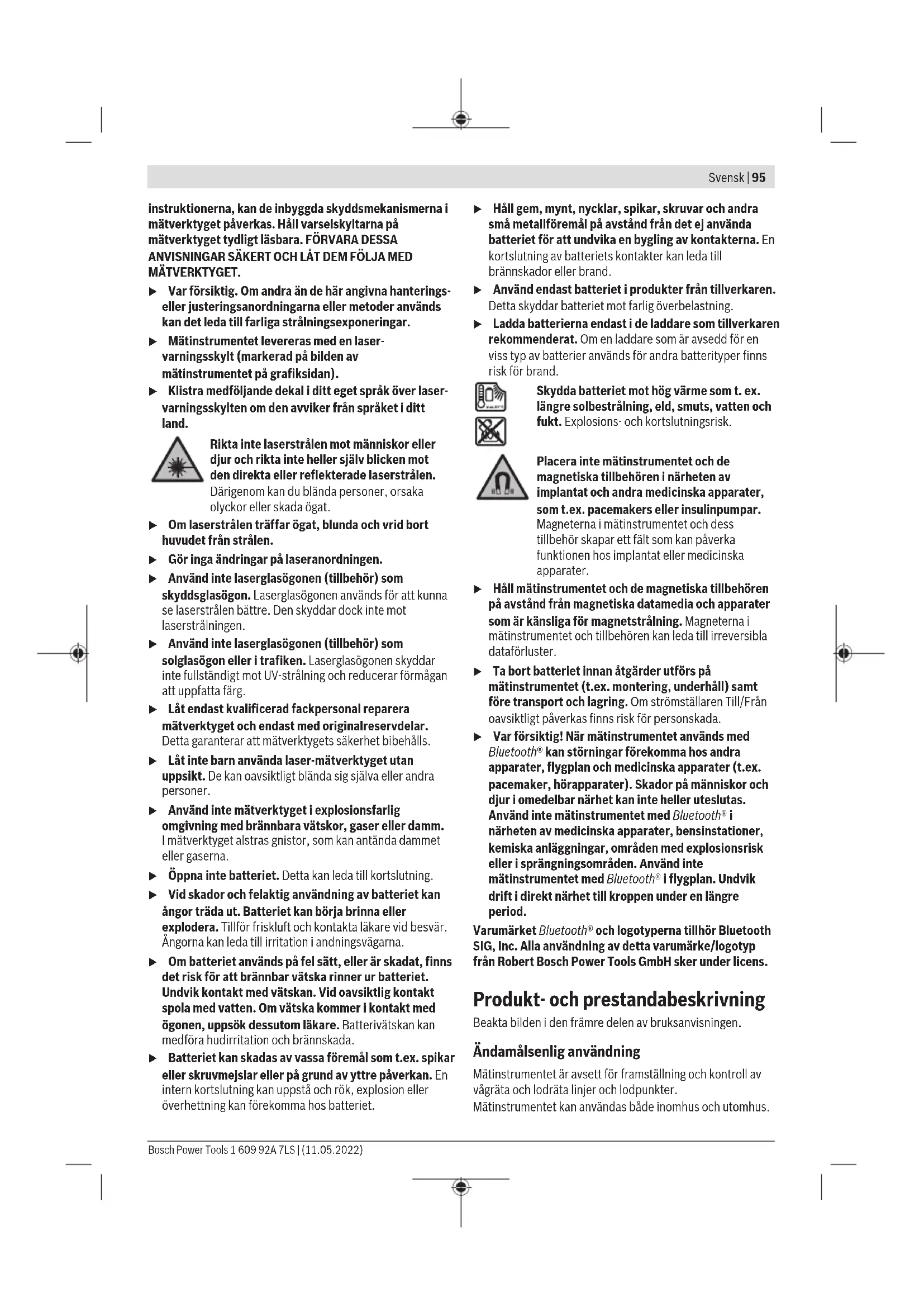 Markér midten af det øverste laserpunkt (punktIII). – Differencen d mellem de to markerede punkter og Ⅰ og Ⅲ på loftet angiver måleværktøjets faktiske afvigelse fra lodret. Den maksimalt tilladte afvigelse beregnes på følgende måde: Dobbelt afstand mellem gulv og loft×0,7mm/m. Eksempel: Ved en afstand mellem gulv og loft på 5m må den maksimale afvigelse være 2×5m×±0,7mm/m=±7mm. Punkterne Ⅰ og Ⅲ må såle- des højst ligge 7mm fra hinanden. Arbejdsvejledning u Brug altid kun laserpunktets/laserlinjens midte til markering. Laserpunktets størrelse og laserlinjens bredde ændres i takt med afstanden. u Måleværktøjet er udstyret med et trådløst interface. Der kan være lokale driftsbegrænsninger i f.eks. fly eller på sygehuse. Arbejde med laser-måltavlen Laser-måltavlen (31) forbedrer laserstrålens synlighed ved ugunstige betingelser og større afstande. Den reflekterende del af laser-måltavlen(31) forbedrer la- serlinjens synlighed, og takket være den transparente del er laserlinjen også synlig fra bagsiden af laser-måltavlen. Arbejde med stativ (tilbehør) Et stativ udgør et stabilt, højdejusterbart måleunderlag. Sæt måleværktøjet med 1/4"-stativholderen (18) på stativets Bosch Power Tools 1 609 92A 7LS | (11.05.2022)94 | Svensk (32) gevind eller på et normalt fotostativs gevind. Skru må- leværktøjet fast igen med stativets låseskrue. Juster stativet groft, før du tænder måleværktøjet. Fastgør med universalholderen (tilbehør) (se billede L) Ved hjælp af universalholderen (26) kan du fastgøre måle- værktøjet på f.eks. lodrette flader, rør eller magnetiserbare materialer. Universalholderen kan også bruges som gulvsta- tiv og letter højdejusteringen af måleværktøjet. Juster universalholderen (26) groft, før du tænder måle- værktøjet. Arbejde med lasermodtager (tilbehør) (se billede L) Ved ugunstige lysforhold (lyse omgivelser, direkte sollys) og på større afstande bruger du lasermodtageren (29) for bed- re at kunne finde laserlinjerne. Slå modtagertilstanden til ved arbejde med lasermodtageren (se "Modtagertilstand", Side90). Laserbriller (tilbehør) Laserbrillerne filtrerer det omgivende lys fra. Derved frem- står laserens lys lysere for øjet. u Brug ikke laserbrillerne (tilbehør) som beskyttelses- briller. Med laserbrillerne kan man lettere få øje på laser- strålen, men de beskytter ikke mod laserstråling. u Brug ikke laserbrillerne (tilbehør) som solbriller eller i trafikken. Laserbrillerne beskytter ikke 100% mod ul- traviolette(UV) stråler og reducerer ens evne til at regi- strere og iagttage farver. Arbejdseksempler (se billeder G–M) Eksempler på anvendelsesmuligheder for måleværktøjet fin- der du på illustrationssiderne. Vedligeholdelse og service Vedligeholdelse og rengøring Hold altid måleværktøjet rent. Dyp ikke måleværktøjet i vand eller andre væsker. Tør snavs af med en fugtig, blød klud. Brug ikke rengørings- eller opløsningsmiddel. Rengør især flader ved laserens udgangsåbning regelmæs- sigt, og vær opmærksom på fnug. Kundeservice og anvendelsesrådgivning Kundeservice besvarer dine spørgsmål vedr. reparation og vedligeholdelse af dit produkt samt reservedele. Eksplo- sionstegninger og oplysninger om reservedele finder du også på: www.bosch-pt.com Bosch-anvendelsesrådgivningsteamet hjælper dig gerne, hvis du har spørgsmål til produkter og tilbehørsdele. Produktets 10‑cifrede typenummer (se typeskilt) skal altid angives ved forespørgsler og bestilling af reservedele. Dansk Bosch Service Center Telegrafvej 3 2750 Ballerup På www.bosch-pt.dk kan der online bestilles reservedele el- ler oprettes en reparations ordre. Tlf. Service Center: 44898855 Fax: 44898755 E-Mail: vaerktoej@dk.bosch.com Du finder adresser til andre værksteder på: www.bosch-pt.com/serviceaddresses Transport De anbefalede lithium-ion-akkuer overholder bestemmelser- ne om farligt gods. Akkuerne kan transporteres af brugeren på offentlig vej uden yderligere pålæg. Ved forsendelse gennem tredjemand (f.eks.: lufttransport el- ler spedition) skal særlige krav vedr. emballage og mærkning overholdes. Her skal man kontakte en faregodsekspert, før forsendelsesstykket forberedes. Send kun akkuer, hvis huset er ubeskadiget. Tilklæb åbne kontakter, og indpak akkuen på en sådan måde, at den ikke kan bevæge sig i emballagen. Følg venligst også eventuelle, videreførende, nationale forskrifter. Bortskaffelse Måleværktøjer, akkuer/batterier, tilbehør og emballage skal bortskaffes miljømæssigt kor- rekt, så de kan genvindes. Smid ikke måleværktøjer og akkuer/batterier ud sammen med husholdningsaffaldet! Gælder kun i EU‑lande: Iht. det europæiske direktiv 2012/19/EU om affald fra elek- trisk og elektronisk udstyr og de nationale bestemmelser, der er baseret herpå, skal kasseret måleværktøj, og iht. det europæiske direktiv 2006/66/EF skal defekte eller opbrugte akkuer/batterier indsamles separat og genbruges iht. gæl- dende miljøforskrifter. Ved forkert bortskaffelse kan elektrisk og elektronisk affald have skadelige virkninger på miljøet og menneskers sundhed på grund af den mulige tilstedeværelse af farlige stoffer. Akkuer/batterier: Li-ion: Læs og overhold henvisningerne i afsnittet om transport (se "Transport", Side94). Svensk Säkerhetsanvisningar Samtliga anvisningar ska läsas och följas för att arbetet med mätverktyget ska bli riskfritt och säkert. Om mätverktyget inte används i enlighet med de föreliggande 1 609 92A 7LS | (11.05.2022) Bosch Power ToolsSvensk | 95 instruktionerna, kan de inbyggda skyddsmekanismerna i mätverktyget påverkas. Håll varselskyltarna på mätverktyget tydligt läsbara. FÖRVARA DESSA ANVISNINGAR SÄKERT OCH LÅT DEM FÖLJA MED MÄTVERKTYGET. u Var försiktig. Om andra än de här angivna hanterings- eller justeringsanordningarna eller metoder används kan det leda till farliga strålningsexponeringar. u Mätinstrumente