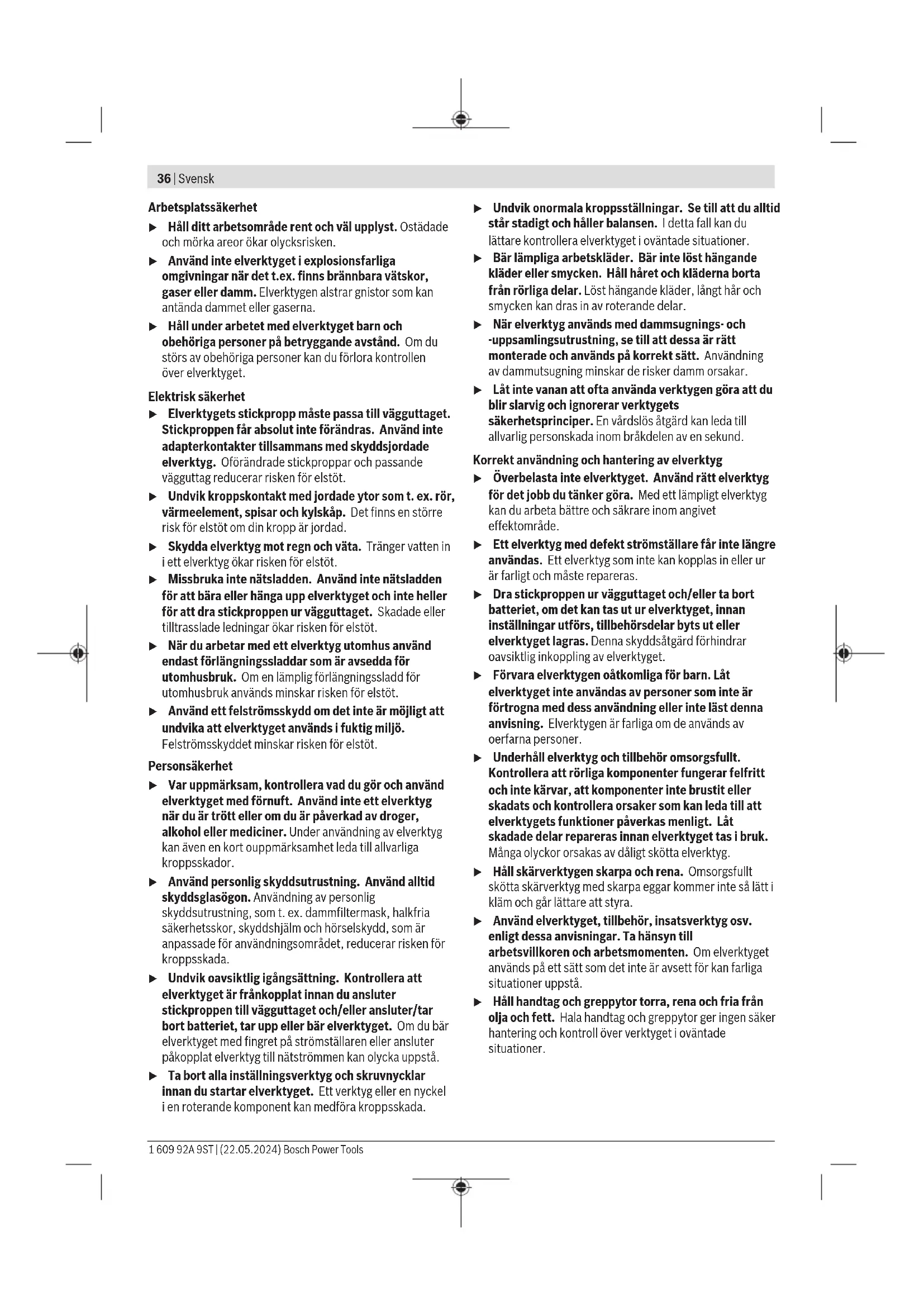 0,7 Aluminium 200 2,0 Smøring/køling af stempel Stemplets levetid(6) forlænges ved at bruge et smøremid- del med god kølefunktion (f. eks. skæreolie). Påfør et smøremiddelspor på oversiden af pladen langs med den planlagte snitlinje. Skæring efter markering eller vha. skabelon Ligesnit er nemmere at lave, hvis el‑værktøjet føres langs med en lineal. Konturer kan skæres ved at føre el-værktøjet langs med en skabelon. Til snit indefra og ud skal der forbores med en diameter på 21mm. Vedligeholdelse og service Vedligeholdelse og rengøring u Træk stikket ud af stikkontakten, før der udføres ar- bejde på el‑værktøjet. u El‑værktøj og el‑værktøjets ventilationsåbninger skal altid holdes rene for at sikre et godt og sikkert ar- bejde. Hvis det er nødvendigt at erstatte tilslutningsledningen, skal dette arbejde udføres af Bosch eller på et autoriseret servi- ceværksted for Bosch el‑værktøj for at undgå farer. Rengør stempel(6) og matrice(7), og smør med olie hver 3.driftstime. Udskift stempel og matrice i god tid, hvis de er slidte, da kun skarpt værktøj kan sikre et godt skæreresultat og skåne el- værktøjet. Stemplet(6) og matricen(7) må ikke efterslibes. Udskiftning af matrice Skru fingerskruen(9) ud af matriceholderen(5). Tag matricen(7) ud. Rengør om nødvendigt matriceholderen(5). Sæt en ny matrice(7), som er smurt godt med olie, i matriceholderen. Kontroller, at den flade side vender rigtigt. Skru fingerskruen(9) på igen med påsat gummiring(8). Spænd skruen mod gummiringens modstand (3−4Nm) ved hjælp af en unbrakonøgle. Udskiftning af stempel Løsn skruen(2) til matriceholderen, og træk matriceholderen(5) helt ud af huset. Skub stemplet(6) sideværts ud af holderen, og træk det nedad og ud. Sæt et nyt stempel(6), som er smurt godt med olie, i hol- derens not, og centrer det. Skub matriceholderen(5) forsigtigt hen over stemplet og til- bage i huset. Drej matriceholderen til en af de tre mulige po- sitioner afhængigt af den ønskede snitretning. Spænd skruen(2) til matriceholderen godt fast. Kundeservice og anvendelsesrådgivning Kundeservice besvarer dine spørgsmål vedr. reparation og vedligeholdelse af dit produkt samt reservedele. Eksplo- sionstegninger og oplysninger om reservedele finder du også på: www.bosch-pt.com Bosch-anvendelsesrådgivningsteamet hjælper dig gerne, hvis du har spørgsmål til produkter og tilbehørsdele. Produktets 10‑cifrede typenummer (se typeskilt) skal altid angives ved forespørgsler og bestilling af reservedele. Dansk Bosch Service Center Telegrafvej 3 2750 Ballerup På www.bosch-pt.dk kan der online bestilles reservedele el- ler oprettes en reparations ordre. Tlf. Service Center: 44898855 Fax: 44898755 E-Mail: vaerktoej@dk.bosch.com Du finder adresser til andre værksteder på: www.bosch-pt.com/serviceaddresses Bortskaffelse El‑værktøj, tilbehør og emballage skal genbruges på en miljø- venlig måde. Smid ikke el-værktøj ud sammen med det al- mindelige husholdningsaffald! Gælder kun i EU‑lande: Udtjent el-værktøj skal bortskaffes separat. Brug det gæl- dende afleveringssystem. Ved forkert bortskaffelse kan elektrisk og elektronisk affald have skadelige virkninger på miljøet og menneskers sundhed på grund af den mulige tilstedeværelse af farlige stoffer. Svensk Säkerhetsanvisningar Allmänna säkerhetsanvisningar för elverktyg VARNING Läs alla säkerhetsvarningar, instruktioner och specifikationer som tillhandahålls med detta elverktyg. Fel som uppstår till följd av att instruktionerna nedan inte följts kan orsaka elstöt, brand och/eller allvarliga personskador. Förvara alla varningar och anvisningar för framtida bruk. Begreppet Elverktyg hänför sig till nätdrivna elverktyg (med nätsladd) och till batteridrivna elverktyg (sladdlösa). Bosch Power Tools 1 609 92A 9ST | (22.05.2024)36 | Svensk Arbetsplatssäkerhet u Håll ditt arbetsområde rent och väl upplyst. Ostädade och mörka areor ökar olycksrisken. u Använd inte elverktyget i explosionsfarliga omgivningar när det t.ex. finns brännbara vätskor, gaser eller damm. Elverktygen alstrar gnistor som kan antända dammet eller gaserna. u Håll under arbetet med elverktyget barn och obehöriga personer på betryggande avstånd. Om du störs av obehöriga personer kan du förlora kontrollen över elverktyget. Elektrisk säkerhet u Elverktygets stickpropp måste passa till vägguttaget. Stickproppen får absolut inte förändras. Använd inte adapterkontakter tillsammans med skyddsjordade elverktyg. Oförändrade stickproppar och passande vägguttag reducerar risken för elstöt. u Undvik kroppskontakt med jordade ytor som t.ex. rör, värmeelement, spisar och kylskåp. Det finns en större risk för elstöt om din kropp är jordad. u Skydda elverktyg mot regn och väta. Tränger vatten in i ett elverktyg ökar risken för elstöt. u Missbruka inte nätsladden. Använd inte nätsladden för att bära eller hänga upp elverktyget och inte heller för att dra stickproppen ur vägguttaget. Skadade eller tilltrasslade ledningar ökar risken för elstöt. u När du arbetar med ett elverktyg utomhus använd endast förlängningssladdar som är avsedda för utomhusbruk. Om en lämplig förlängningssladd för utomhusbruk används minskar risken för elstöt. u Använd ett felströmsskydd om det inte är möjligt att undvika att elverktyget används i fuktig miljö. Felströmsskyddet minskar risken för elstöt. Personsäkerhet u Var uppmärksam, kontrollera vad du gör och använd elverktyget med förnuft. Använd inte ett elverktyg när du är trött eller om du är påverkad av droger, alkohol eller mediciner. Under användning av elverktyg kan även en kort ouppmärksamhet leda till allvarliga kroppsskador. u Använd personlig skyddsutrustning. Använd alltid skyddsglasögon. Användning av personlig skyddsutrustning, som t. ex. dammfiltermask, halkfria säkerhetsskor, skyddshjälm och hörselskydd, som 
