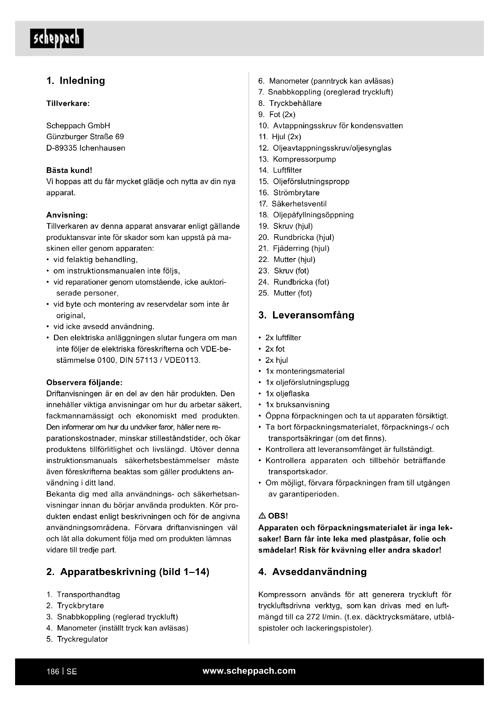 Tillverkare: Scheppach GmbH Günzburger Straße 69 D-89335 Ichenhausen Bästa kund! Vi hoppas att du får mycket glädje och nytta av din nya apparat. Anvisning: Tillverkaren av denna apparat ansvarar enligt gällande produktansvar inte för skador som kan uppstå på ma- skinen eller genom apparaten: