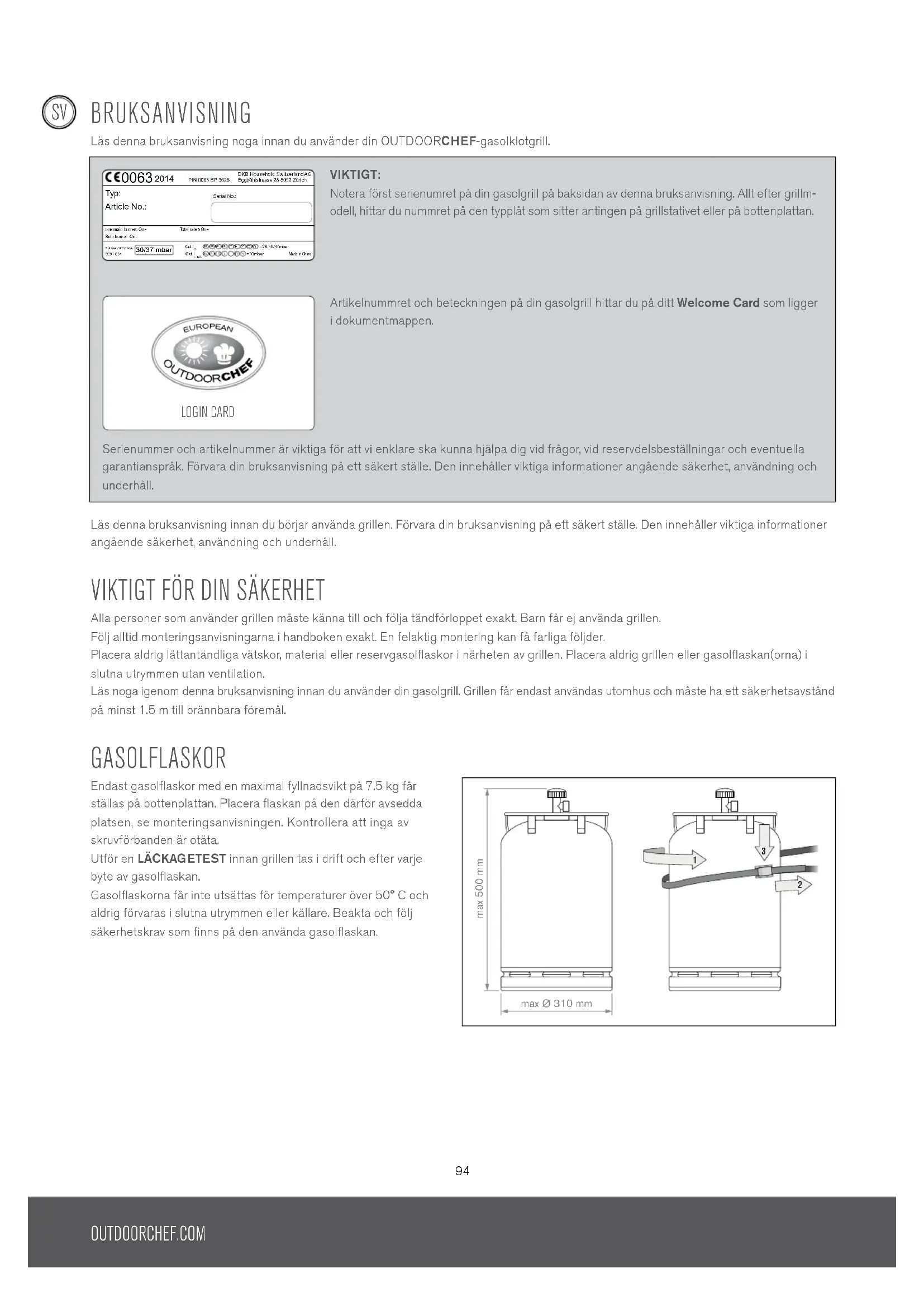 BRUKSANvISNING Läs denna bruksanvisning noga innan du använder din OUTDOORCHEF-gasolklotgrill. Läs denna bruksanvisning innan du börjar använda grillen. Förvara din bruksanvisning på ett säkert ställe. Den innehåller viktiga informationer angående säkerhet, användning och underhåll. vIKTIGT FöR DIN SäKERHET Alla personer som använder grillen måste känna till och följa tändförloppet exakt. Barn får ej använda grillen. Följ alltid monteringsanvisningarna i handboken exakt. En felaktig montering kan få farliga följder. Placera aldrig lättantändliga vätskor, material eller reservgasolflaskor i närheten av grillen. Placera aldrig grillen eller gasolflaskan(orna) i slutna utrymmen utan ventilation. Läs noga igenom denna bruksanvisning innan du använder din gasolgrill. Grillen får endast användas utomhus och måste ha ett säkerhetsavstånd på minst 1.5 m till brännbara föremål. GASOLFLASKOR Endast gasolflaskor med en maximal fyllnadsvikt på 7.5 kg får ställas på bottenplattan. Placera flaskan på den därför avsedda platsen, se monteringsanvisningen. Kontrollera att inga av skruvförbanden är otäta. Utför en LÄCKAGETEST innan grillen tas i drift och efter varje byte av gasolflaskan. Gasolflaskorna får inte utsättas för temperaturer över 50° C och aldrig förvaras i slutna utrymmen eller källare. Beakta och följ säkerhetskrav som finns på den använda gasolflaskan. max 500 mm max Ø 310 mm