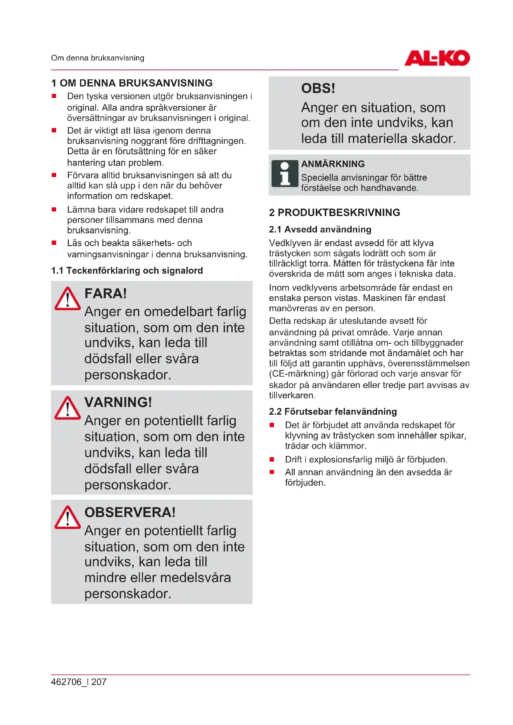 FARA! Anger en omedelbart farlig situation, som om den inte undviks, kan leda till dödsfall eller svåra personskador. VARNING! Anger en potentiellt farlig situation, som om den inte undviks, kan leda till dödsfall eller svåra personskador. OBSERVERA! Anger en potentiellt farlig situation, som om den inte undviks, kan leda till mindre eller medelsvåra personskador. OBS! Anger en situation, som om den inte undviks, kan leda till materiella skador. ANMÄRKNING Speciella anvisningar för bättre förståelse och handhavande. 2 PRODUKTBESKRIVNING