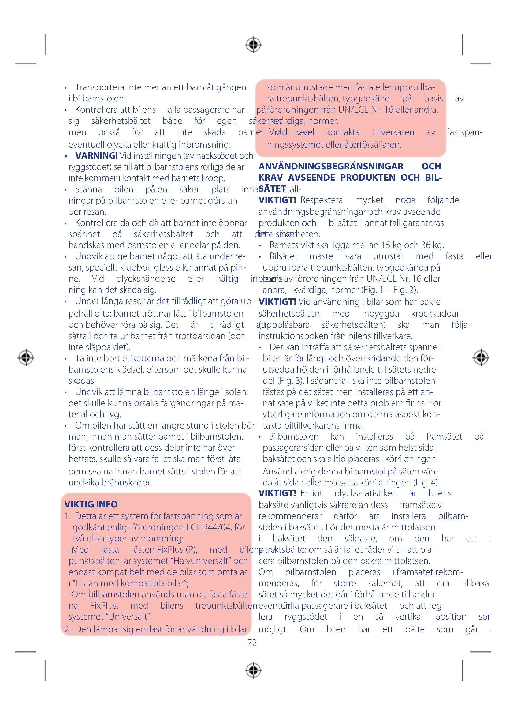 - Ombilenharståttenlängrestundistolenbör man,innanmansätterbarnetibilbarnstolen, förstkontrolleraattdessdelarinteharöver- hettats,skullesåvarafalletskamanförstlåta demsvalnainnanbarnetsättsistolenföratt undvikabrännskador. VIKTIG INFO 1.Dettaärettsystemförfastspänningsomär godkäntenligtförordningenECER44/04,för tvåolikatyperavmontering: -Med fasta fästenFixPlus(P), med bilenstre- punktsbälten,ärsystemet“Halvuniversalt”och endastkompatibeltmeddebilarsomomtalas i“Listanmedkompatiblabilar”; -Ombilbarnstolenanvändsutandefastafäste- na FixPlus, med bilens trepunktsbälten , är systemet“Universalt”. 2.Denlämparsigendastföranvändningibilar somärutrustademedfastaellerupprullba- ratrepunktsbälten,typgodkänd på basis av förordningenfrånUN/ECENr.16ellerandra, likvärdiga,normer. 3.Vid tvivel kontakta tillverkaren av fastspän- ningssystemetelleråterförsäljaren.
