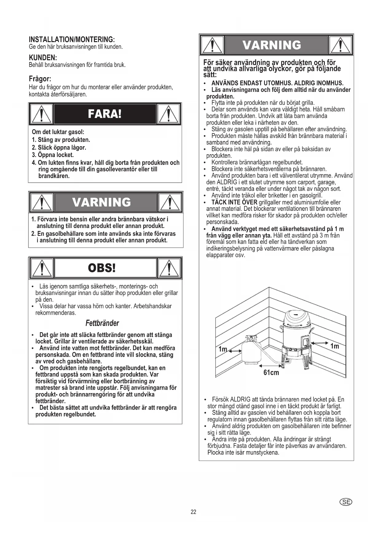 HitteschildBedieningspaneelBranderslangVerwijder Schroeven22 INSTALLATION/MONTERING: Ge den här bruksanvisningen till kunden. KUNDEN: Behåll bruksanvisningen för framtida bruk. Frågor: Har du frågor om hur du monterar eller använder produkten, kontakta återförsäljaren. VARNING 1. Förvara inte bensin eller andra brännbara vätskor i anslutning till denna produkt eller annan produkt.2. En gasolbehållare som inte används ska inte förvaras i anslutning till denna produkt eller annan produkt.Om det luktar gasol:1. Stäng av produkten.2. Släck öppna lågor.3. Öppna locket.4. Om lukten finns kvar, håll dig borta från produkten och ring omgående till din gasolleverantör eller till brandkåren. FARA! OBS! Ÿ Läs igenom samtliga säkerhets-, monterings- och bruksanvisningar innan du sätter ihop produkten eller grillar på den. Ÿ Vissa delar har vassa hörn och kanter. Arbetshandskar rekommenderas. Fettbränder Ÿ Det går inte att släcka fettbränder genom att stänga locket. Grillar är ventilerade av säkerhetsskäl.Ÿ Använd inte vatten mot fettbränder. Det kan medföra personskada. Om en fettbrand inte vill slockna, stäng av vred och gasbehållare.Ÿ Om produkten inte rengjorts regelbundet, kan en fettbrand uppstå som kan skada produkten. Var försiktig vid förvärmning eller bortbränning av matrester så brand inte uppstår. Följ anvisningarna för produkt- och brännarrengöring för att undvika fettbränder.Ÿ Det bästa sättet att undvika fettbränder är att rengöra produkten regelbundet. VARNING Ÿ ANVÄNDS ENDAST UTOMHUS. ALDRIG INOMHUS.Ÿ Läs anvisningarna och följ dem alltid när du använder produkten.Ÿ Flytta inte på produkten när du börjat grilla.Ÿ Delar som används kan vara väldigt heta. Håll småbarn borta från produkten. Undvik att låta barn använda produkten eller leka i närheten av den.Ÿ Stäng av gasolen upptill på behållaren efter användning.Ÿ Produkten måste hållas avskild från brännbara material i samband med användning.Ÿ Blockera inte hål på sidan av eller på baksidan av produkten.Ÿ Kontrollera brännarlågan regelbundet.Ÿ Blockera inte säkerhetsventilerna på brännaren.Ÿ Använd produkten bara i ett välventilerat utrymme. Använd den ALDRIG i ett slutet utrymme som carport, garage, entré, täckt veranda eller under något tak av någon sort.Ÿ Använd inte träkol eller briketter i en gasolgrill.Ÿ TÄCK INTE ÖVER grillgaller med aluminiumfolie eller annat material. Det blockerar ventilationen till brännaren villket kan medföra risker för skador på produkten och/eller personskada. Ÿ Använd verktyget med ett säkerhetsavstånd på 1 m från vägg eller annan yta. Håll ett avstånd på 3 m från föremål som kan fatta eld eller ha tändverkan som indikeringsbelysning på vattenvärmare eller påslagna elapparater osv. För säker användning av produkten och för att undvika allvarliga olyckor, gör på följande sätt: Ÿ Försök ALDRIG att tända brännaren med locket på. En stor mängd otänd gasol inne i en täckt produkt är farligt.Ÿ Stäng alltid av gasolen vid behållaren och koppla bort regulatorn innan gasolbehållaren flyttas från sitt rätta läge.Ÿ Använd aldrig produkten om gasolbehållaren inte befinner sig i sitt rätta läge.Ÿ Ändra inte på produkten. Alla ändringar är strängt förbjudna. Fasta detaljer får inte påverkas av användaren. Plocka inte isär munstyckena.