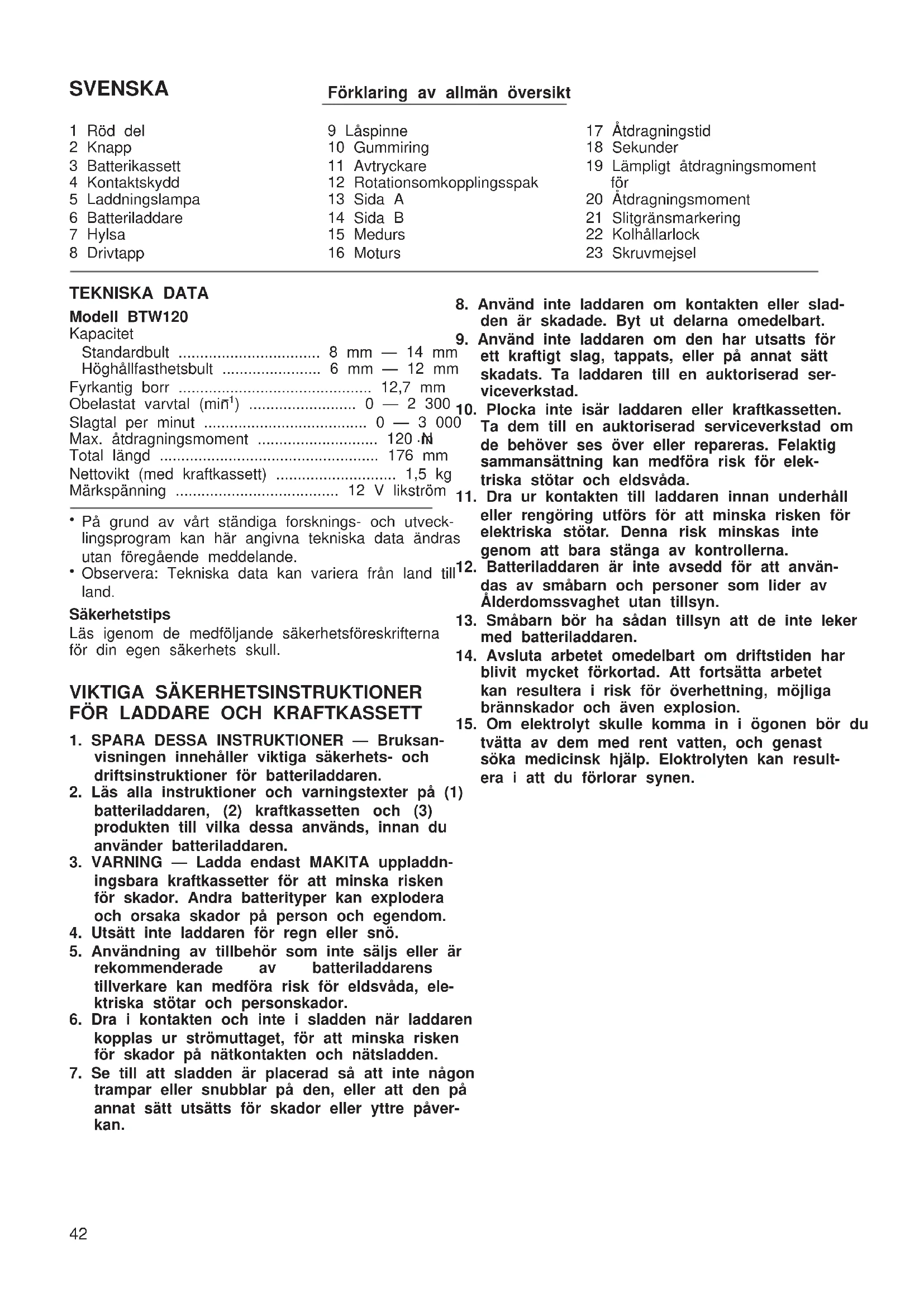 maskinen hålls och maskinhastigheten. VARNING: Om maskinen används oavbrutet ända tills batterikas- setten laddats ur så låt maskinen vila i 15 minuter innan du fortsätter med ett fullt uppladdat batteri. UNDERHÅLL FÖRSIKTIGHET: Tillse alltid att maskinen är frånkopplad och att bat- teriet tagits ur maskinen innan du utför arbete på denna. Utbyte av kolborstar (Fig. 9 och 10) Byt ut kolborstarna när de slitits ner till slitagegräns- markeringen. Byt alltid ut båda kolborstarna samtidigt. För att bibehålla produktens säkerhet och tillförl- itlighet, bör alltid reparationer, underhållsservice och justeringar utföras av auktoriserad Makita service- verkstad. BTW120 (Sw) (’100. 11. 28) 45NORSK Forklaring til generell oversikt 1 Rød del 2 Knapp 3 Batteri 4 Terminaldeksel 5 Ladelamper 6 Batterilader 7 Muffe 8 Anbolt 9 Stift 10 O-ring 11 Startbryter 12 Reversbryter 13 A-side 14 B-side 15 Medurs 16 Moturs 17 Tiltrekningstid 18 Sekunder 19 Korrekt tiltrekningsmoment for 20 Tiltrekningsmoment 21 Slitasjegrense 22 Børsteholderhette 23 Skrutrekker SPESIFIKASJONER Modell BTW120 Kapasiteter Standard bolt ................................ 8 mm — 14 mm Høystrekkbolt ................................ 6 mm — 12 mm Firkantdrev .................................................. 12,7 mm Tomgangshastighet (min