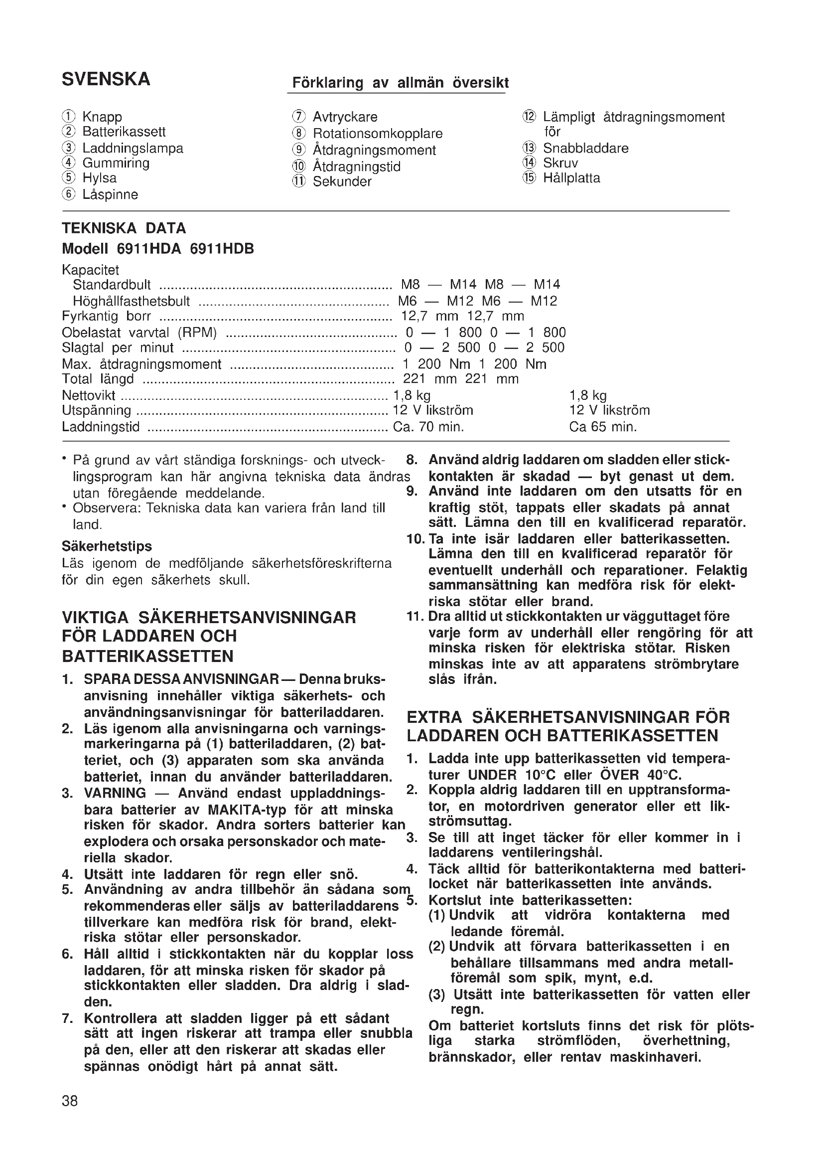 maskinen hålls och maskinhastigheten. Åtdragningskapacitet I nedanstående referenstabell visas maskinens ungefärliga åtdragningskapacitet per batteriladdning. Kapa- citeten kan variera under olika förhållanden. Skruvtyp Åtdragningstid Antal åtdragningar 6911HDA 6911HDB Höghållfasthetsbult M12 3 sekunder Ca. 90 Ca. 100 VARNING: Om maskinen används oavbrutet ända tills batterikassetten laddats ur så låt maskinen vila i 15 minuter innan du fortsätter med ett fullt uppladdat batteri. Montering av hållplattan (Fig. 9) Montera alltid hållplattan när batterikassetterna 1200, 1202 eller 1202A används. Montera hållplattan på verktyget med hjälp av den medföljande skruven på det sätt som visas i figuren. UNDERHÅLL FÖRSIKTIGHET: Tillse alltid att maskinen är frånkopplad och att bat- teriet tagits ur maskinen innan Du utför arbete på denna. För att bibehålla produktens säkerhet och tillförl- itlighet, bör alltid reparationer, underhållsservice och justeringar utföras av auktoriserad Makita service- verkstad. GARANTI Vi ger garantier för MAKITA’s maskiner enligt lagstad- gade föreskrifter i olika länder. Skador och felak- tigheter som kan hänföras till normal förslitning, över- belastning och felaktig hantering omfattas ej av denna garanti. Vid reklamation skall du sända in hela maski- nen, icke isärtagen, tillsammans med det bifogade GARANTIBEVISET (och kvitto/faktura), till din åter- försäljare eller till en auktoriserad MAKITA service- verkstad. 6911HDA/6911HDWA (Sw) (’98. 12. 18) 41NORSK Forklaring til generell oversikt 1 Knapp 2 Batteri 3 Ladelampe 4 O-ring 5 Muffe 6 Stift 7 Startbryter 8 Reversbryter 9 Tiltrekningsmoment 0 Tiltrekningstid q Sekunder w Korrekt tiltrekningsmoment for e Hurtiglader r Skrue t Stilleplate SPESIFIKASJONER Modell 6911HDA 6911HDB Kapasiteter Standard bolt ........................................................... M8 — M14 M8 — M14 Høystrekkbolt ........................................................... M6 — M12 M6 — M12 Firkantdrev .................................................................. 12,7 mm 12,7 mm Tomgangshastighet (turtall) ........................................ 0 — 1 800 0 — 1 800 Slag per minutt ........................................................... 0 — 2 500 0 — 2 500 Maks. tiltrekningsmoment ........................................... 1 200 kg