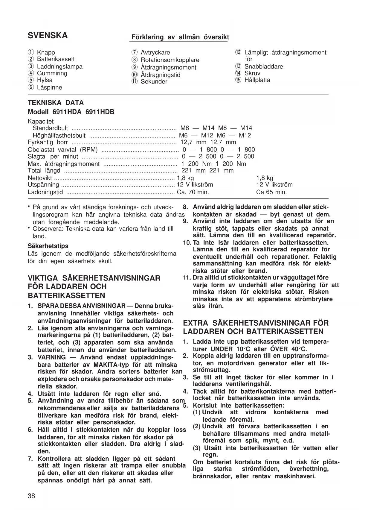 maskinen hålls och maskinhastigheten. Åtdragningskapacitet I nedanstående referenstabell visas maskinens ungefärliga åtdragningskapacitet per batteriladdning. Kapa- citeten kan variera under olika förhållanden. Skruvtyp Åtdragningstid Antal åtdragningar 6911HDA 6911HDB Höghållfasthetsbult M12 3 sekunder Ca. 90 Ca. 100 VARNING: Om maskinen används oavbrutet ända tills batterikassetten laddats ur så låt maskinen vila i 15 minuter innan du fortsätter med ett fullt uppladdat batteri. Montering av hållplattan (Fig. 9) Montera alltid hållplattan när batterikassetterna 1200, 1202 eller 1202A används. Montera hållplattan på verktyget med hjälp av den medföljande skruven på det sätt som visas i figuren. UNDERHÅLL FÖRSIKTIGHET: Tillse alltid att maskinen är frånkopplad och att bat- teriet tagits ur maskinen innan Du utför arbete på denna. För att bibehålla produktens säkerhet och tillförl- itlighet, bör alltid reparationer, underhållsservice och justeringar utföras av auktoriserad Makita service- verkstad. GARANTI Vi ger garantier för MAKITA’s maskiner enligt lagstad- gade föreskrifter i olika länder. Skador och felak- tigheter som kan hänföras till normal förslitning, över- belastning och felaktig hantering omfattas ej av denna garanti. Vid reklamation skall du sända in hela maski- nen, icke isärtagen, tillsammans med det bifogade GARANTIBEVISET (och kvitto/faktura), till din åter- försäljare eller till en auktoriserad MAKITA service- verkstad. 6911HDA/6911HDWA (Sw) (’98. 12. 18) 41NORSK Forklaring til generell oversikt 1 Knapp 2 Batteri 3 Ladelampe 4 O-ring 5 Muffe 6 Stift 7 Startbryter 8 Reversbryter 9 Tiltrekningsmoment 0 Tiltrekningstid q Sekunder w Korrekt tiltrekningsmoment for e Hurtiglader r Skrue t Stilleplate SPESIFIKASJONER Modell 6911HDA 6911HDB Kapasiteter Standard bolt ........................................................... M8 — M14 M8 — M14 Høystrekkbolt ........................................................... M6 — M12 M6 — M12 Firkantdrev .................................................................. 12,7 mm 12,7 mm Tomgangshastighet (turtall) ........................................ 0 — 1 800 0 — 1 800 Slag per minutt ........................................................... 0 — 2 500 0 — 2 500 Maks. tiltrekningsmoment ........................................... 1 200 kg