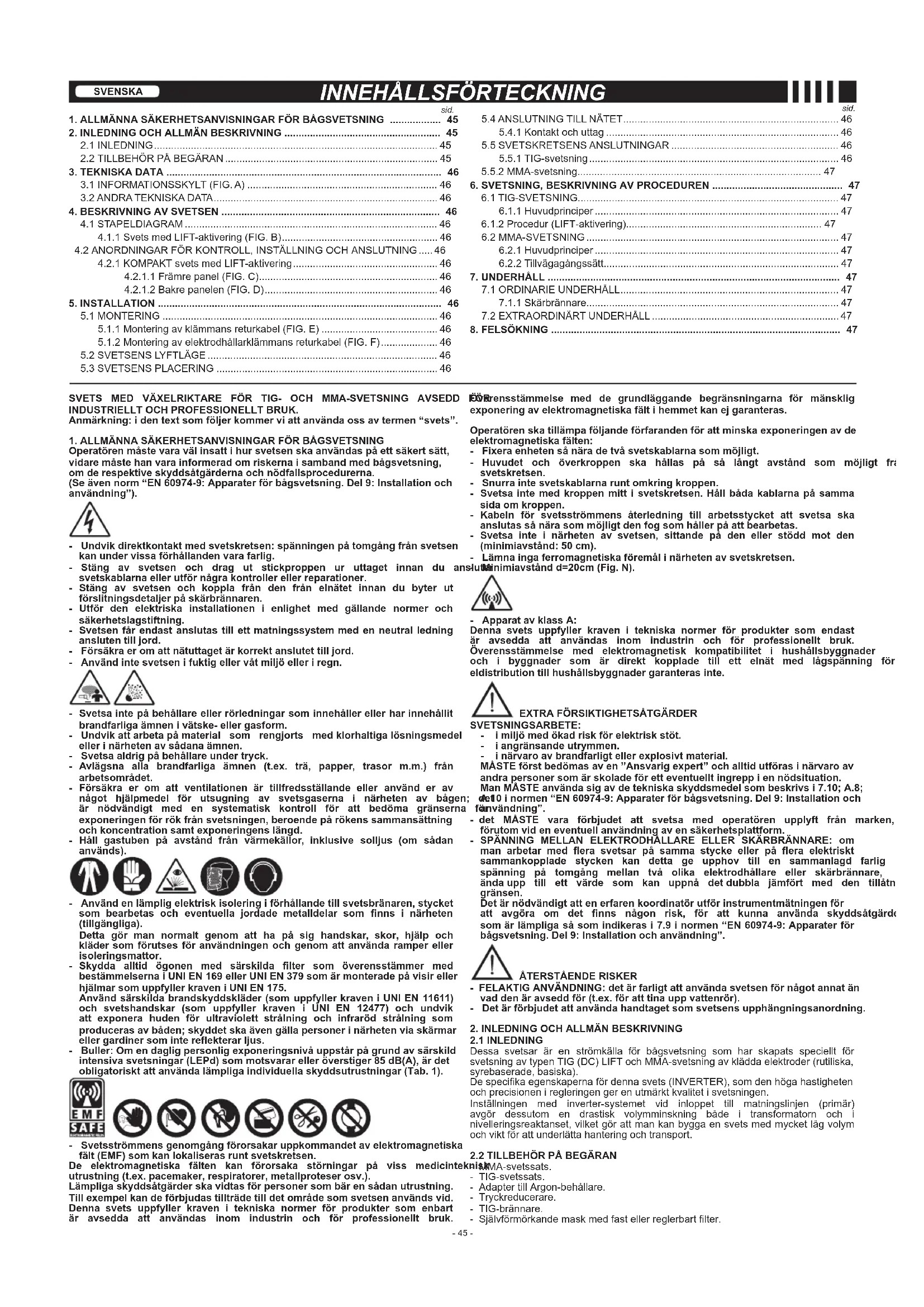 SVETSNINGSARBETE: - imiljömedökadriskförelektriskstöt. - iangränsandeutrymmen. - inärvaroavbrandfarligtellerexplosivtmaterial. MÅSTEförstbedömasaven”Ansvarigexpert”ochalltidutförasinärvaroav andrapersonersomärskoladeföretteventuelltingreppiennödsituation. ManMÅSTEanvändasigavdetekniskaskyddsmedelsombeskrivsi7.10;A.8; A.10inormen“EN60974-9:Apparaterförbågsvetsning.Del9:Installationoch användning”. -det MÅSTE vara förbjudet att svetsa med operatören upplyft från marken, förutomvideneventuellanvändningavensäkerhetsplattform. -SPÄNNING MELLAN ELEKTRODHÅLLARE ELLER SKÄRBRÄNNARE: om man arbetar med era svetsar på samma stycke eller på era elektriskt sammankopplade stycken kan detta ge upphov till en sammanlagd farlig spänning på tomgång mellan två olika elektrodhållare eller skärbrännare, ändaupp till ett värde som kan uppnå detdubbla jämfört med den tillåtna gränsen. Detärnödvändigtattenerfarenkoordinatörutförinstrumentmätningenför att avgöra om det nns någon risk, för att kunna använda skyddsåtgärder somärlämpligasåsomindikerasi7.9inormen“EN60974-9:Apparaterför bågsvetsning.Del9:Installationochanvändning”. ÅTERSTÅENDERISKER -FELAKTIGANVÄNDNING:detärfarligtattanvändasvetsenförnågotannatän vaddenäravseddför(t.ex.föratttinauppvattenrör). - Detärförbjudetattanvändahandtagetsomsvetsensupphängningsanordning. 2.INLEDNINGOCHALLMÄNBESKRIVNING 2.1INLEDNING Dessa svetsar är en strömkälla för bågsvetsning som har skapats speciellt för svetsning av typen TIG (DC) LIFT och MMA-svetsning av klädda elektroder (rutiliska, syrebaserade, basiska). De specika egenskaperna för denna svets (INVERTER), som den höga hastigheten och precisionen i regleringen ger en utmärkt kvalitet i svetsningen. Inställningen med inverter-systemet vid inloppet till matningslinjen (primär) avgör dessutom en drastisk volymminskning både i transformatorn och i nivelleringsreaktanset, vilket gör att man kan bygga en svets med mycket låg volym och vikt för att underlätta hantering och transport.