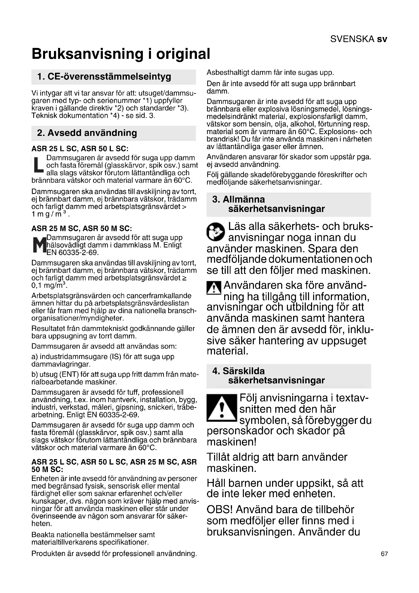 Bruksanvisning i original Vi intygar att vi tar ansvar för att: utsuget/dammsu- garen med typ- och serienummer *1) uppfyller kraven i gällande direktiv *2) och standarder *3). Teknisk dokumentation *4) - se sid. 3. ASR 25 L SC, ASR 50 L SC: Dammsugaren är avsedd för suga upp damm och fasta föremål (glasskärvor, spik osv.) samt alla slags vätskor förutom lättantändliga och brännbara vätskor och material varmare än 60°C. Dammsugaren ska användas till avskiljning av torrt, ej brännbart damm, ej brännbara vätskor, trädamm och farligt damm med arbetsplatsgränsvärdet > 1mg/m³. ASR 25 M SC, ASR 50 M SC: Dammsugaren är avsedd för att suga upp hälsovådligt damm i dammklass M. Enligt EN 60335-2-69. Dammsugaren ska användas till avskiljning av torrt, ej brännbart damm, ej brännbara vätskor, trädamm och farligt damm med arbetsplatsgränsvärdet ≥ 0,1 mg/m³. Arbetsplatsgränsvärden och cancerframkallande ämnen hittar du på arbetsplatsgränsvärdeslistan eller får fram med hjälp av dina nationella bransch- organisationer/myndigheter. Resultatet från dammtekniskt godkännande gäller bara uppsugning av torrt damm. Dammsugaren är avsedd att användas som: a) industridammsugare (IS) för att suga upp dammavlagringar. b) utsug (ENT) för att suga upp fritt damm från mate- rialbearbetande maskiner. Dammsugaren är avsedd för tuff, professionell användning, t.ex. inom hantverk, installation, bygg, industri, verkstad, måleri, gipsning, snickeri, träbe- arbetning. Enligt EN 60335-2-69. Dammsugaren är avsedd för suga upp damm och fasta föremål (glasskärvor, spik osv.) samt alla slags vätskor förutom lättantändliga och brännbara vätskor och material varmare än 60°C. ASR 25 L SC, ASR 50 L SC, ASR 25 M SC, ASR 50 M SC: Enheten är inte avsedd för användning av personer med begränsad fysisk, sensorisk eller mental färdighet eller som saknar erfarenhet och/eller kunskaper, dvs. någon som kräver hjälp med anvis- ningar för att använda maskinen eller står under överinseende av någon som ansvarar för säker- heten. Beakta nationella bestämmelser samt materialtillverkarens specifikationer. Produkten är avsedd för professionell användning. Asbesthaltigt damm får inte sugas upp. Den är inte avsedd för att suga upp brännbart damm. Dammsugaren är inte avsedd för att suga upp brännbara eller explosiva lösningsmedel, lösnings- medelsindränkt material, explosionsfarligt damm, vätskor som bensin, olja, alkohol, förtunning resp. material som är varmare än 60°C. Explosions- och brandrisk! Du får inte använda maskinen i närheten av lättantändliga gaser eller ämnen. Användaren ansvarar för skador som uppstår pga. ej avsedd användning. Följ gällande skadeförebyggande föreskrifter och medföljande säkerhetsanvisningar. Läs alla säkerhets- och bruks- anvisningar noga innan du använder maskinen. Spara den medföljande dokumentationen och se till att den följer med maskinen. Användaren ska före använd- ning ha tillgång till information, anvisningar och utbildning för att använda maskinen samt hantera de ämnen den är avsedd för, inklu- sive säker hantering av uppsuget material. Följ anvisningarna i textav- snitten med den här symbolen, så förebygger du personskador och skador på maskinen! Tillåt aldrig att barn använder maskinen. Håll barnen under uppsikt, så att de inte leker med enheten. OBS! Använd bara de tillbehör som medföljer eller finns med i bruksanvisningen. Använder du