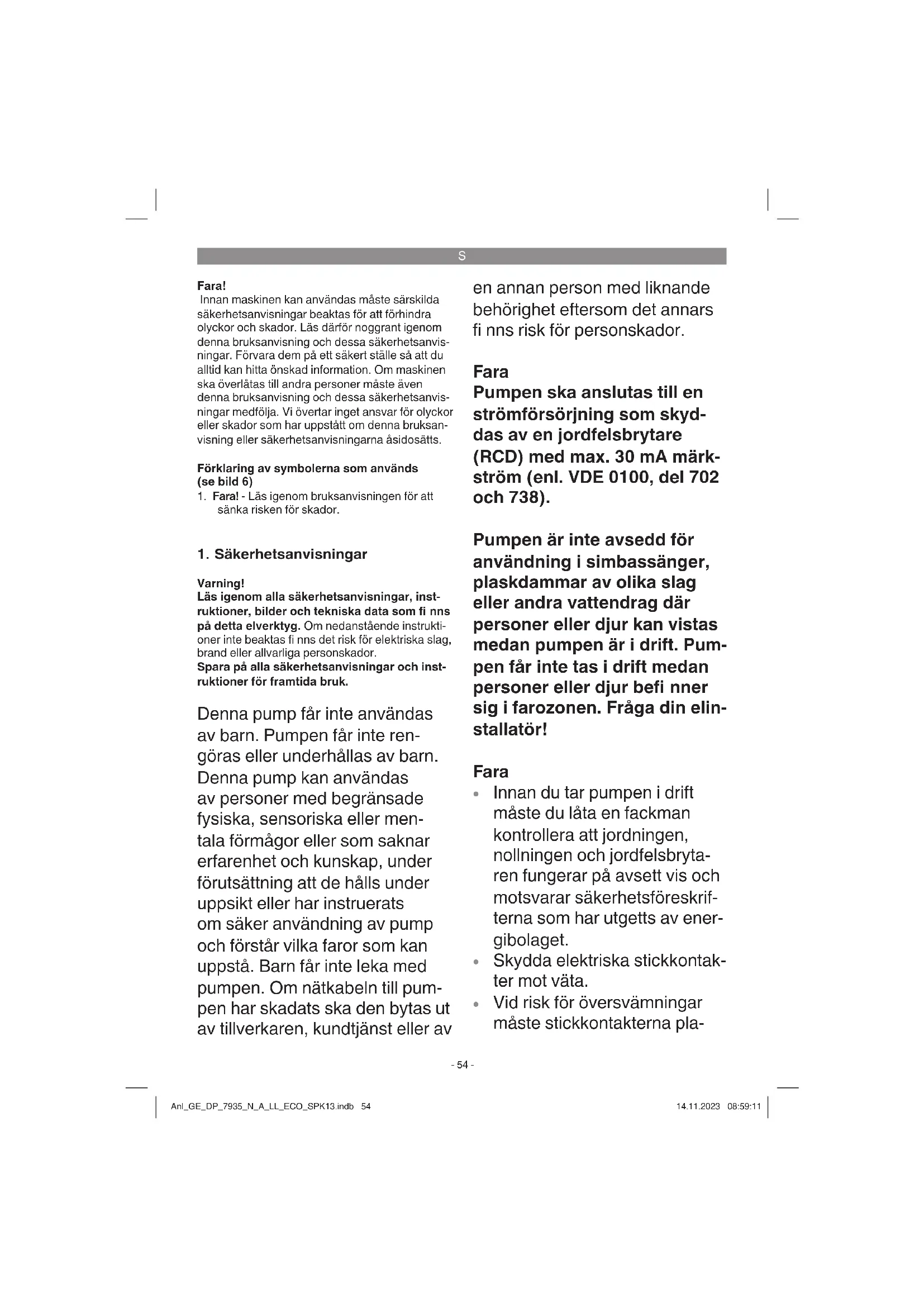 Varning! Läs igenom alla säkerhetsanvisningar, inst- ruktioner, bilder och tekniska data som fi nns på detta elverktyg. Om nedanstående instrukti- oner inte beaktas fi nns det risk för elektriska slag, brand eller allvarliga personskador. Spara på alla säkerhetsanvisningar och inst- ruktioner för framtida bruk. Denna pump får inte användas av barn. Pumpen får inte ren- göras eller underhållas av barn. Denna pump kan användas av personer med begränsade fysiska, sensoriska eller men- tala förmågor eller som saknar erfarenhet och kunskap, under förutsättning att de hålls under uppsikt eller har instruerats om säker användning av pump och förstår vilka faror som kan uppstå. Barn får inte leka med pumpen. Om nätkabeln till pum- pen har skadats ska den bytas ut av tillverkaren, kundtjänst eller av en annan person med liknande behörighet eftersom det annars fi nns risk för personskador. Fara Pumpen ska anslutas till en strömförsörjning som skyd- das av en jordfelsbrytare (RCD) med max. 30 mA märk- ström (enl. VDE 0100, del 702 och 738). Pumpen är inte avsedd för användning i simbassänger, plaskdammar av olika slag eller andra vattendrag där personer eller djur kan vistas medan pumpen är i drift. Pum- pen får inte tas i drift medan personer eller djur befi nner sig i farozonen. Fråga din elin- stallatör! Fara