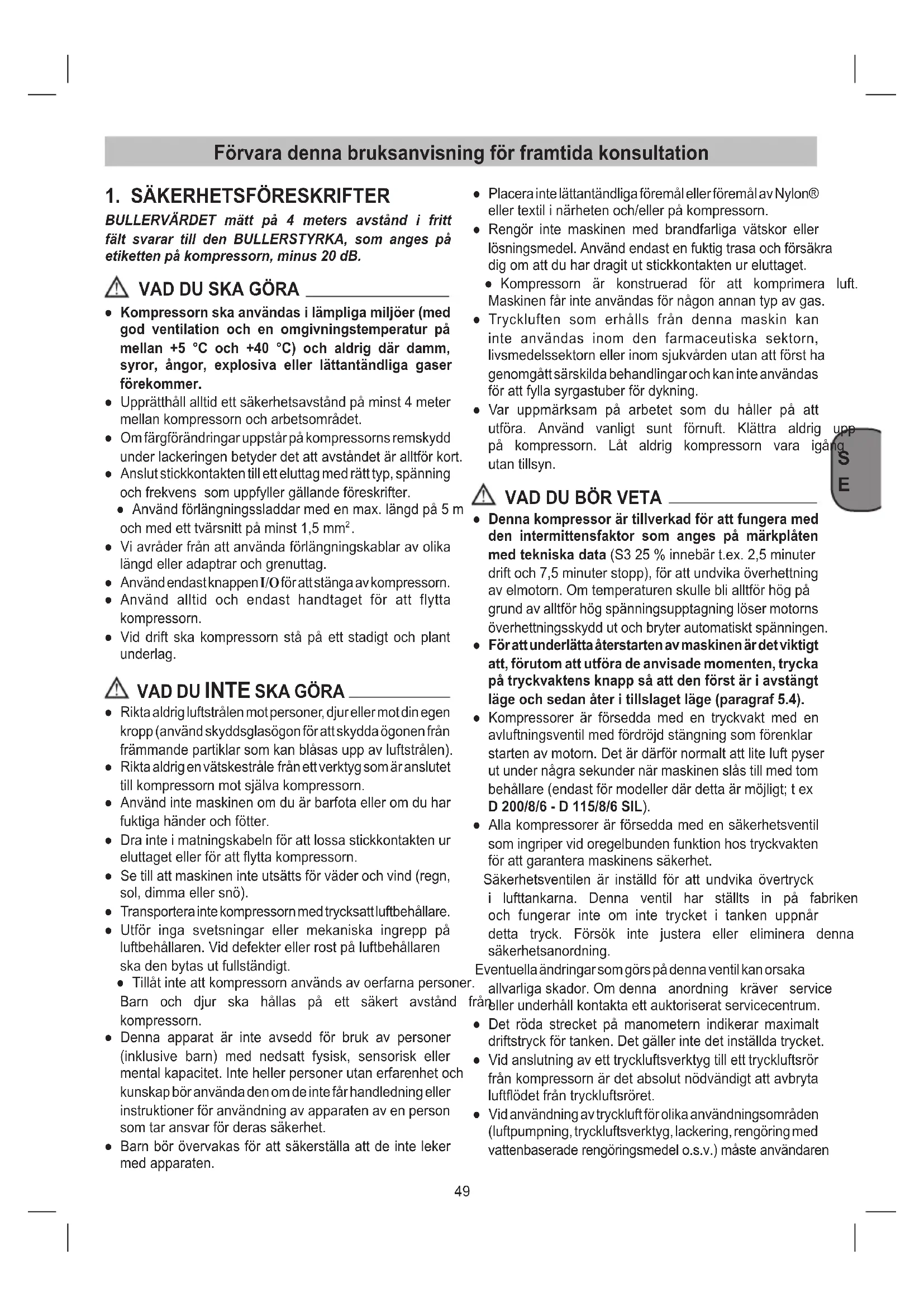 ● Denna kompressor är tillverkad för att fungera med den intermittensfaktor som anges på märkplåten med tekniska data(S325%innebärt.ex.2,5minuter drift och 7,5 minuter stopp), för att undvika överhettning avelmotorn.Omtemperaturenskulleblialltförhögpå grund av alltför hög spänningsupptagning löser motorns överhettningsskyddutochbryterautomatisktspänningen. ● För att underlätta återstarten av maskinen är det viktigt att, förutom att utföra de anvisade momenten, trycka på tryckvaktens knapp så att den först är i avstängt läge och sedan åter i tillslaget läge (paragraf 5.4). ● Kompressorer är försedda med en tryckvakt med en avluftningsventilmedfördröjdstängningsomförenklar startenavmotorn.Detärdärförnormaltattliteluftpyser ut under några sekunder när maskinen slås till med tom behållare(endastförmodellerdärdettaärmöjligt;tex D 200/8/6 - D 115/8/6 SIL). ● Alla kompressorer är försedda med en säkerhetsventil som ingriper vid oregelbunden funktion hos tryckvakten förattgaranteramaskinenssäkerhet. Säkerhetsventilen är inställd för att undvika övertryck i lufttankarna. Denna ventil har ställts in på fabriken och fungerar inte om inte trycket i tanken uppnår detta tryck. Försök inte justera eller eliminera denna säkerhetsanordning. Eventuella ändringar som görs på denna ventil kan orsaka allvarligaskador.Omdenna anordning kräver service ellerunderhållkontaktaettauktoriseratservicecentrum. ● Det röda strecket på manometern indikerar maximalt driftstryckförtanken.Detgällerintedetinställdatrycket. ● Vid anslutning av ett tryckluftsverktyg till ett tryckluftsrör från kompressorn är det absolut nödvändigt att avbryta luftödetfråntryckluftsröret. ● Vid användning av tryckluft för olika användningsområden (luftpumpning, tryckluftsverktyg, lackering, rengöring med vattenbaseraderengöringsmedelo.s.v.)måsteanvändaren Förvara denna bruksanvisning för framtida konsultation50