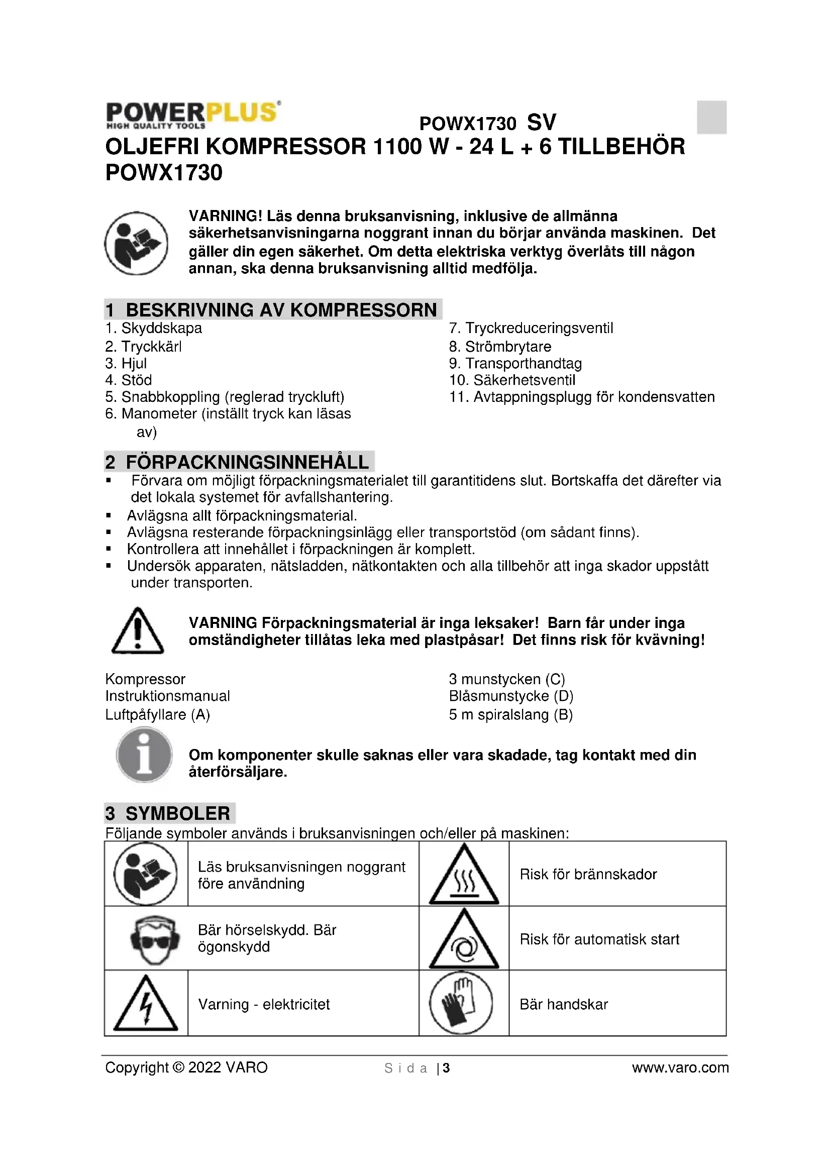 Förvara om möjligt förpackningsmaterialet till garantitidens slut. Bortskaffa det därefter via det lokala systemet för avfallshantering. Avlägsna allt förpackningsmaterial. Avlägsna resterande förpackningsinlägg eller transportstöd (om sådant finns). Kontrollera att innehållet i förpackningen är komplett. Undersök apparaten, nätsladden, nätkontakten och alla tillbehör att inga skador uppstått under transporten. VARNING Förpackningsmaterial är inga leksaker! Barn får under inga omständigheter tillåtas leka med plastpåsar! Det finns risk för kvävning! Kompressor Instruktionsmanual Luftpåfyllare (A) 3 munstycken (C) Blåsmunstycke (D) 5 m spiralslang (B) Om komponenter skulle saknas eller vara skadade, tag kontakt med din återförsäljare. 3 SYMBOLER Följande symboler används i bruksanvisningen och/eller på maskinen: Läs bruksanvisningen noggrant före användning Risk för brännskador Bär hörselskydd. Bär ögonskydd Risk för automatisk start Varning - elektricitet Bär handskarPOWX1730 SV Copyright © 2022 VARO S i d a | 4 www.varo.com
