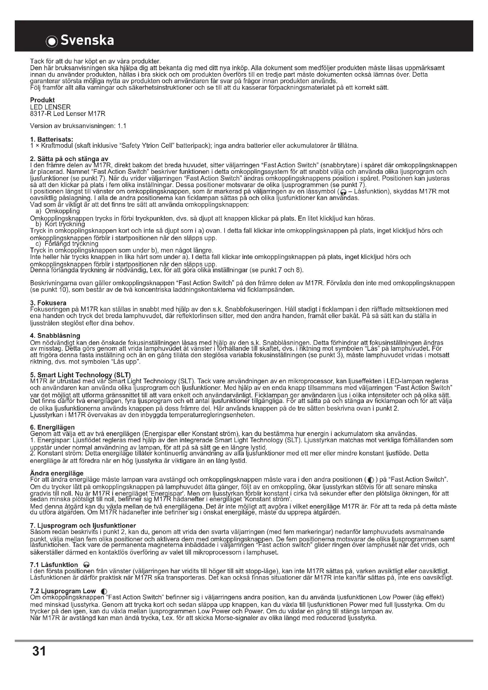 Av sakerhetsskä och godkannande (CE), far inteprodukten modifieras och/eller andras. Produkten far endast anvandas som ficklampa. Om M17R anvands for andra andamal, erer anvands felaktigt, kan den skadas och en problemfri anvanding kan inte langre garanteras (risk for brand, kortslutng, elstot etc.). Det finns da risk for skada pa person ergendom och dessutom upphor tilverkarens garanti att galla.