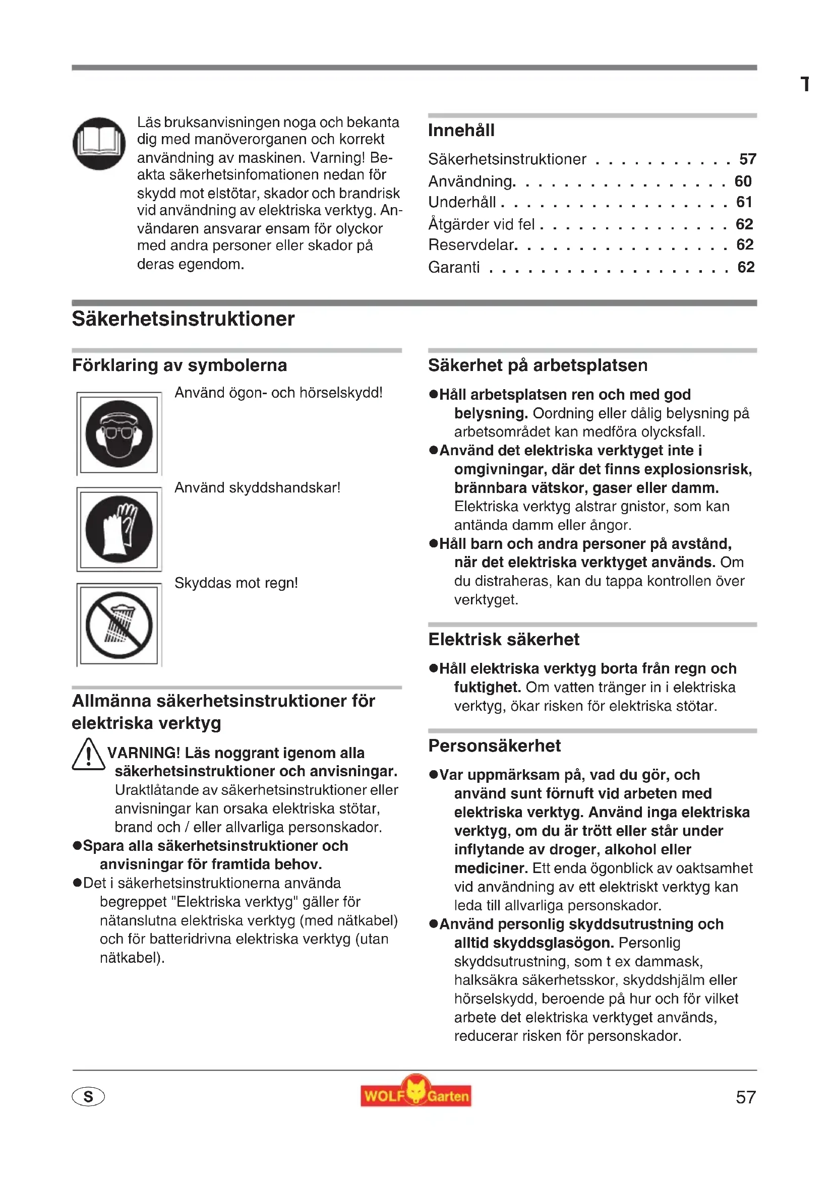 - STack för att du har köpt en WOLF-Garten produkt Innehåll Säkerhetsinstruktioner p. 57