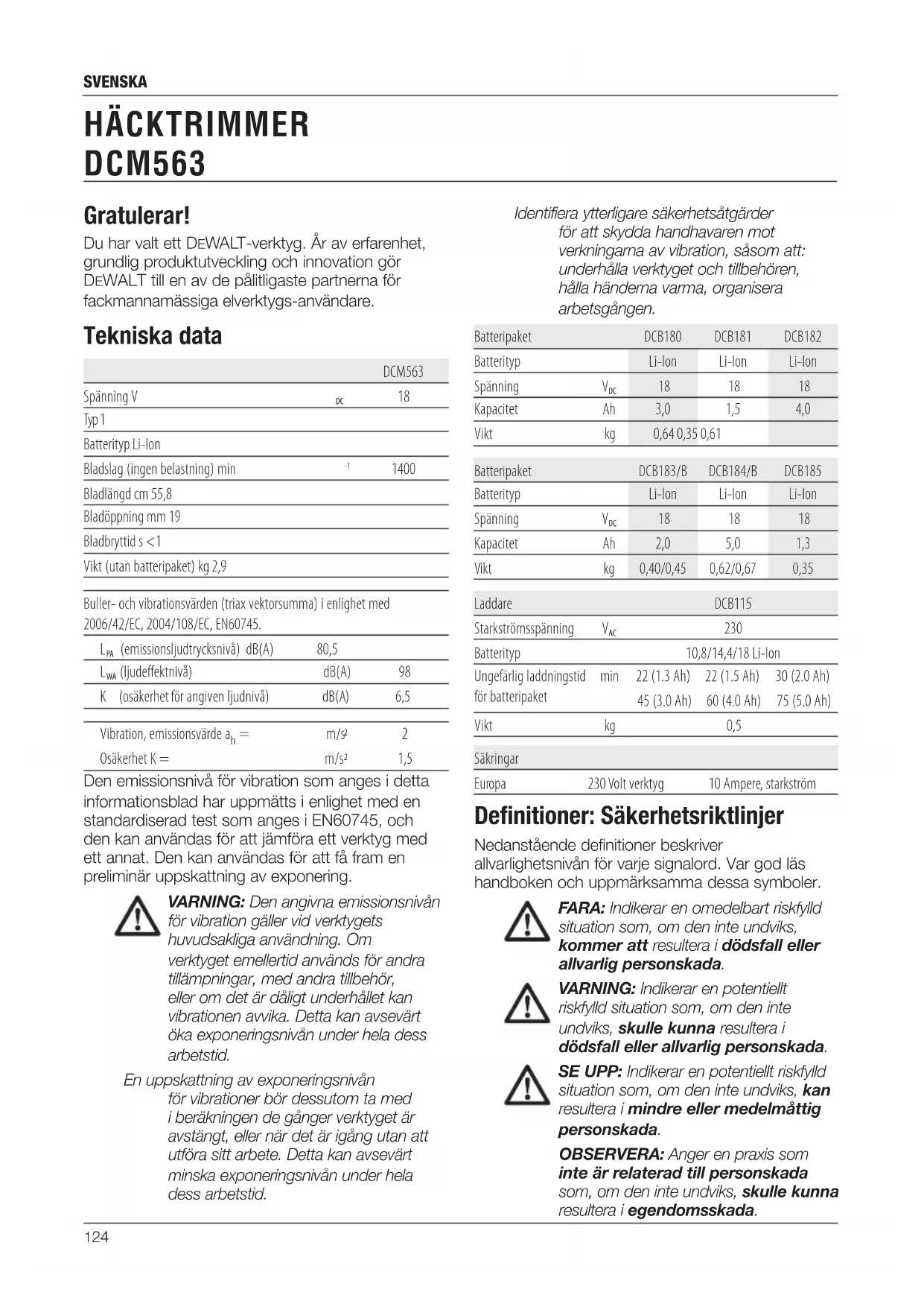 Batterityp 10,8/14,4/18 Li-Ion Ungefärlig laddningstid för batteripaket min 22 (1.3 Ah) 22 (1.5 Ah) 30 (2.0 Ah) 45 (3.0 Ah) 60 (4.0 Ah) 75 (5.0 Ah) Vikt kg 0,5 Säkringar Europa 230 Volt verktyg 10 Ampere, starkström Definitioner: Säkerhetsriktlinjer Nedanstående definitioner beskriver allvarlighetsnivån för varje signalord. Var god läs handboken och uppmärksamma dessa symboler. FARA: Indikerar en omedelbart riskfylld situation som, om den inte undviks, kommer att resultera i dödsfall eller allvarlig personskada. VARNING: Indikerar en potentiellt riskfylld situation som, om den inte undviks, skulle kunna resultera i dödsfall eller allvarlig personskada. SE UPP: Indikerar en potentiellt riskfylld situation som, om den inte undviks, kan resultera i mindre eller medelmåttig personskada. OBSERVERA: Anger en praxis som inte är relaterad till personskada som, om den inte undviks, skulle kunna resultera i egendomsskada.125 svenska Anger risk för elektrisk stöt. Anger risk för eldsvåda. EC-Följsamhetsdeklaration MASKINDIREKTIV DIREKTIV OM UTOMHUSBULLER HÄCKTRIMMER DCM563 DeWALT deklarerar att produkterna som beskrivs under Tekniska data är utformade i överensstämmelse med: 2006/42/EC, EN 60745-1:2009 + A11:2010; EN 60745-2-15:2009 + A1:2010 2000/14/EC, Blåsare, bilaga VI DEKRA Certification B.V., Utrechtseweg 310, 6802 ED Arnhem, Nederländerna Anmält organ, ID-nr.: 0344 Nivå på ljudeffekt enligt 2000/14/EC (Artikel 13, bilaga III):