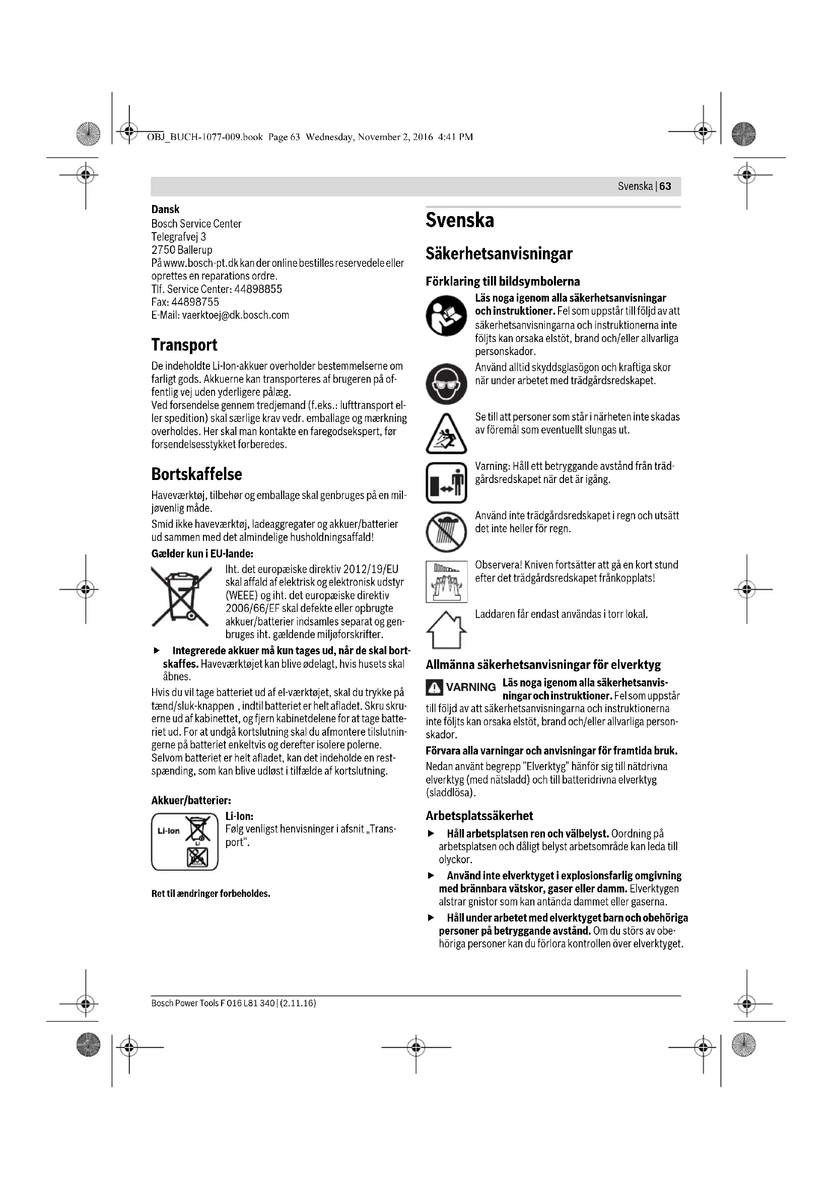 LED Kapacitet Konstant lys grøn 35 – 100% Blinklys grøn 15 – 35% Blinklys rød 5 – 15% Konstant lys rød 0 – 5% Symptom Mulig årsag Afhjælpning For lille snitvarighed pr. akku-opladning Akkuen er ved at være brugt op Kontakt serviceforhandleren Akku-kontrollampe lyser hele tiden Opladning er ikke mulig Akku defekt Kontakt serviceforhandleren OBJ_BUCH-1077-009.book Page 62 Wednesday, November 2, 2016 4:41 PMSvenska | 63 Bosch Power Tools F 016 L81 340 | (2.11.16) Dansk Bosch Service Center Telegrafvej 3 2750 Ballerup På www.bosch-pt.dk kan der online bestilles reservedele eller oprettes en reparations ordre. Tlf. Service Center: 44898855 Fax: 44898755 E-Mail: vaerktoej@dk.bosch.com Transport De indeholdte Li-Ion-akkuer overholder bestemmelserne om farligt gods. Akkuerne kan transporteres af brugeren på of- fentlig vej uden yderligere pålæg. Ved forsendelse gennem tredjemand (f.eks.: lufttransport el- ler spedition) skal særlige krav vedr. emballage og mærkning overholdes. Her skal man kontakte en faregodsekspert, før forsendelsesstykket forberedes. Bortskaffelse Haveværktøj, tilbehør og emballage skal genbruges på en mil- jøvenlig måde. Smid ikke haveværktøj, ladeaggregater og akkuer/batterier ud sammen med det almindelige husholdningsaffald! Gælder kun i EU-lande: Iht. det europæiske direktiv 2012/19/EU skal affald af elektrisk og elektronisk udstyr (WEEE) og iht. det europæiske direktiv 2006/66/EF skal defekte eller opbrugte akkuer/batterier indsamles separat og gen- bruges iht. gældende miljøforskrifter. Integrerede akkuer må kun tages ud, når de skal bort- skaffes. Haveværktøjet kan blive ødelagt, hvis husets skal åbnes. Hvis du vil tage batteriet ud af el-værktøjet, skal du trykke på tænd/sluk-knappen , indtil batteriet er helt afladet. Skru skru- erne ud af kabinettet, og fjern kabinetdelene for at tage batte- riet ud. For at undgå kortslutning skal du afmontere tilslutnin- gerne på batteriet enkeltvis og derefter isolere polerne. Selvom batteriet er helt afladet, kan det indeholde en rest- spænding, som kan blive udløst i tilfælde af kortslutning. Akkuer/batterier: Li-Ion: Følg venligst henvisninger i afsnit „Trans- port“. Ret til ændringer forbeholdes. Svenska Säkerhetsanvisningar Förklaring till bildsymbolerna Läs noga igenom alla säkerhetsanvisningar och instruktioner. Fel som uppstår till följd av att säkerhetsanvisningarna och instruktionerna inte följts kan orsaka elstöt, brand och/eller allvarliga personskador. Använd alltid skyddsglasögon och kraftiga skor när under arbetet med trädgårdsredskapet. Se till att personer som står i närheten inte skadas av föremål som eventuellt slungas ut. Varning: Håll ett betryggande avstånd från träd- gårdsredskapet när det är igång. Använd inte trädgårdsredskapet i regn och utsätt det inte heller för regn. Observera! Kniven fortsätter att gå en kort stund efter det trädgårdsredskapet frånkopplats! Laddaren får endast användas i torr lokal. Allmänna säkerhetsanvisningar för elverktyg Läs noga igenom alla säkerhetsanvis- ningar och instruktioner. Fel som uppstår till följd av att säkerhetsanvisningarna och instruktionerna inte följts kan orsaka elstöt, brand och/eller allvarliga person- skador. Förvara alla varningar och anvisningar för framtida bruk. Nedan använt begrepp ”Elverktyg” hänför sig till nätdrivna elverktyg (med nätsladd) och till batteridrivna elverktyg (sladdlösa). Arbetsplatssäkerhet Håll arbetsplatsen ren och välbelyst. Oordning på arbetsplatsen och dåligt belyst arbetsområde kan leda till olyckor. Använd inte elverktyget i explosionsfarlig omgivning med brännbara vätskor, gaser eller damm. Elverktygen alstrar gnistor som kan antända dammet eller gaserna. Håll under arbetet med elverktyget barn och obehöriga personer på betryggande avstånd. Om du störs av obe- höriga personer kan du förlora kontrollen över elverktyget. VARNING OBJ_BUCH-1077-009.book Page 63 Wednesday, November 2, 2016 4:41 PM64 | Svenska F 016 L81 340 | (2.11.16) Bosch Power Tools Elektrisk säkerhet Elverktygets stickpropp måste passa till vägguttaget. Stickproppen får absolut inte förändras. Använd inte adapterkontakter tillsammans med skyddsjordade elverktyg. Oförändrade stickproppar och passande vägg- uttag reducerar risken för elstöt. Undvik kroppskontakt med jordade ytor som t. ex. rör, värmeelement, spisar och kylskåp. Det finns en större risk för elstöt om din kropp är jordad. Skydda elverktyget mot regn och väta. Tränger vatten in i ett elverktyg ökar risken för elstöt. Missbruka inte nätsladden och använd den inte för att bära eller hänga upp elverktyget och inte heller för att dra stickproppen ur vägguttaget. Håll nätsladden på avstånd från värme, olja, skarpa kanter och rörliga maskindelar. Skadade eller tilltrasslade ledningar ökar risken för elstöt. När du arbetar med ett elverktyg utomhus använd endast förlängningssladdar som är avsedda för utom- husbruk. Om en lämplig förlängningssladd för utomhus- bruk används minskar risken för elstöt. Använd ett felströmsskydd om det inte är möjligt att undvika elverktygets användning i fuktig miljö. Fel- strömsskyddet minskar risken för elstöt. Personsäkerhet Var uppmärksam, kontrollera vad du gör och använd elverktyget med förnuft. Använd inte elverktyg när du är trött eller om du är påverkad av droger, alkohol eller mediciner. Under användning av elverktyg kan även en kort ouppmärksamhet leda till allvarliga kroppsskador. Bär alltid personlig skyddsutrustning och skyddsglas- ögon. Användning av personlig skyddsutrustning som t.ex. dammfiltermask, halkfria säkerhetsskor, skydds- hjälm och hörselskydd reducerar alltefter elverktygets typ och användning risken för kroppsskada. Undvik oavsiktlig igångsättning. Kontrollera att elverktyget är frånkopplat innan du ansluter stickprop- pen till v