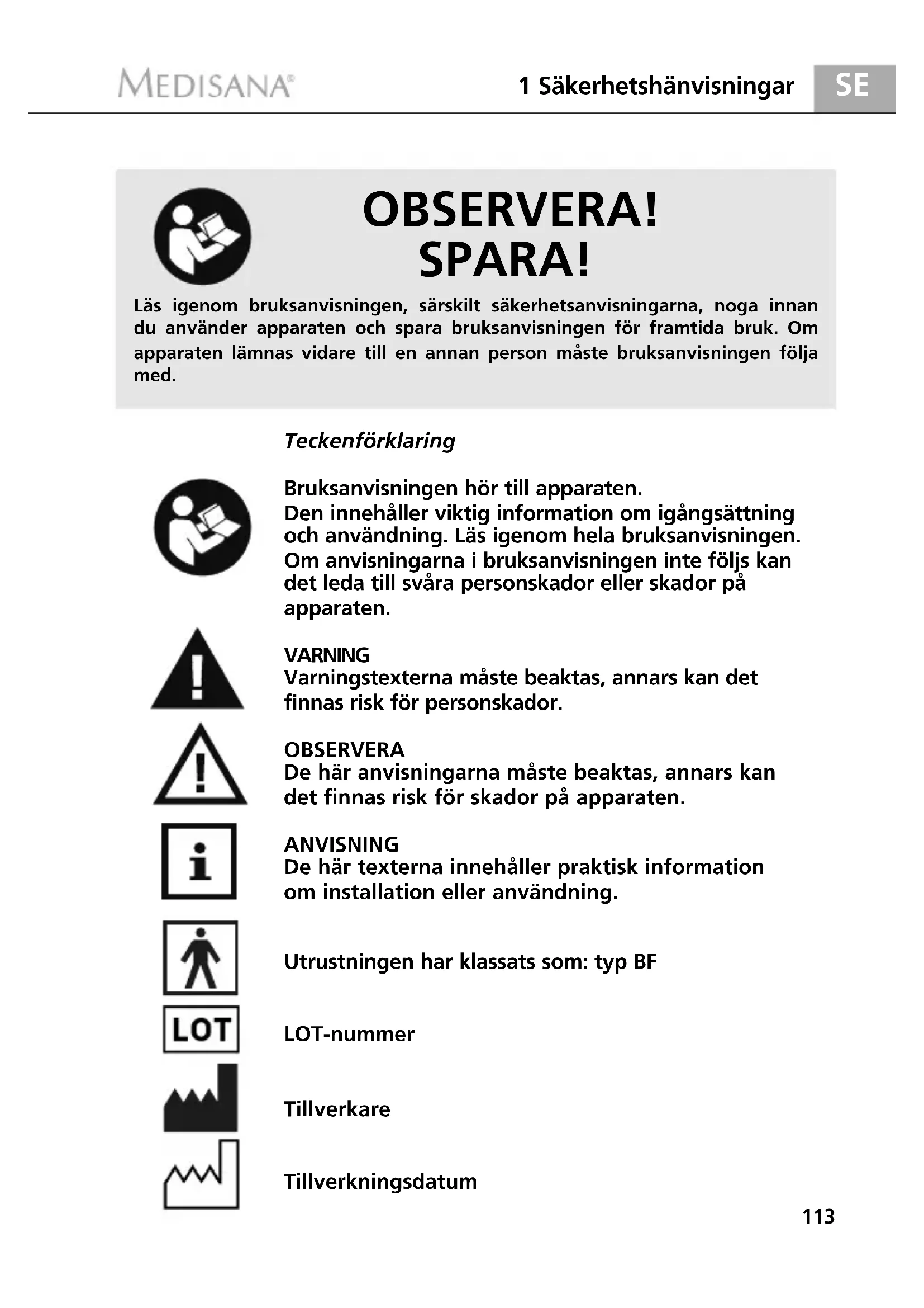 OBSERVERA! SPARA! Teckenförklaring Bruksanvisningen hör till apparaten. Den innehåller viktig information om igångsättning och användning. Läs igenom hela bruksanvisningen. Om anvisningarna i bruksanvisningen inte följs kan det leda till svåra personskador eller skador på apparaten. VARNING Varningstexterna måste beaktas, annars kan det finnas risk för personskador. OBSERVERA De här anvisningarna måste beaktas, annars kan det finnas risk för skador på apparaten. ANVISNING De här texterna innehåller praktisk information om installation eller användning. Utrustningen har klassats som: typ BF LOT-nummer Tillverkare Tillverkningsdatum Läs igenom bruksanvisningen, särskilt säkerhetsanvisningarna, noga innandu använder apparaten och spara bruksanvisningen för framtida bruk. Omapparaten lämnas vidare till en annan person måste bruksanvisningen följa med.
