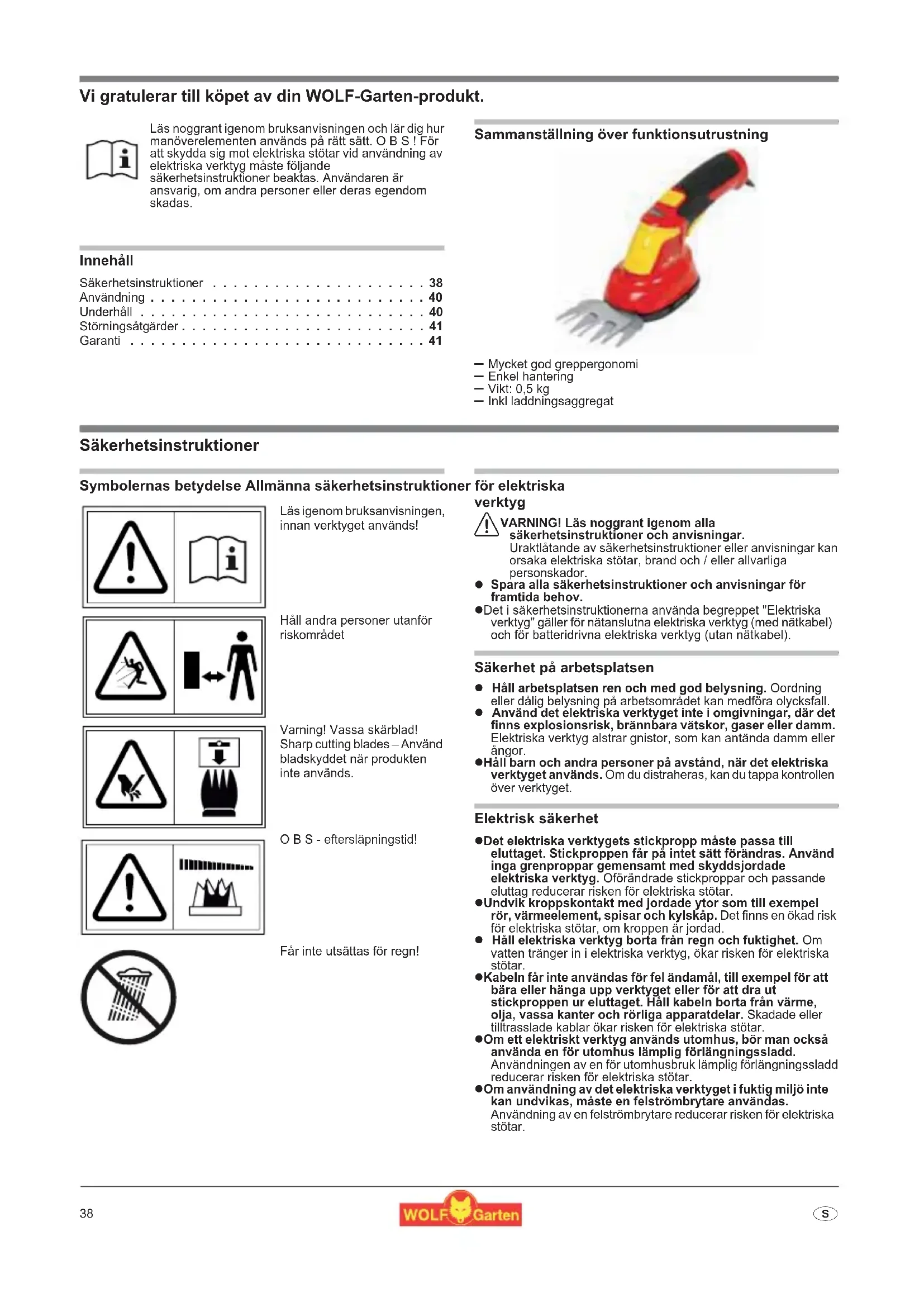 - Vi gratulerar till köpet av din WOLF-Garten-produkt. Innehåll Säkerhetsinstruktioner p. 38