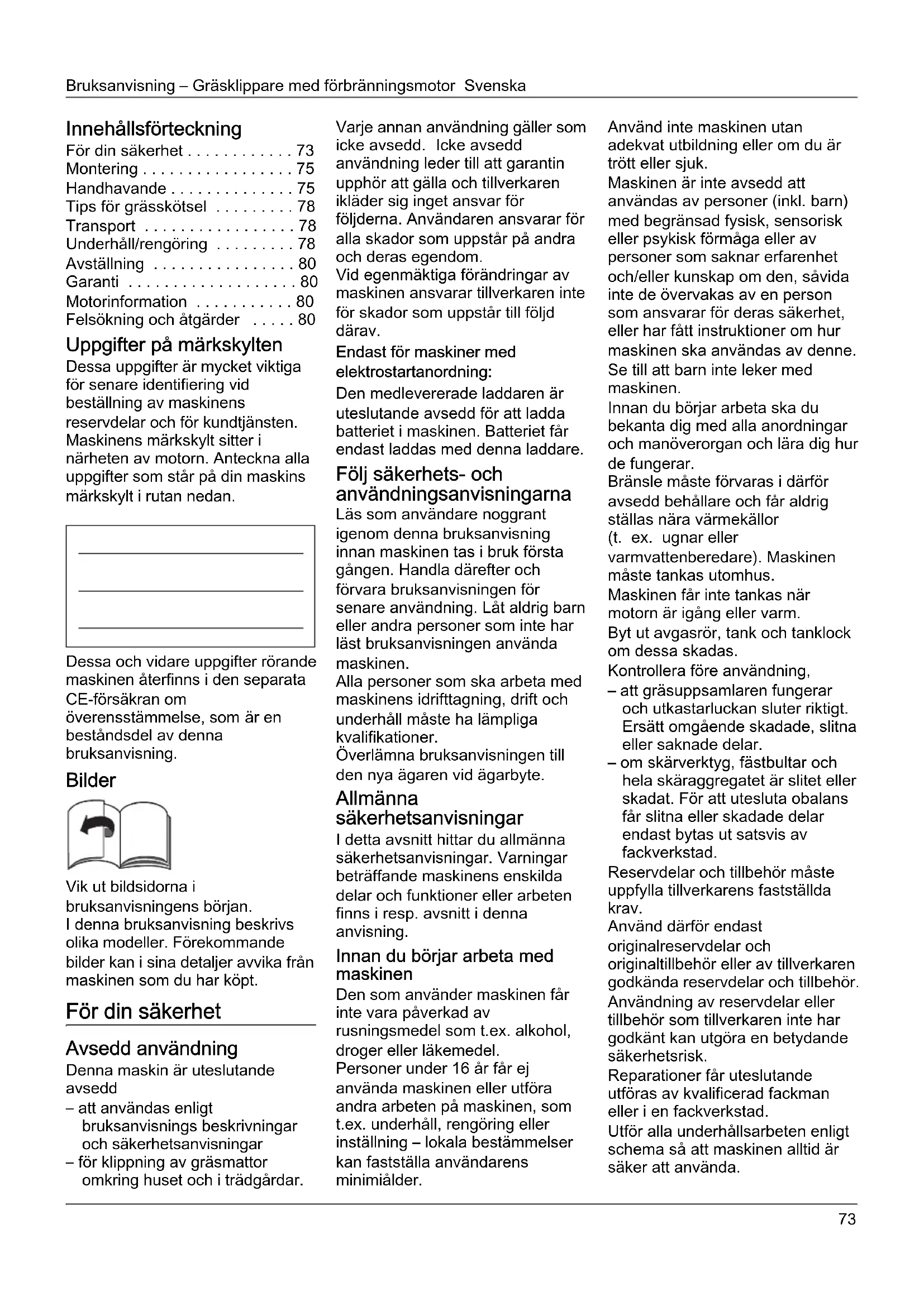 - Felsökning och åtgärder Uppgifter på märkskylten Dessa uppgifter är mycket viktiga för senare identifiering vid beställning av maskinens reservdelar och för kundtjänsten. Maskinens märkskylt sitter i närheten av motorn. Anteckna alla uppgifter som står på din maskins märkskylt i rutan nedan. Dessa och vidare uppgifter rörande maskinen återfinns i den separata CE-försäkran om överensstämmelse, som är en beståndsdel av denna bruksanvisning. Bilder Vik ut bildsidorna i bruksanvisningens början. I denna bruksanvisning beskrivs olika modeller. Förekommande bilder kan i sina detaljer avvika från maskinen som du har köpt. För din säkerhet Avsedd användning Denna maskin är uteslutande avsedd – att användas enligt bruksanvisnings beskrivningar och säkerhetsanvisningar – för klippning av gräsmattor omkring huset och i trädgårdar. Varje annan användning gäller som icke avsedd. Icke avsedd användning leder till att garantin upphör att gälla och tillverkaren ikläder sig inget ansvar för följderna. Användaren ansvarar för alla skador som uppstår på andra och deras egendom. Vid egenmäktiga förändringar av maskinen ansvarar tillverkaren inte för skador som uppstår till följd därav. Endast för maskiner med elektrostartanordning: Den medlevererade laddaren är uteslutande avsedd för att ladda batteriet i maskinen. Batteriet får endast laddas med denna laddare. Följ säkerhets- och användningsanvisningarna Läs som användare noggrant igenom denna bruksanvisning innan maskinen tas i bruk första gången. Handla därefter och förvara bruksanvisningen för senare användning. Låt aldrig barn eller andra personer som inte har läst bruksanvisningen använda maskinen. Alla personer som ska arbeta med maskinens idrifttagning, drift och underhåll måste ha lämpliga kvalifikationer. Överlämna bruksanvisningen till den nya ägaren vid ägarbyte. Allmänna säkerhetsanvisningar I detta avsnitt hittar du allmänna säkerhetsanvisningar. Varningar beträffande maskinens enskilda delar och funktioner eller arbeten finns i resp. avsnitt i denna anvisning. Innan du börjar arbeta med maskinen Den som använder maskinen får inte vara påverkad av rusningsmedel som t.ex. alkohol, droger eller läkemedel. Personer under 16 år får ej använda maskinen eller utföra andra arbeten på maskinen, som t.ex. underhåll, rengöring eller inställning – lokala bestämmelser kan fastställa användarens minimiålder. Använd inte maskinen utan adekvat utbildning eller om du är trött eller sjuk. Maskinen är inte avsedd att användas av personer (inkl. barn) med begränsad fysisk, sensorisk eller psykisk förmåga eller av personer som saknar erfarenhet och/eller kunskap om den, såvida inte de övervakas av en person som ansvarar för deras säkerhet, eller har fått instruktioner om hur maskinen ska användas av denne. Se till att barn inte leker med maskinen. Innan du börjar arbeta ska du bekanta dig med alla anordningar och manöverorgan och lära dig hur de fungerar. Bränsle måste förvaras i därför avsedd behållare och får aldrig ställas nära värmekällor (t. ex. ugnar eller varmvattenberedare). Maskinen måste tankas utomhus. Maskinen får inte tankas när motorn är igång eller varm. Byt ut avgasrör, tank och tanklock om dessa skadas. Kontrollera före användning, – att gräsuppsamlaren fungerar och utkastarluckan sluter riktigt. Ersätt omgående skadade, slitna eller saknade delar. – om skärverktyg, fästbultar och hela skäraggregatet är slitet eller skadat. För att utesluta obalans får slitna eller skadade delar endast bytas ut satsvis av fackverkstad. Reservdelar och tillbehör måste uppfylla tillverkarens fastställda krav. Använd därför endast originalreservdelar och originaltillbehör eller av tillverkaren godkända reservdelar och tillbehör. Användning av reservdelar eller tillbehör som tillverkaren inte har godkänt kan utgöra en betydande säkerhetsrisk. Reparationer får uteslutande utföras av kvalificerad fackman eller i en fackverkstad. Utför alla underhållsarbeten enligt schema så att maskinen alltid är säker att använda.Svenska Bruksanvisning – Gräsklippare med förbränningsmotor p. 80