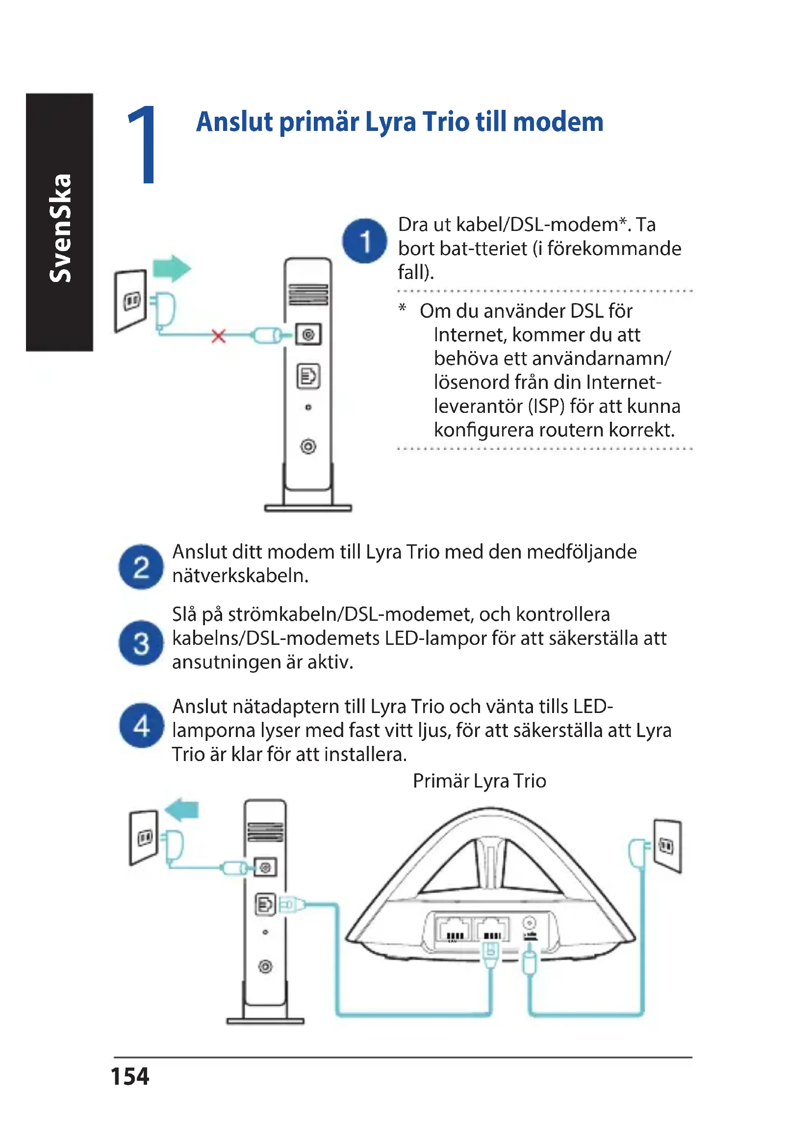 Anslut nätadaptern till Lyra Trio och vänta tills LED- lamporna lyser med fast vitt ljus, för att säkerställa att Lyra Trio är klar för att installera. LAN Primär Lyra Trio155 SvenSka Installera Lyra Trio WiFi-system Starta appen ASUS Lyra på din mobilenhet, och följ instruktionerna efter en stund.