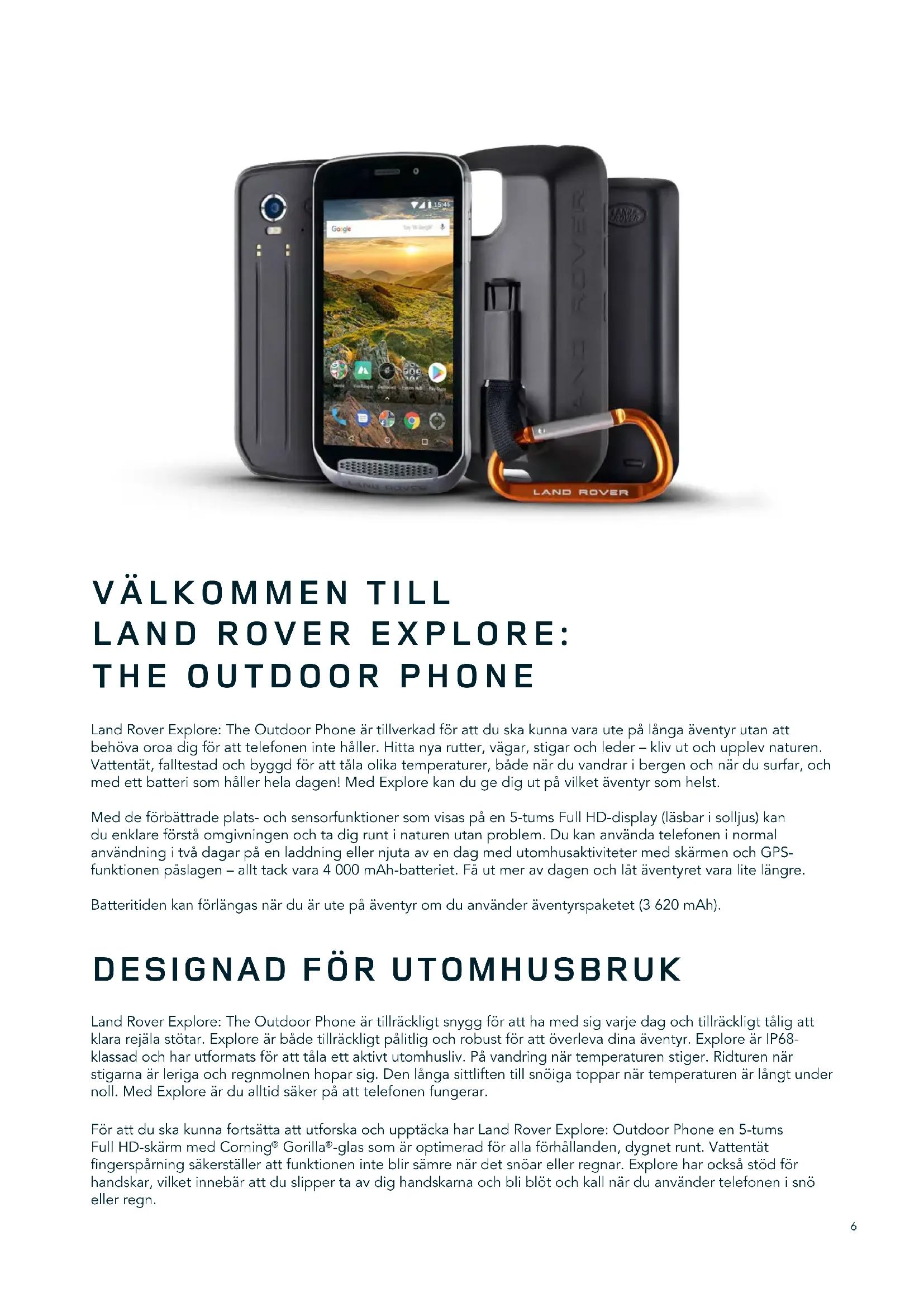LandRoverExplore:TheOutdoorPhoneärtillverkadförattduskakunnavarautepålångaäventyrutanatt behövaoroadigföratttelefonenintehåller.Hittanyarutter,vägar,stigarochleder–klivutochupplevnaturen. Vattentät,falltestadochbyggdföratttålaolikatemperaturer,bådenärduvandraribergenochnärdusurfar,och medettbatterisomhållerheladagen!MedExplorekandugedigutpåvilketäventyrsomhelst. Meddeförbättradeplats-ochsensorfunktionersomvisaspåen5-tumsFullHD-display(läsbarisolljus)kan du enklare förstå omgivningen och ta dig runt i naturen utan problem. Du kan använda telefonen i normal användning i två dagar på en laddning eller njuta av en dag med utomhusaktiviteter med skärmen och GPS- funktionenpåslagen–allttackvara4000mAh-batteriet.Fåutmeravdagenochlåtäventyretvaralitelängre. Batteritidenkanförlängasnärduärutepåäventyromduanvänderäventyrspaketet(3620mAh).