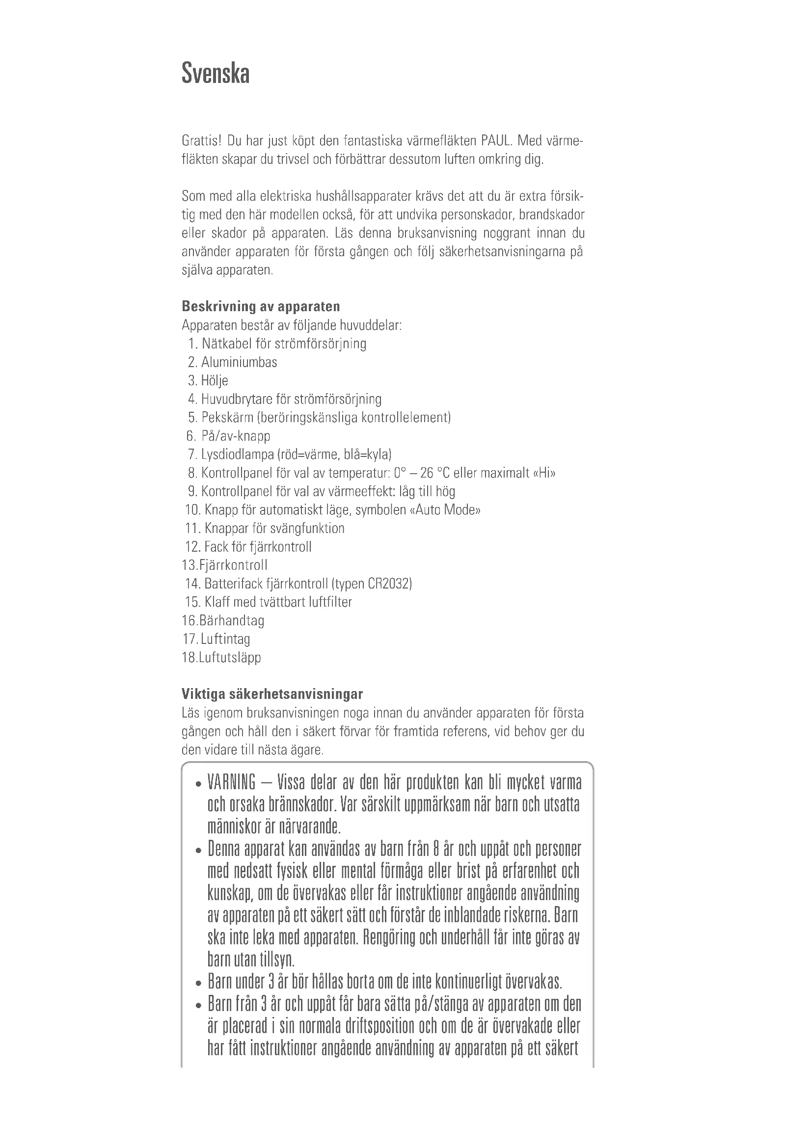 - VARNING - Vissa delar av den har Produkten kan bl mycket varma och orsaka brännskador. Var särskilt uppmärksam nar barn och utsatta manniskor ar narvarande.