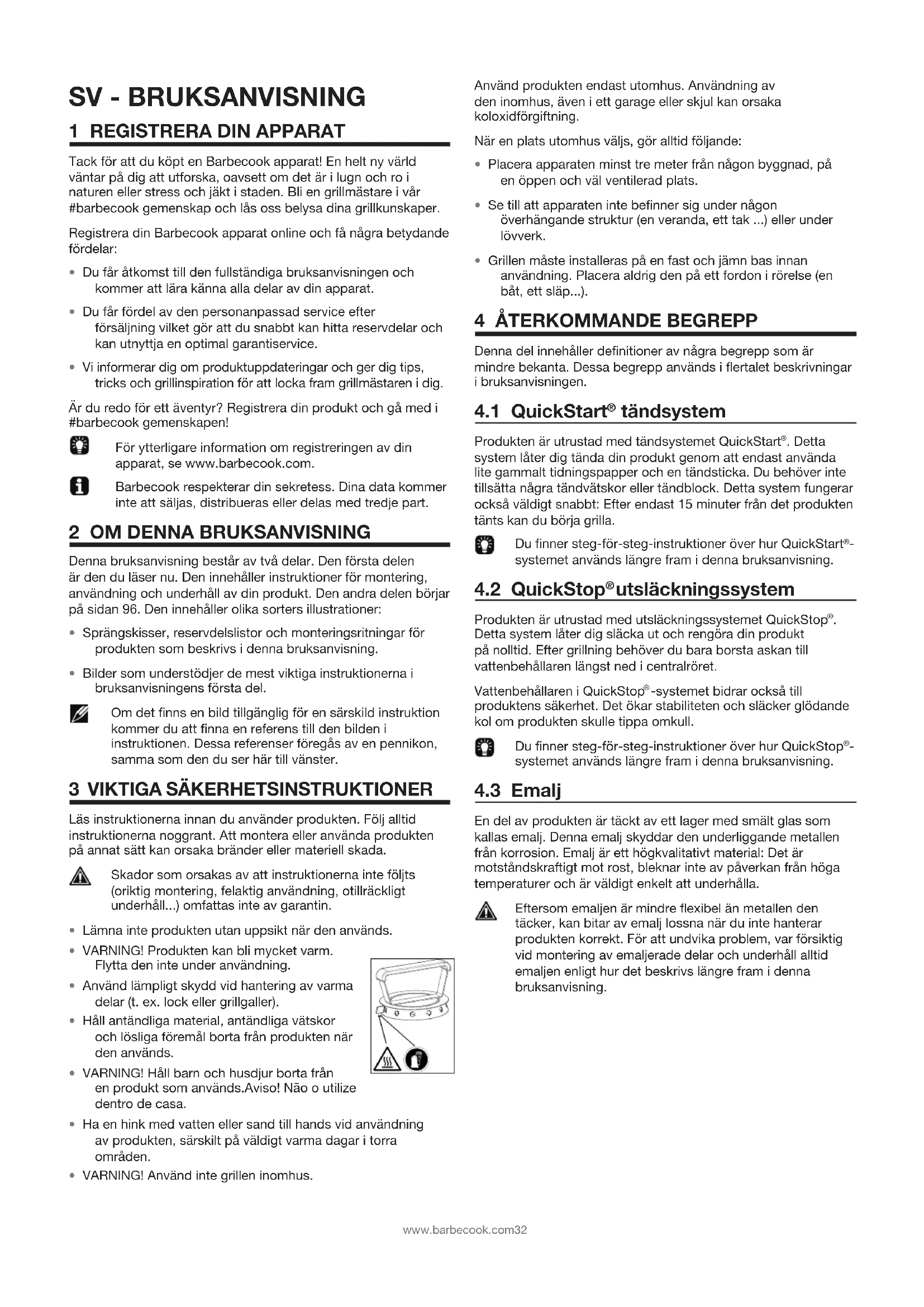 Produkten är utrustad med tändsystemet QuickStart®. Detta system låter dig tända din produkt genom att endast använda lite gammalt tidningspapper och en tändsticka. Du behöver inte tillsätta några tändvätskor eller tändblock. Detta system fungerar också väldigt snabbt: Efter endast 15 minuter från det produkten tänts kan du börja grilla.