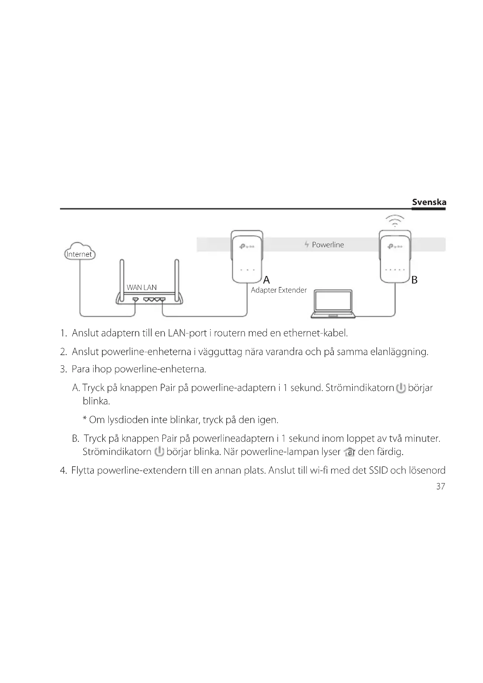 - För passthrough-powerline-enheter, anslut grenuttag i powerline-enheternas integrerade eluttag. Kopiera Wi-Fi-inställningarna från routern till extendern Om routern stöder WPS kan du följa stegen nedan för att automatiskt kopiera routerns WiFi-inställningar (SSID och lösenord) till powerline-extendern.Svenska
