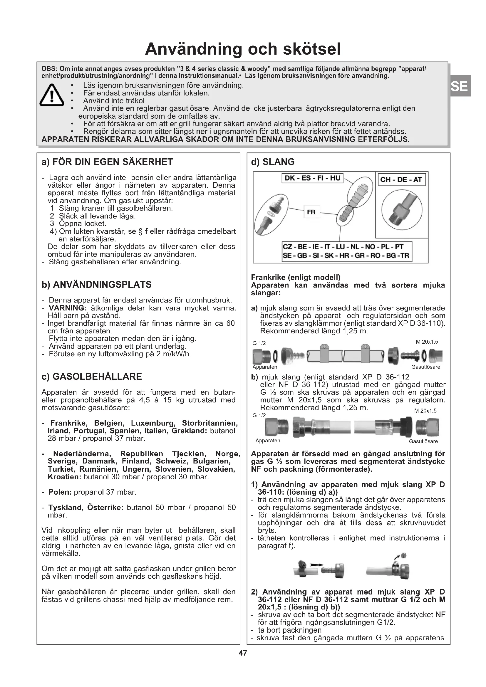 /kW/h. c) GASOLBEHÅLLARE Apparaten är avsedd för att fungera med en butan- eller propanolbehållare på 4,5 à 15 kg utrustad med motsvarande gasutlösare: - Frankrike, Belgien, Luxemburg, Storbritannien, Irland, Portugal, Spanien, Italien, Grekland: butanol 28 mbar / propanol 37 mbar. - Nederländerna, Republiken Tjeckien, Norge, Sverige, Danmark, Finland, Schweiz, Bulgarien, Turkiet, Rumänien, Ungern, Slovenien, Slovakien, Kroatien: butanol 30 mbar / propanol 30 mbar. - Polen: propanol 37 mbar. - Tyskland, Österrike: butanol 50 mbar / propanol 50 mbar. Vid inkoppling eller när man byter ut behållaren, skall detta alltid utföras på en väl ventilerad plats. Gör det aldrig i närheten av en levande låga, gnista eller vid en värmekälla. Om det är möjligt att sätta gasflaskan under grillen beror på vilken modell som används och gasflaskans höjd. När gasbehållaren är placerad under grillen, skall den fästas vid grillens chassi med hjälp av medföljande rem. d) SLANG Frankrike (enligt modell) Apparaten kan användas med två sorters mjuka slangar: a) mjuk slang som är avsedd att träs över segmenterade ändstycken på apparat- och regulatorsidan och som fixeras av slangklämmor (enligt standard XP D 36-110). Rekommenderad längd 1,25 m. b) mjuk slang (enligt standard XP D 36-112 eller NF D 36-112) utrustad med en gängad mutter G ½ som ska skruvas på apparaten och en gängad mutter M 20x1,5 som ska skruvas på regulatorn. Rekommenderad längd 1,25 m. Apparaten är försedd med en gängad anslutning för gas G ½ som levereras med segmenterat ändstycke NF och packning (förmonterade).