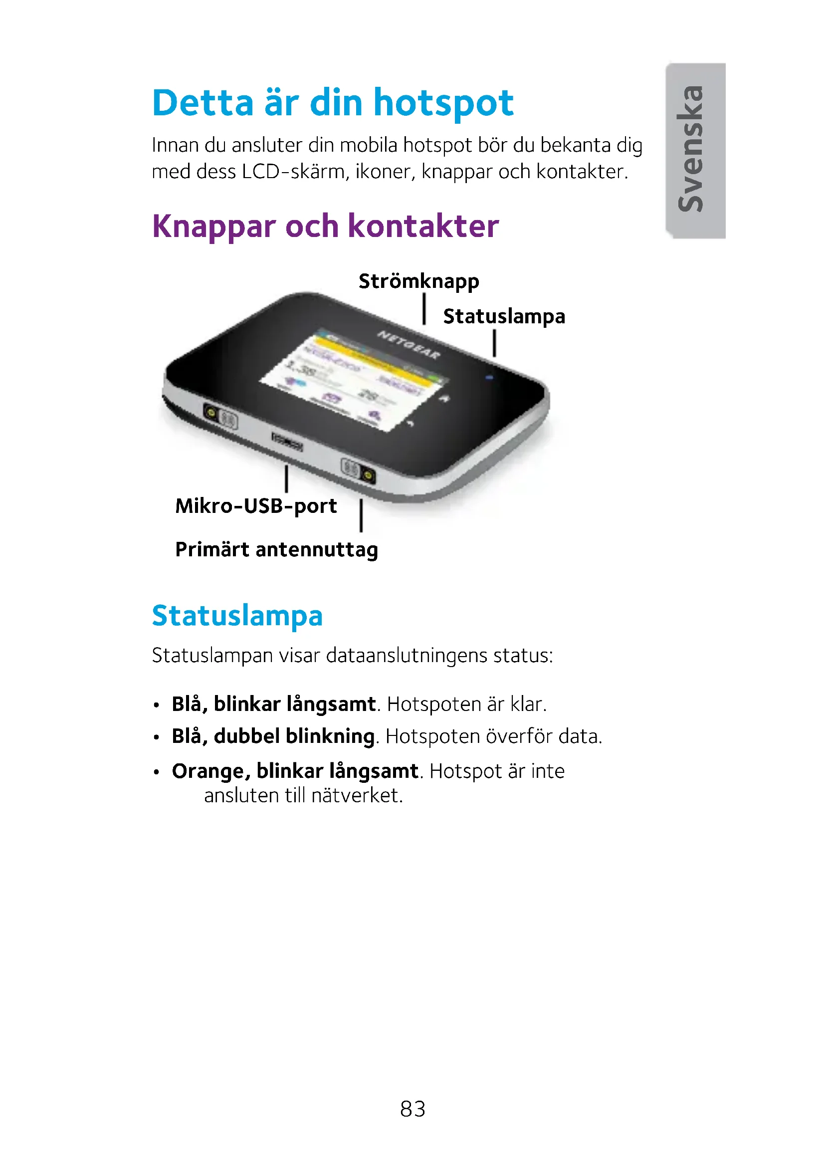 den enhet som du vill ansluta till WiFi-nätverket. Hotspot-enheten och WiFi-enheten kommunicerar nu automatiskt och en säker anslutning upprättas.Support Tack för att du köpt den här NETGEAR-produkten. När du har installerat enheten letar du upp serienumret på etiketten på produkten och använder det till att registrera produkten på adressen https://my.netgear.com. Du måste registrera denna produkt innan du kan använda NETGEAR:s telefonsupport. NETGEAR rekommenderar att du registrerar produkten via NETGEAR:s webbplats. Produktuppdateringar och webbsupport finns på http://support.netgear.com. NETGEAR rekommenderar att du endast använder officiella NETGEAR-supportresurser. Du kan hämta användarhandboken på http://downloadcenter.netgear.com eller via en länk i produktens användargränssnitt. Varumärken © NETGEAR, Inc., NETGEAR och NETGEAR-logotypen är varumärken som tillhör NETGEAR, Inc. Varumärken från andra tillverkare än NETGEAR används endast för referens. Efterlevnad Om du vill se den aktuella EG-försäkran om överensstämmelse går du till: http://support.netgear.com/app/answers/detail/a_ id/11621/. För information om efterlevnad av bestämmelser, gå till http://www.netgear.com/about/regulatory/. Läs dokumentet om överensstämmelse innan du ansluter nätadaptern.Краткое руководство AirCard 810 Мобильная точка доступа99 Вводные сведения о точке