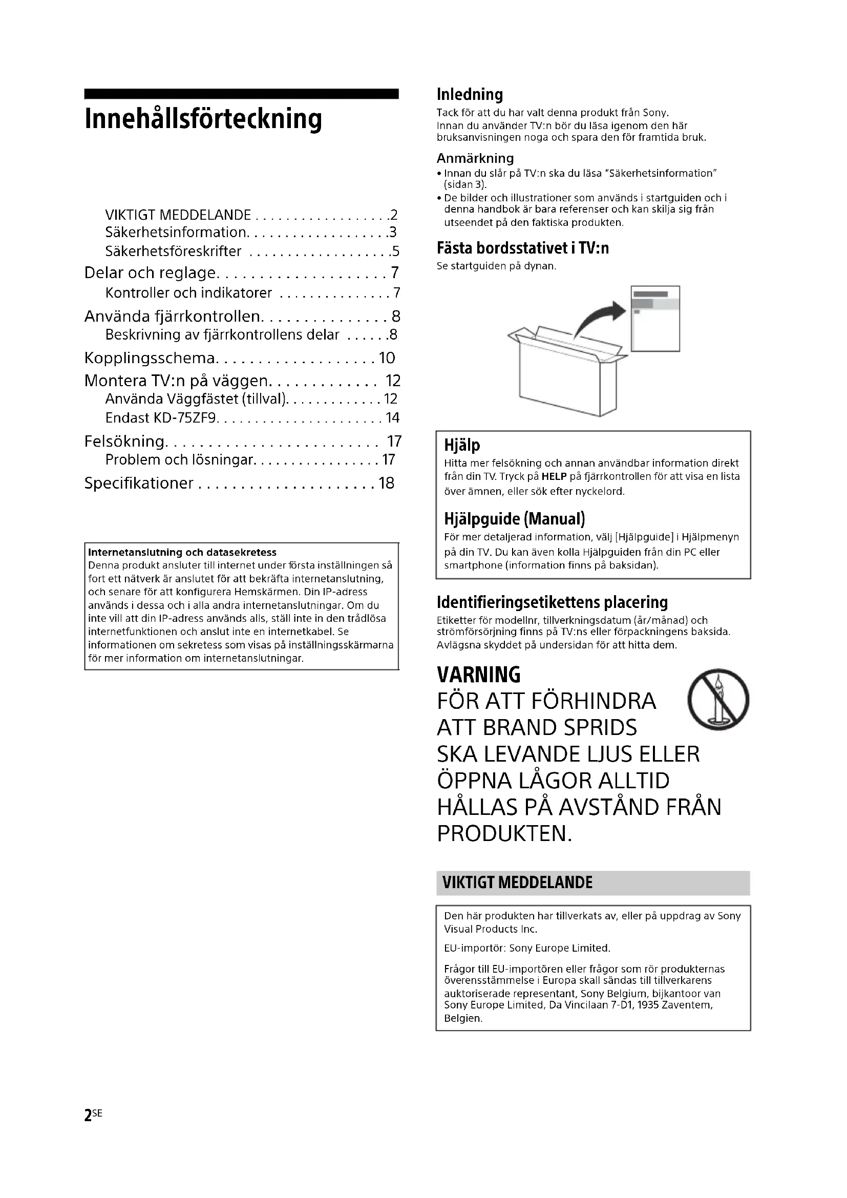 HÅLLAS PÅ AVSTÅND FRÅN PRODUKTEN. Internetanslutning och datasekretessDenna produkt ansluter till internet under första inställningen så fort ett nätverk är anslutet för att bekräfta internetanslutning, och senare för att konfigurera Hemskärmen. Din IP-adress används i dessa och i alla andra internetanslutningar. Om du inte vill att din IP-adress används alls, ställ inte in den trådlösa internetfunktionen och anslut inte en internetkabel. Se informationen om sekretess som visas på inställningsskärmarna för mer information om internetanslutningar. Hjälp Hitta mer felsökning och annan användbar information direkt från din TV. Tryck på HELP på fjärrkontrollen för att visa en lista över ämnen, eller sök efter nyckelord. Hjälpguide (Manual) För mer detaljerad information, välj [Hjälpguide] i Hjälpmenyn på din TV. Du kan även kolla Hjälpguiden från din PC eller smartphone (information finns på baksidan). VIKTIGT MEDDELANDE Den här produkten har tillverkats av, eller på uppdrag av Sony Visual Products Inc.EU-importör: Sony Europe Limited.Frågor till EU-importören eller frågor som rör produkternas öve rensstämmelse i Europa skall sändas till tillverkarens auktoriserade representant, Sony Belgium, bijkantoor van Sony Europe Limited, Da Vincilaan 7-D1, 1935 Zaventem, Belgien.3