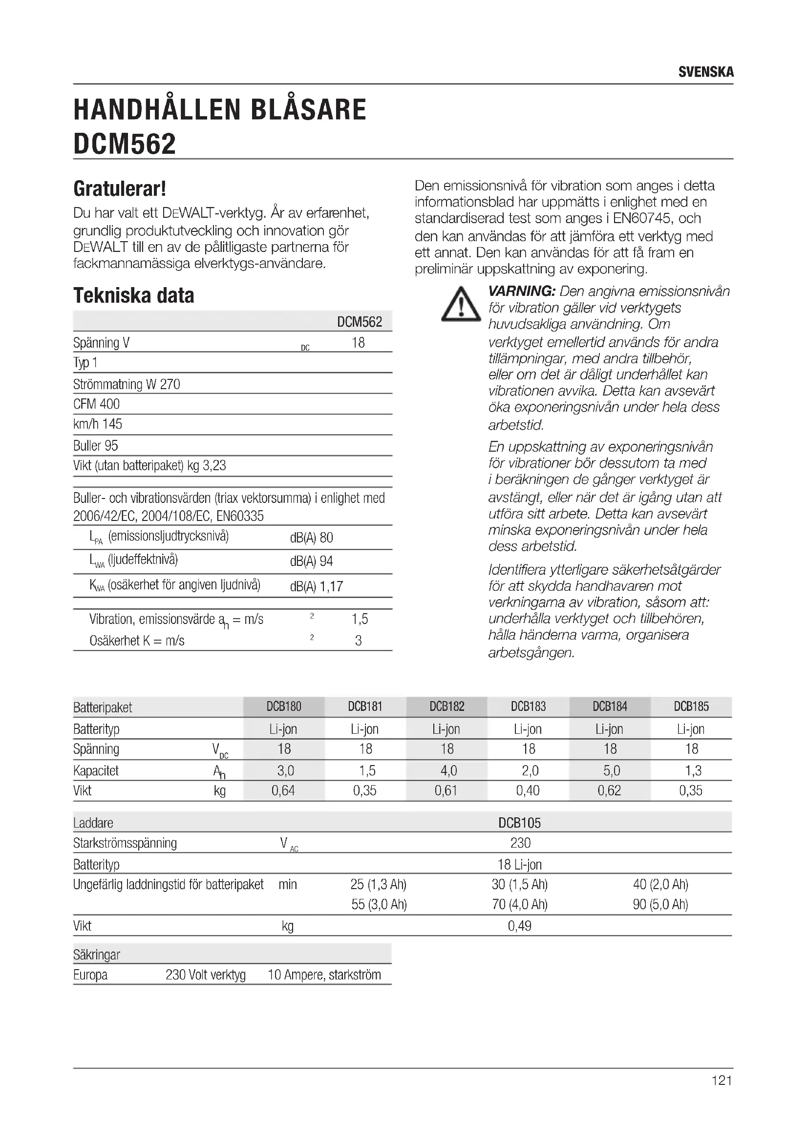 - Laddarenärkonstrueradförattarbetamed standard230Vhushållsström.Försökinteatt användanågonannanspänning.Detta gäller inte för billaddaren. SPaRa DESSa INSTRUKTIONER Laddare Laddare av typ DCB105 fungerar med li-jon- batteripaketen DCB180, DCB181, DCB182, DCB183, DCB184 och DCB185 på 18 V. Laddare från DeWALT kräver inga justeringar och är utformade att vara så enkla som möjligt att använda.127 svenska SE UPP: När den inte används skall den läggas på sidan på en stabil plats så att ingen riskerar att någon snubblar på den. Vissa verktyg med stora batteripaket kan stå upprätt på batteripaketet men lätt kan vältas.