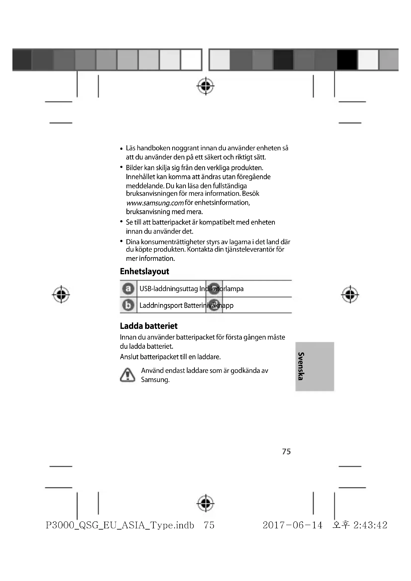 Dina konsumenträttigheter styrs av lagarna i det land där du köpte produkten. Kontakta din tjänsteleverantör för mer information. Enhetslayout USB-laddningsuttag Indikatorlampa Laddningsport Batterinivåknapp Ladda batteriet Innan du använder batteripacket för första gången måste du ladda batteriet. Anslut batteripacket till en laddare. Använd endast laddare som är godkända av Samsung. Svenska P3000_QSG_EU_ASIA_Type.indb 75P3000_QSG_EU_ASIA_Type.indb 75 2017-06-14 오후 2:43:422017-06-14 오후 2:43:4276