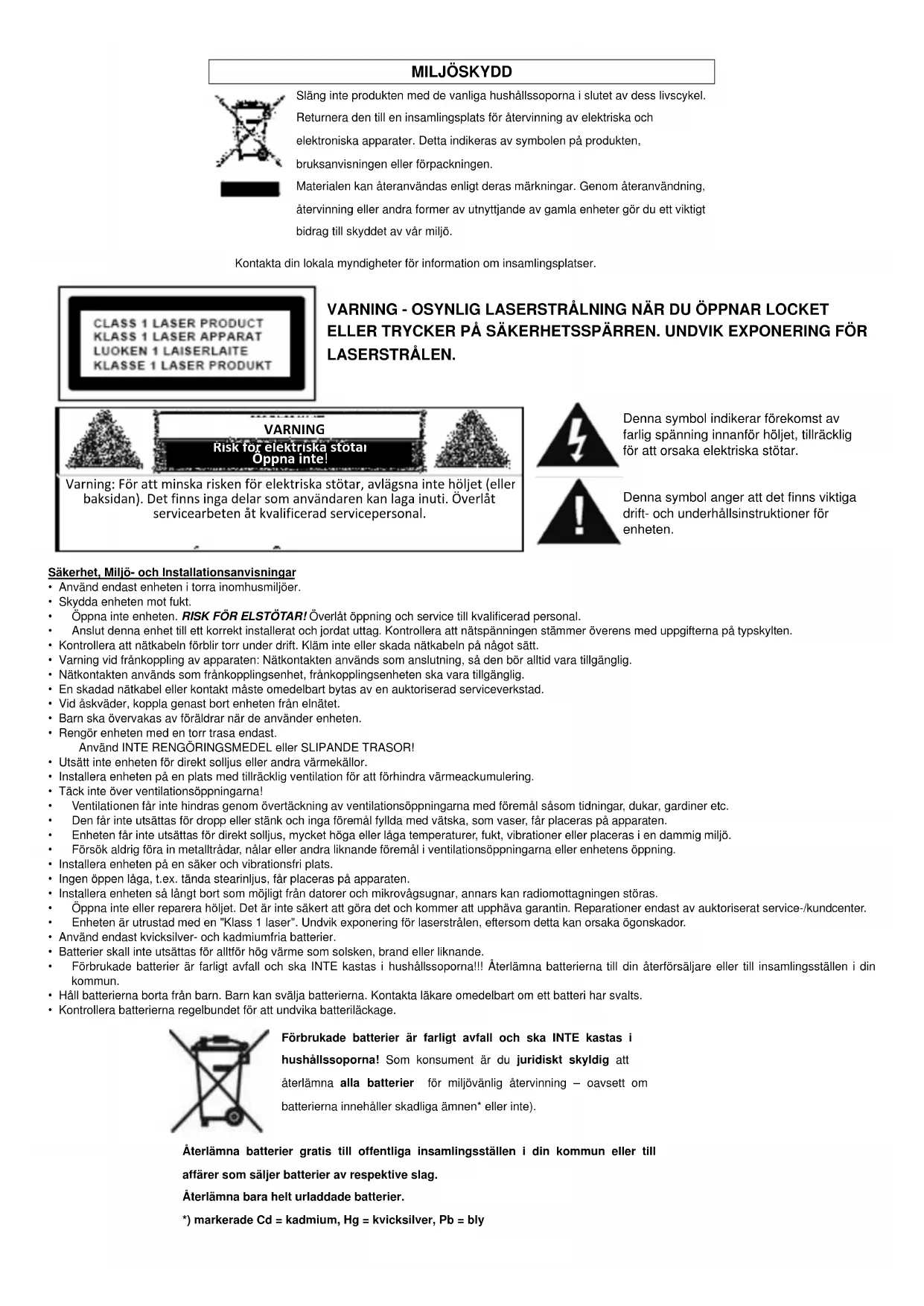 - Öppna inte aller reparera höljet. Det ar inte sakert att gora det ochkommen att upphäva garantin. Reparationer endast av auktoriserat service-/kundcenter.