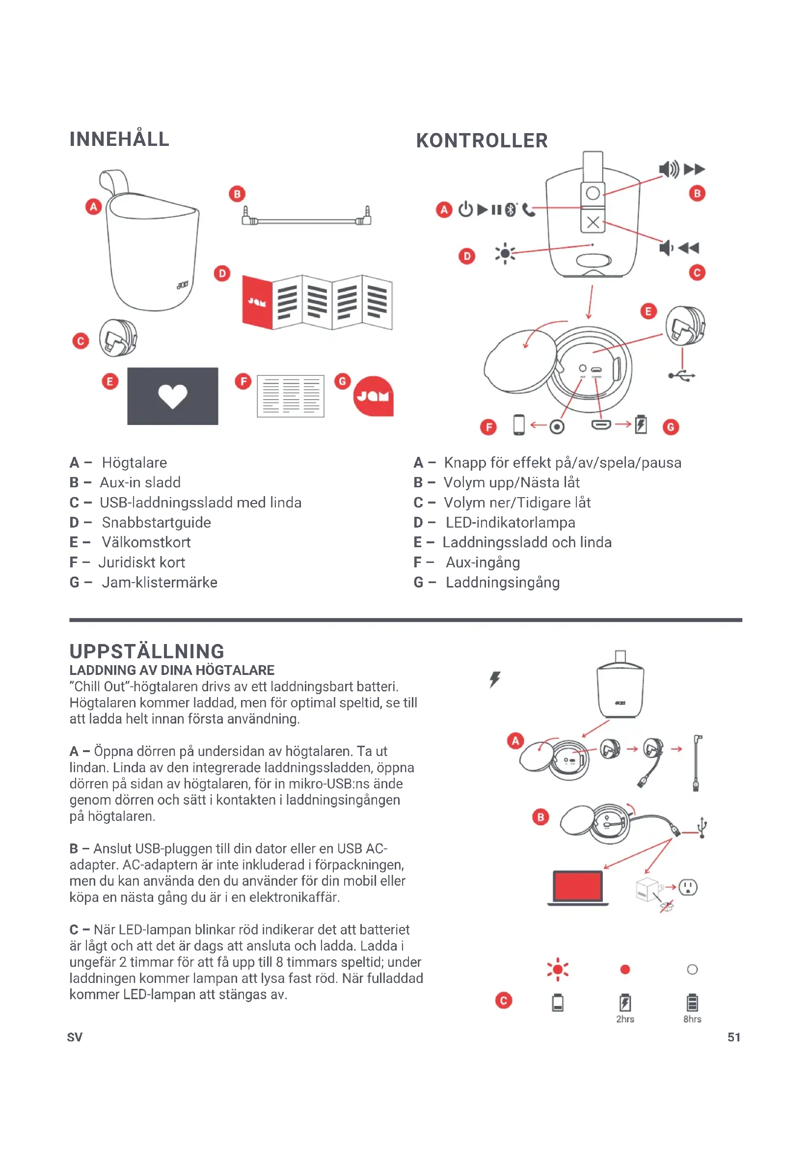 ”Chill Out”-högtalaren drivs av ett laddningsbart batteri. Högtalaren kommer laddad, men för optimal speltid, se till att ladda helt innan första användning. A – Öppna dörren på undersidan av högtalaren. Ta ut lindan. Linda av den integrerade laddningssladden, öppna dörren på sidan av högtalaren, för in mikro-USB:ns ände genom dörren och sätt i kontakten i laddningsingången på högtalaren. B – Anslut USB-pluggen till din dator eller en USB AC- adapter. AC-adaptern är inte inkluderad i förpackningen, men du kan använda den du använder för din mobil eller köpa en nästa gång du är i en elektronikaffär. C – När LED-lampan blinkar röd indikerar det att batteriet är lågt och att det är dags att ansluta och ladda. Ladda i ungefär 2 timmar för att få upp till 8 timmars speltid; under laddningen kommer lampan att lysa fast röd. När fulladdad kommer LED-lampan att stängas av. SV52 ANVÄNDNING
