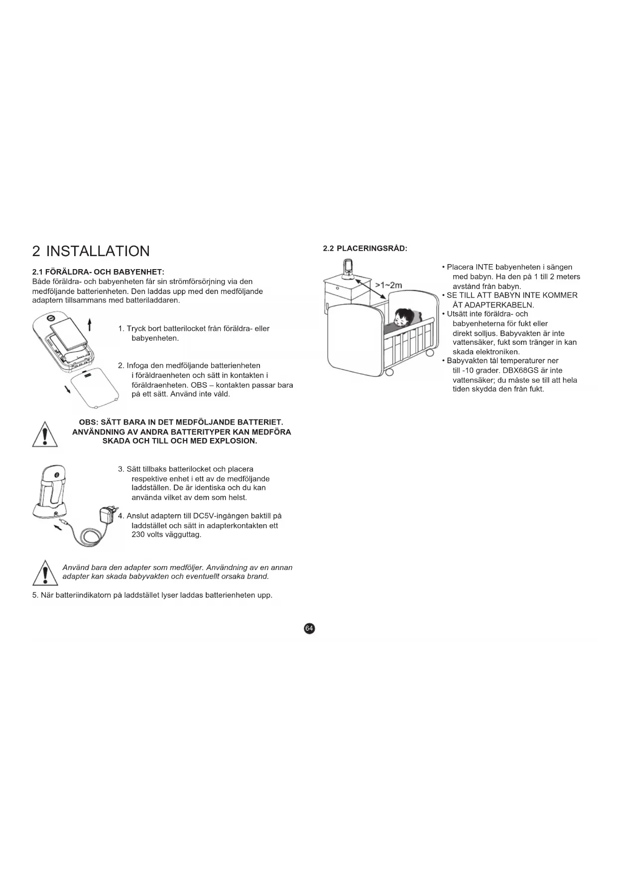 Adapters: Använd endast de strömadapters som medföljer produkten. Om andra adapters används kan skada uppstå på elektroniken i babyvakten. Batterier: Du kan bara installera UPPLADDNINGSBARA batterier i DBX68GS som är av typen Litium-Polymer, 3.7V och 720mAh.