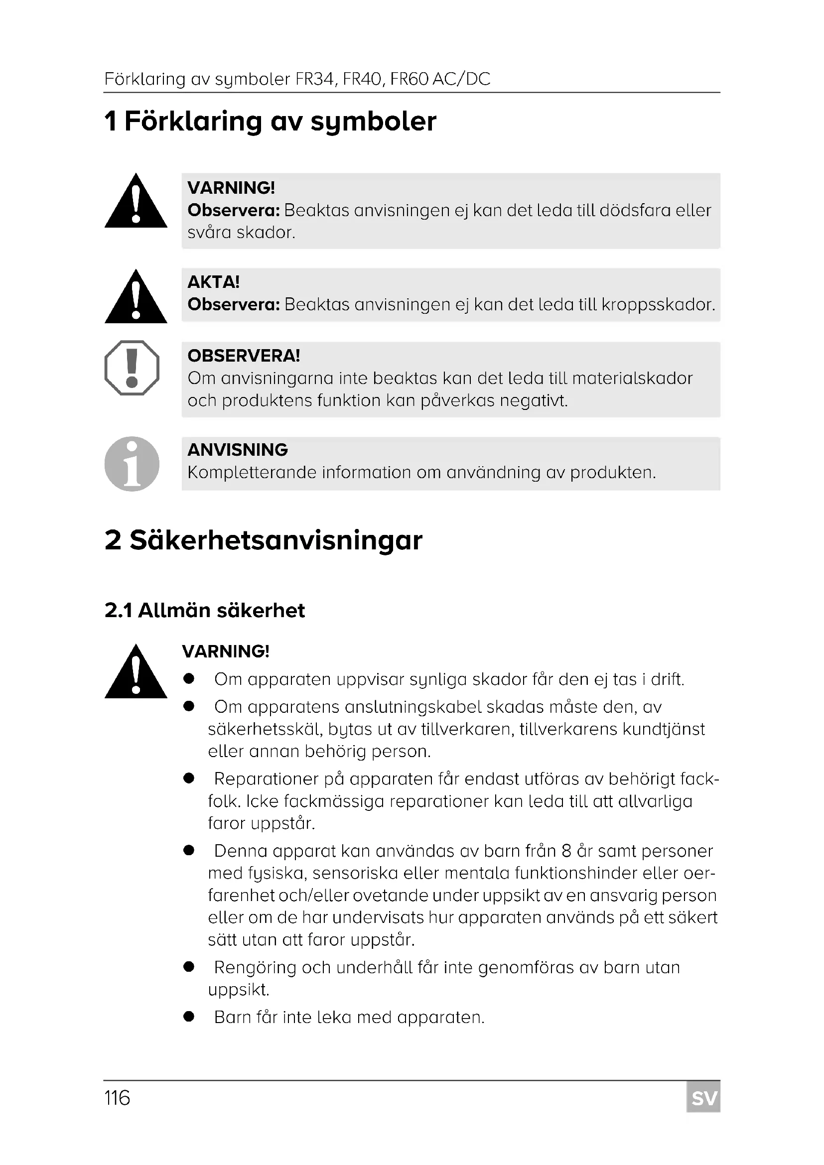 VARNING! Om apparaten uppvisar synliga skador får den ej tas i drift. Om apparatens anslutningskabel skadas måste den, av säkerhetsskäl, bytas ut av tillverkaren, tillverkarens kundtjänst eller annan behörig person. Reparationer på apparaten får endast utföras av behörigt fack- folk. Icke fackmässiga reparationer kan leda till att allvarliga faror uppstår. Denna apparat kan användas av barn från 8 år samt personer med fysiska, sensoriska eller mentala funktionshinder eller oer- farenhet och/eller ovetande under uppsikt av en ansvarig person eller om de har undervisats hur apparaten används på ett säkert sätt utan att faror uppstår. Rengöring och underhåll får inte genomföras av barn utan uppsikt. Barn får inte leka med apparaten. VARNING! Observera: Beaktas anvisningen ej kan det leda till dödsfara eller svåra skador. AKTA! Observera: Beaktas anvisningen ej kan det leda till kroppsskador. OBSERVERA! Om anvisningarna inte beaktas kan det leda till materialskador och produktens funktion kan påverkas negativt. ANVISNING Kompletterande information om användning av produkten. FR34-FR40-FR60--O-16s.book Seite 116 Donnerstag, 19. Juli 2018 3:22 15SV FR34, FR40, FR60 AC/DC Säkerhetsanvisningar