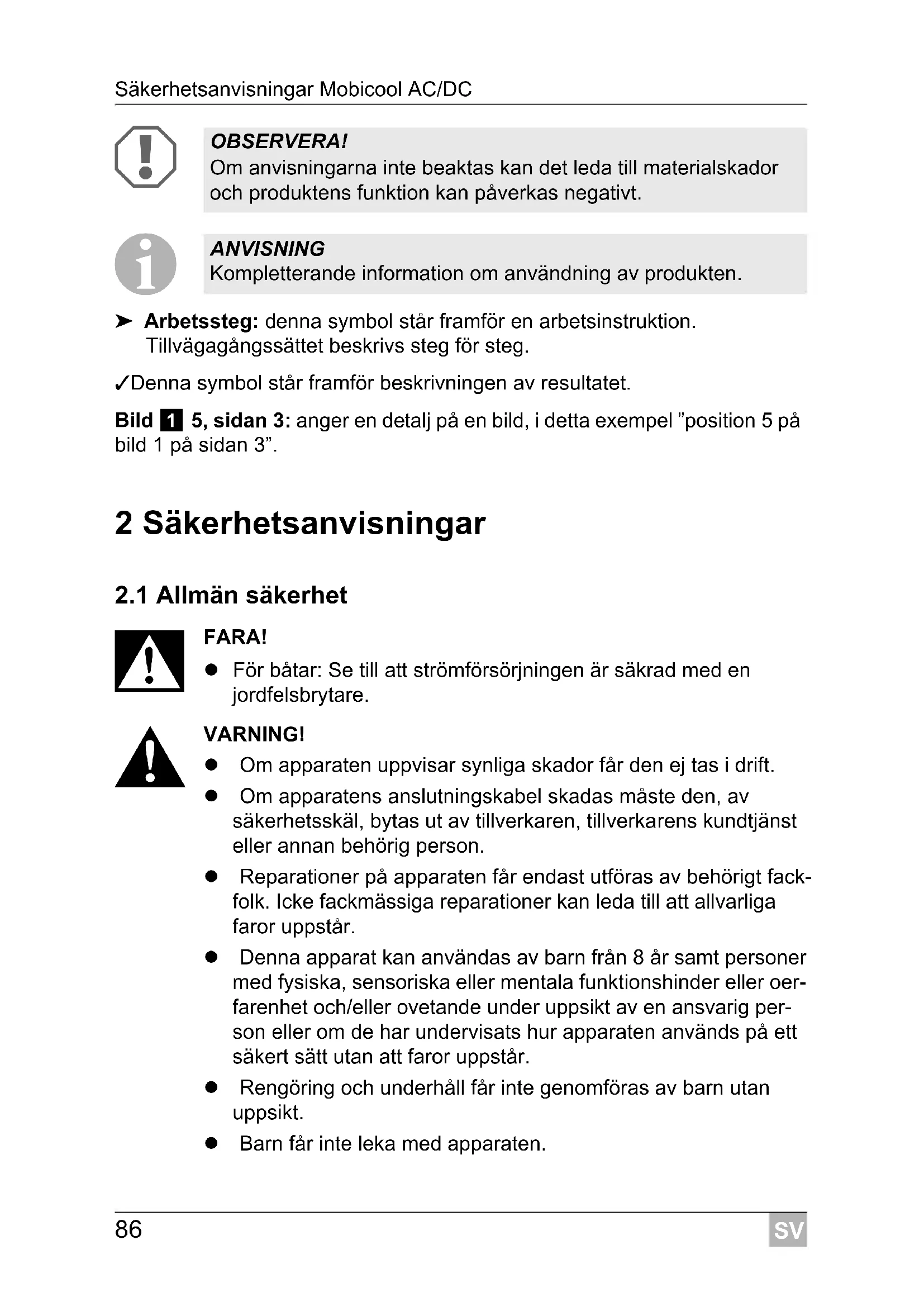 Observera: Beaktas anvisningen ej kan det leda till dödsfara eller svåra skador.