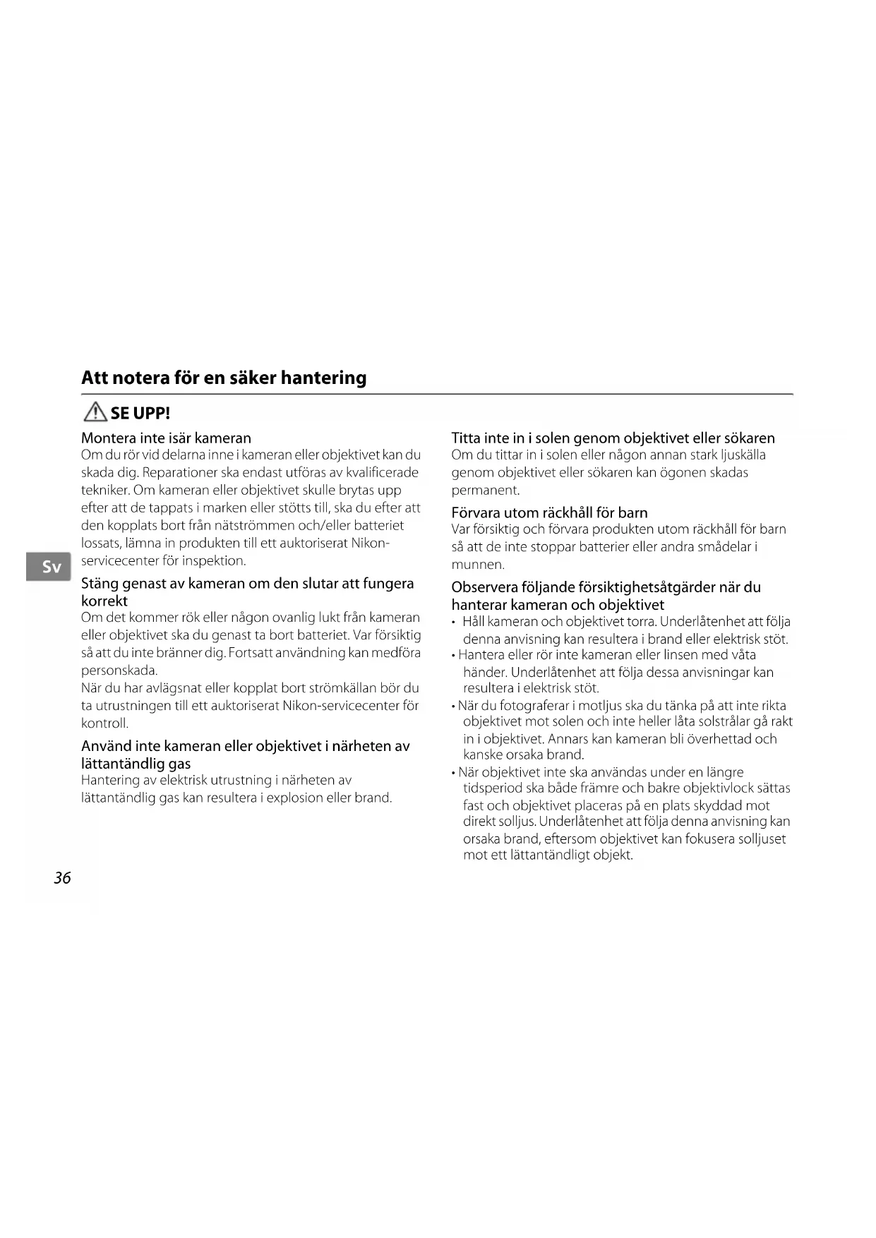 Att notera för en säker hantering SE UPP! Montera inte isär kameran Om du rör vid delarna inne i kameran eller objektivet kan du skada dig. Reparationer ska endast utföras av kvalificerade tekniker. Om kameran eller objektivet skulle brytas upp efter att de tappats i marken eller stötts till, ska du efter att den kopplats bort från nätströmmen och/eller batteriet lossats, lämna in produkten till ett auktoriserat Nikon- servicecenter för inspektion. Stäng genast av kameran om den slutar att fungera korrekt Om det kommer rök eller någon ovanlig lukt från kameran eller objektivet ska du genast ta bort batteriet. Var försiktig så att du inte bränner dig. Fortsatt användning kan medföra personskada. När du har avlägsnat eller kopplat bort strömkällan bör du ta utrustningen till ett auktoriserat Nikon-servicecenter för kontroll. Använd inte kameran eller objektivet i närheten av lättantändlig gas Hantering av elektrisk utrustning i närheten av lättantändlig gas kan resultera i explosion eller brand. Titta inte in i solen genom objektivet eller sökaren Om du tittar in i solen eller någon annan stark ljuskälla genom objektivet eller sökaren kan ögonen skadas permanent. Förvara utom räckhåll för barn Var försiktig och förvara produkten utom räckhåll för barn så att de inte stoppar batterier eller andra smådelar i munnen. Observera följande försiktighetsåtgärder när du hanterar kameran och objektivet