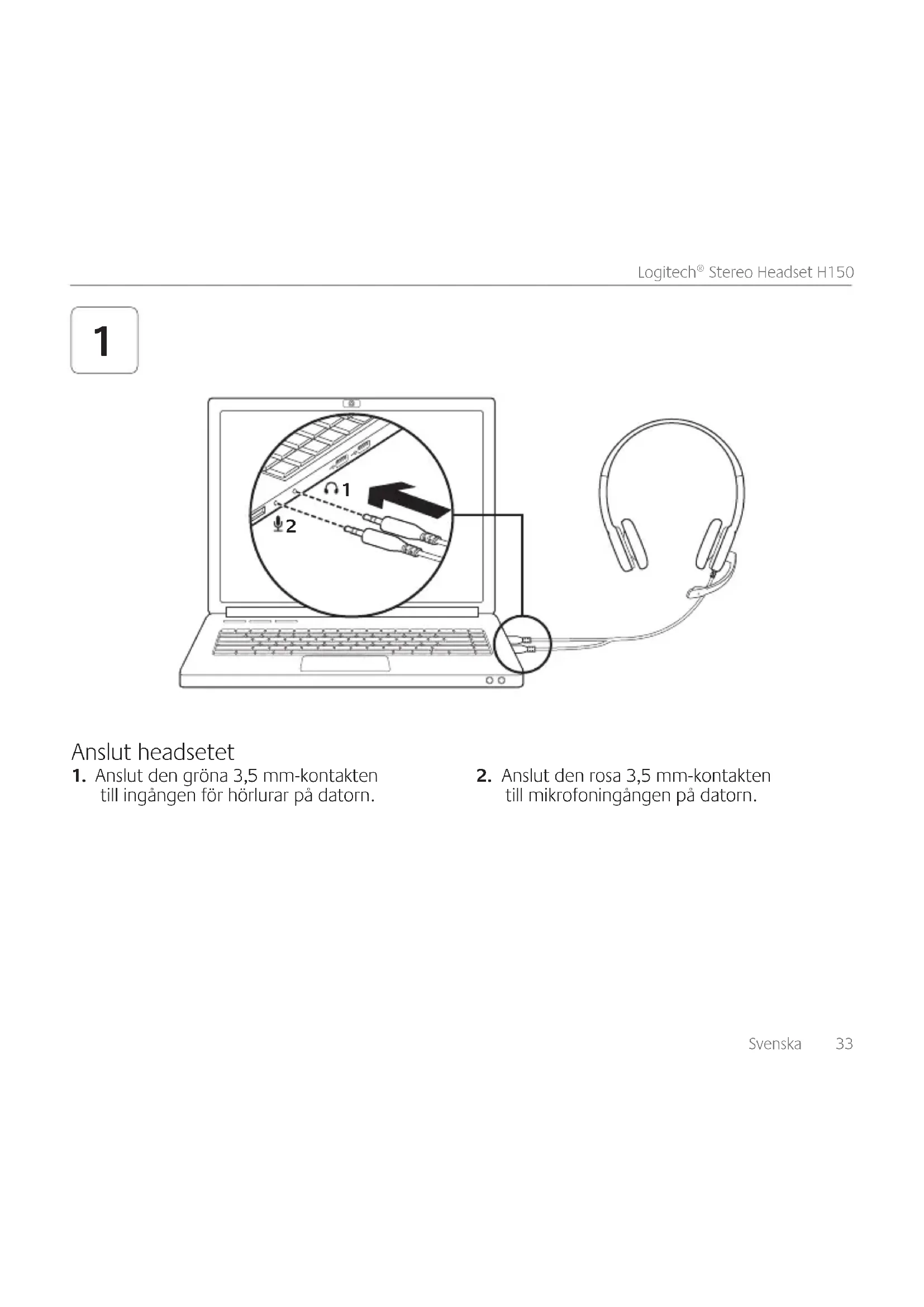 Anslut headsetet34 Svenska Komma igång med 2Svenska 35 Logitech® Stereo Headset H150