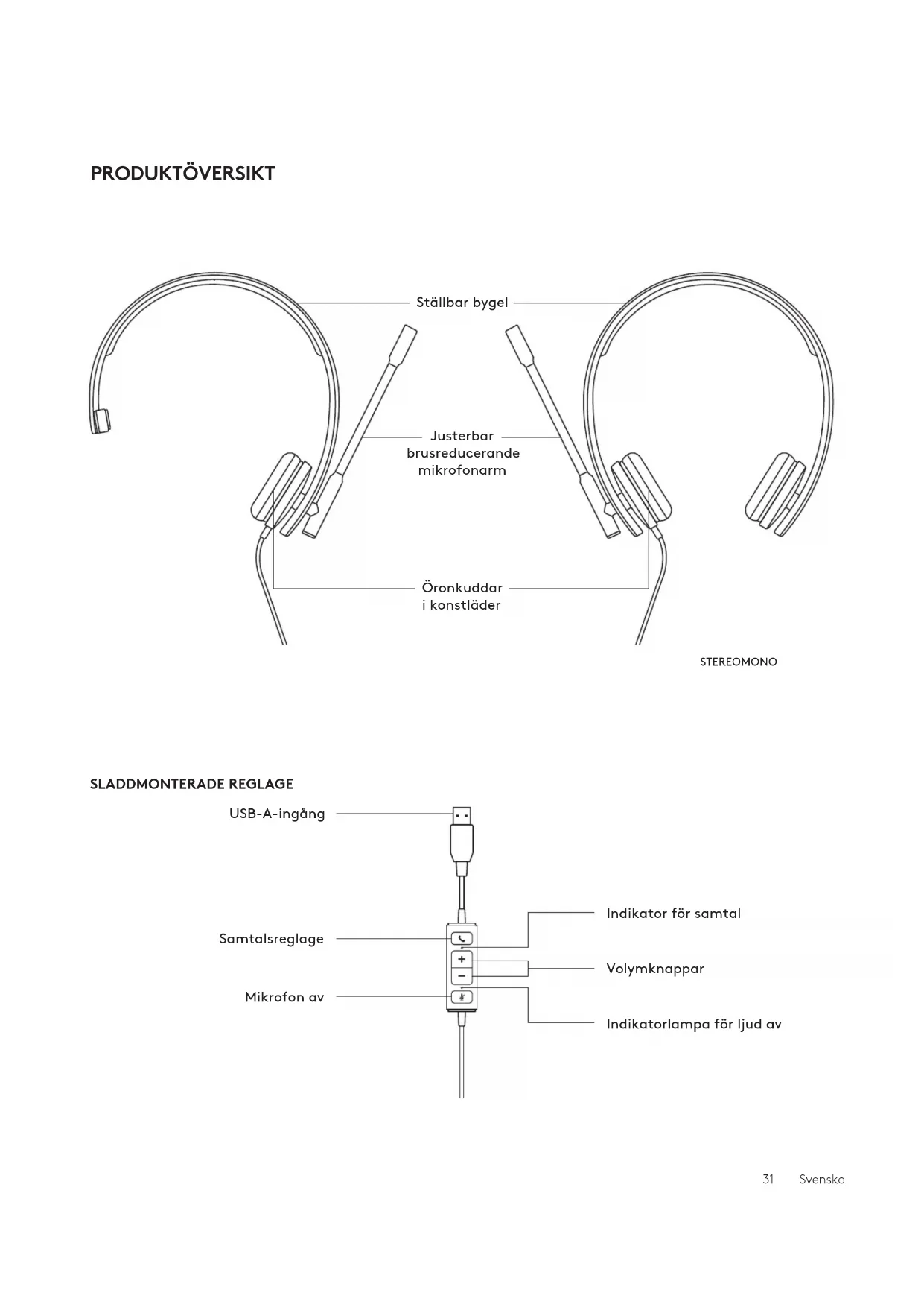 SLADDMONTERADE REGLAGE Ställbar bygel USB-A-ingång Samtalsreglage Mikrofon av Justerbar brusreducerande mikrofonarm Öronkuddar ikonstläder STEREOMONO Volymknappar Indikator för samtal Indikatorlampa för ljud av 31 SvenskaSÅ HÄR STÄLLER DU IN HEADSETET Justera headsetet genom att föra bygeln till öppet ellerstängt. JUSTERA MIKROFONARMEN 1 Mikrofonarmen roterar 270 grader. Hadenpåantingen höger eller vänster sida. 2 Justera platsen för den exibla mikrofonarmen förattfånga rösten bättre. INNEHÅLL MONO 1 Headset med sladdmonterat reglage och USB-A-kontakt 2 Bruksanvisning STEREO 1 Headset med sladdmonterat reglage och USB-A-kontakt 2 Bruksanvisning USB-A USB-A