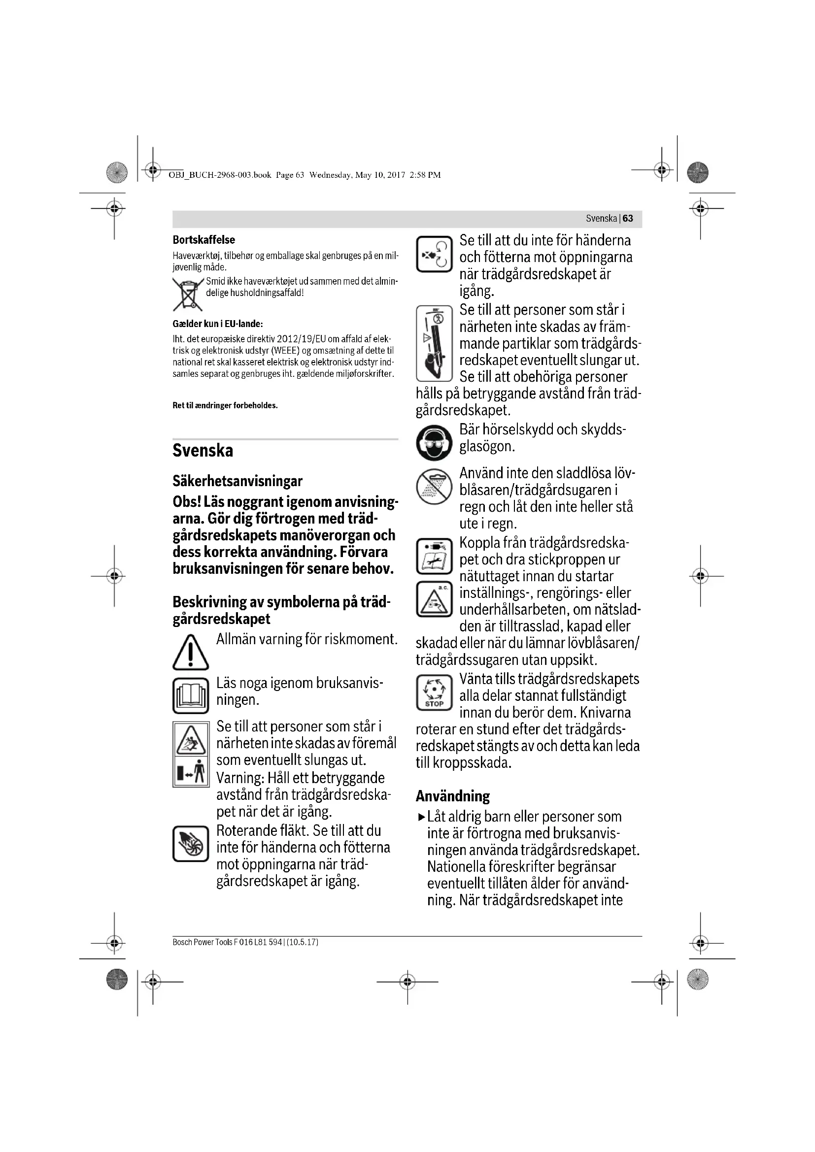Handlingsmål Fig. Side OBJ_BUCH-2968-003.book Page 61 Wednesday, May 10, 2017 2:58 PM62 | Dansk F 016 L81 594 | (10.5.17) Bosch Power Tools Fejlsøgning Vedligeholdelse og service Vedligeholdelse, rengøring og opbevaring Træk stikket ud af stikdåsen, før der arbejdes på have- værktøjet. Hold haveværktøjet rent for at arbejde sikkert og godt. Haveredskab og ventilationsåbninger skal altid holdes rene for at kunne arbejde godt og sikkert. Fjern snavs fra haveværktøj eller opsamlerpose med en fugtig klud. Sprøjt/dyp aldrig haveredskabet med/i vand. Opbevar haveredskabet et sikkert sted, som skal være tørt og uden for børns rækkevidde. Stil ikke andre genstande fra på haveredskabet. Kundeservice og brugerrådgivning www.bosch-garden.com Det 10-cifrede typenummer på haveværktøjets typeskilt skal altid angives ved forespørgsler og bestilling af reservedele. Dansk Bosch Service Center Telegrafvej 3 2750 Ballerup På www.bosch-pt.dk kan der online bestilles reservedele eller oprettes en reparations ordre. Tlf. Service Center: 44898855 Fax: 44898755 E-Mail: vaerktoej@dk.bosch.com Symptom Mulig årsag Afhjælpning Haveværktøj kører ikke Komponenter er ikke monteret rigtigt se „Montering“ Strøm er afbrudt Kontroller og tænd for strømmen Stikkontakt er defekt Prøv en anden stikkontakt Forlængerledning er beskadiget Ledning kontrolleres og skiftes, hvis den er beskadiget Defekt/sprunget sikring Udskift sikring Motorværn er aktiveret Lad motor afkøle og kontroller, om blæser spærrer Haveværktøj kører i inter- valler Forlængerledning er beskadiget Ledning kontrolleres og skiftes, hvis den er beskadiget Haveværktøjets indvendige ledninger er beska- diget Kontakt serviceforhandleren Start-stop-kontakten er defekt Kontakt serviceforhandleren Motorværn er aktiveret Lad motor afkøle og kontroller, om blæser spærrer For stor vibration/støj Haveværktøj defekt Kontakt serviceforhandleren Haveværktøj blæser/suger ikke Dyse/sugerør er blokeret Frigør dyse/sugerør Dyse/sugerør kan ikke monteres Forkert montering se „Montering“ Sugeintensitet forringes Opsamlerpose er fuld Tøm opsamlerpose Tilslutningsstuds på opsamlerpose er blokeret Frigør tilslutningsstuds på opsamlerpose Blæser roterer ikke Blæser er blokeret Sluk for haveværktøj og fjern blokering (brug be- skyttelseshandsker) OBJ_BUCH-2968-003.book Page 62 Wednesday, May 10, 2017 2:58 PMSvenska | 63 Bosch Power Tools F 016 L81 594 | (10.5.17) Bortskaffelse Haveværktøj, tilbehør og emballage skal genbruges på en mil- jøvenlig måde. Smid ikke haveværktøjet ud sammen med det almin- delige husholdningsaffald! Gælder kun i EU-lande: Iht. det europæiske direktiv 2012/19/EU om affald af elek- trisk og elektronisk udstyr (WEEE) og omsætning af dette til national ret skal kasseret elektrisk og elektronisk udstyr ind- samles separat og genbruges iht. gældende miljøforskrifter. Ret til ændringer forbeholdes. Svenska Säkerhetsanvisningar Obs! Läs noggrant igenom anvisning- arna. Gör dig förtrogen med träd- gårdsredskapets manöverorgan och dess korrekta användning. Förvara bruksanvisningen för senare behov. Beskrivning av symbolerna på träd- gårdsredskapet Allmän varning för riskmoment. Läs noga igenom bruksanvis- ningen. Se till att personer som står i närheten inte skadas av föremål som eventuellt slungas ut. Varning: Håll ett betryggande avstånd från trädgårdsredska- pet när det är igång. Roterande fläkt. Se till att du inte för händerna och fötterna mot öppningarna när träd- gårdsredskapet är igång. Se till att du inte för händerna och fötterna mot öppningarna när trädgårdsredskapet är igång. Se till att personer som står i närheten inte skadas av främ- mande partiklar som trädgårds- redskapet eventuellt slungar ut. Se till att obehöriga personer hålls på betryggande avstånd från träd- gårdsredskapet. Bär hörselskydd och skydds- glasögon. Använd inte den sladdlösa löv- blåsaren/trädgårdsugaren i regn och låt den inte heller stå ute i regn. Koppla från trädgårdsredska- pet och dra stickproppen ur nätuttaget innan du startar inställnings-, rengörings- eller underhållsarbeten, om nätslad- den är tilltrasslad, kapad eller skadad eller när du lämnar lövblåsaren/ trädgårdssugaren utan uppsikt. Vänta tills trädgårdsredskapets alla delar stannat fullständigt innan du berör dem. Knivarna roterar en stund efter det trädgårds- redskapet stängts av och detta kan leda till kroppsskada. Användning Låt aldrig barn eller personer som inte är förtrogna med bruksanvis- ningen använda trädgårdsredskapet. Nationella föreskrifter begränsar eventuellt tillåten ålder för använd- ning. När trädgårdsredskapet inte OBJ_BUCH-2968-003.book Page 63 Wednesday, May 10, 2017 2:58 PM64 | Svenska F 016 L81 594 | (10.5.17) Bosch Power Tools används ska det förvaras oåtkomligt för barn. Trädgårdsredskapet får inte använ- das av person (inklusive barn) med begränsad fysisk, sensorisk eller psy- kisk förmåga och/eller som saknar den erfarenhet och kunskap som krävs för hantering. Undantag görs om personen övervakas av en ansva- rig person som kan undervisa i träd- gårdsredskapets användning. Barn bör övervakas för att säkerställa att de inte leker med trädgårdsred- skapet. Använd aldrig trädgårdsredskapet när personer, speciellt då barn eller husdjur, uppehåller sig i närheten. Användaren eller ägaren ansvarar för olyckor och skador som drabbar andra människor eller deras egen- dom. När trädgårdsredskapet används får inga andra personer eller djur uppe- hålla sig inom en omkrets på 3 m. Operatören ansvarar för främmande person. Använd trädgårdsredskapet endast i dagsljus eller vid god belysning. Använd inte trädgårdsredskapet när du är trött eller om du är påverkad av alkohol, droger eller mediciner. Använd inte trädgårdsmaskiner i dåligt väder, särski