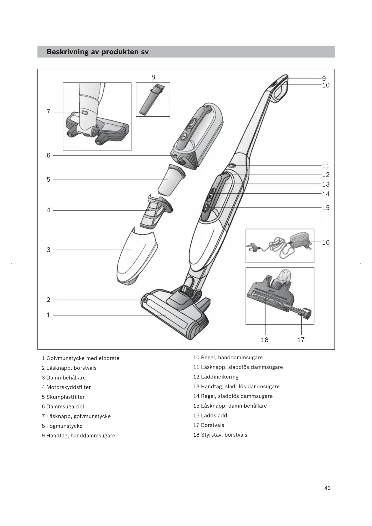 no43 Beskrivning av produkten sv 1 Golvmunstycke med elborste 2 Låsknapp, borstvals 3 Dammbehållare 4 Motorskyddsfilter 5 Skumplastfilter 6 Dammsugardel 7 Låsknapp, golvmunstycke 8 Fogmunstycke 9 Handtag, handdammsugare 10 Regel, handdammsugare 11 Låsknapp, sladdlös dammsugare 12 Laddindikering 13 Handtag, sladdlös dammsugare 14 Regel, sladdlös dammsugare 15 Låsknapp, dammbehållare 16 Laddsladd 17 Borstvals 18 Styrstav, borstvals