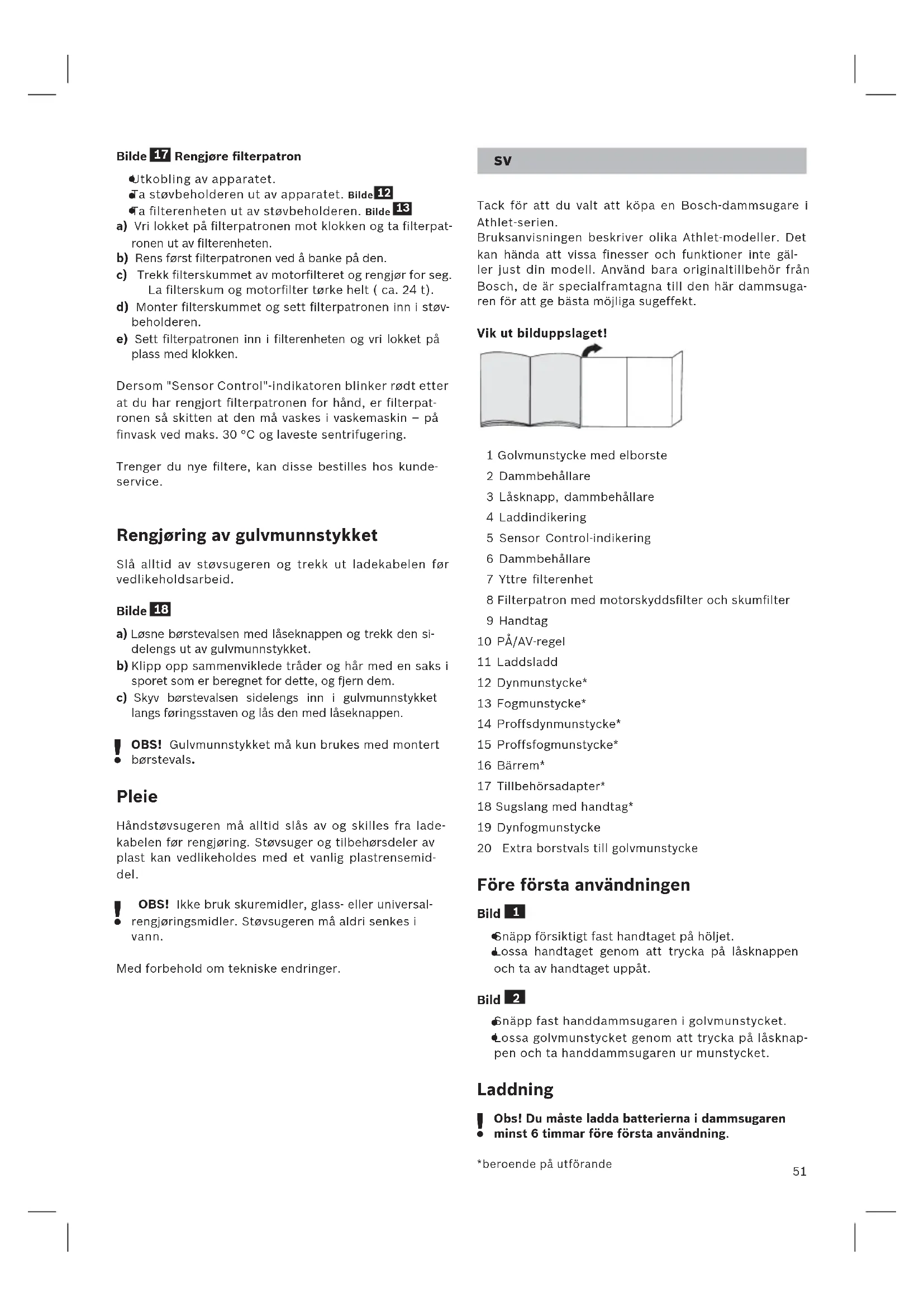 Tack för att du valt att köpa en Bosch-dammsugare i Athlet-serien. Bruksanvisningen beskriver olika Athlet-modeller. Det kan hända att vissa finesser och funktioner inte gäl- ler just din modell. Använd bara originaltillbehör från Bosch, de är specialframtagna till den här dammsuga- ren för att ge bästa möjliga sugeffekt. Vik ut bilduppslaget! 1 Golvmunstycke med elborste 2 Dammbehållare 3 Låsknapp, dammbehållare 4 Laddindikering 5 Sensor Control-indikering 6 Dammbehållare 7 Yttre filterenhet 8 Filterpatron med motorskyddsfilter och skumfilter 9 Handtag 10 PÅ/AV-regel 11 Laddsladd 12 Dynmunstycke* 13 Fogmunstycke* 14 Proffsdynmunstycke* 15 Proffsfogmunstycke* 16 Bärrem* 17 Tillbehörsadapter* 18 Sugslang med handtag* 19 Dynfogmunstycke 20 Extra borstvals till golvmunstycke Före första användningen Bild