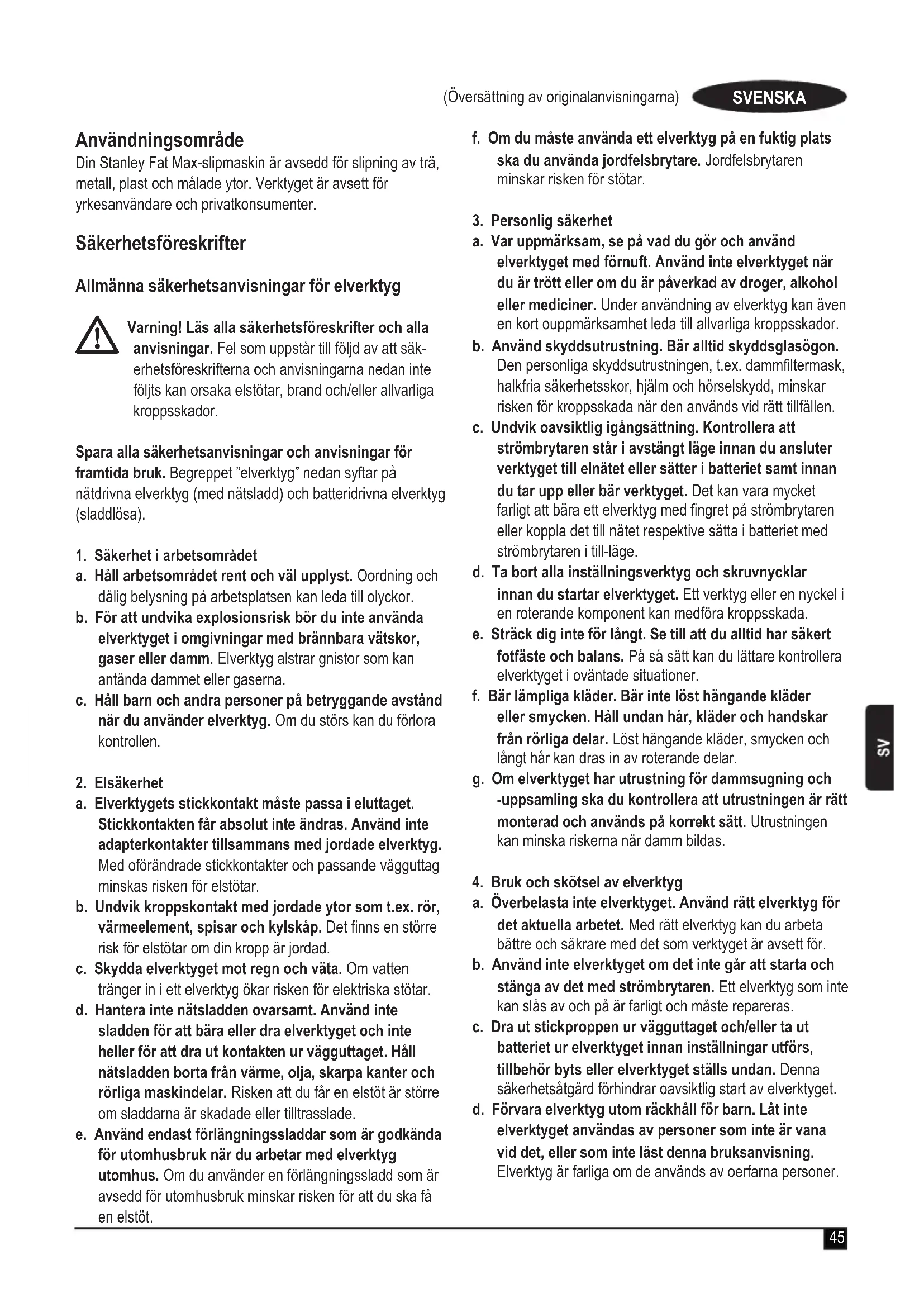 Om din Stanley Fat Max-produkt går sönder på grund av material- och/eller fabrikationsfel inom 12 månader från köpet, åtar sig Stanley Europe att byta ut alla trasiga delar utan kost- nad med minsta besvär för kunden eller, efter eget godtycke, utan kostnad byta ut produkten förutsatt att: u produkten inte har misskötts och har använts enligt bruksanvisningen. u produkten har utsatts för normalt slitage. u reparationer inte har utförts av personer som inte är auktoriserade reparatörer. u inköpskvitto nns. u Stanley Fat Max-produkten returneras komplett med alla originaldelar Om du vill göra ett garantianspråk kontaktar du åter- försäljaren, letar upp närmaste auktoriserade Stanley Fat Max-verkstad i Stanley Fat Max-katalogen eller kontaktar det lokala Stanley-kontoret på den adress som är angiven i bruksanvisningen. En lista över alla auktoriserade Stanley Fat Max-verkstäder samt servicevillkor nns på Internet: www. stanley.eu/350 (Oversettelse av de opprinnelige instruksjonene) NORSK Bruksområde Sliperen fra Stanley Fat Max er konstruert for sliping av treverk, metall, plast og malte overater. Dette verktøyet er tiltenkt både fagarbeidere og private brukere. Sikkerhetsinstruksjoner Generelle sikkerhetsadvarsler for elektroverktøy
