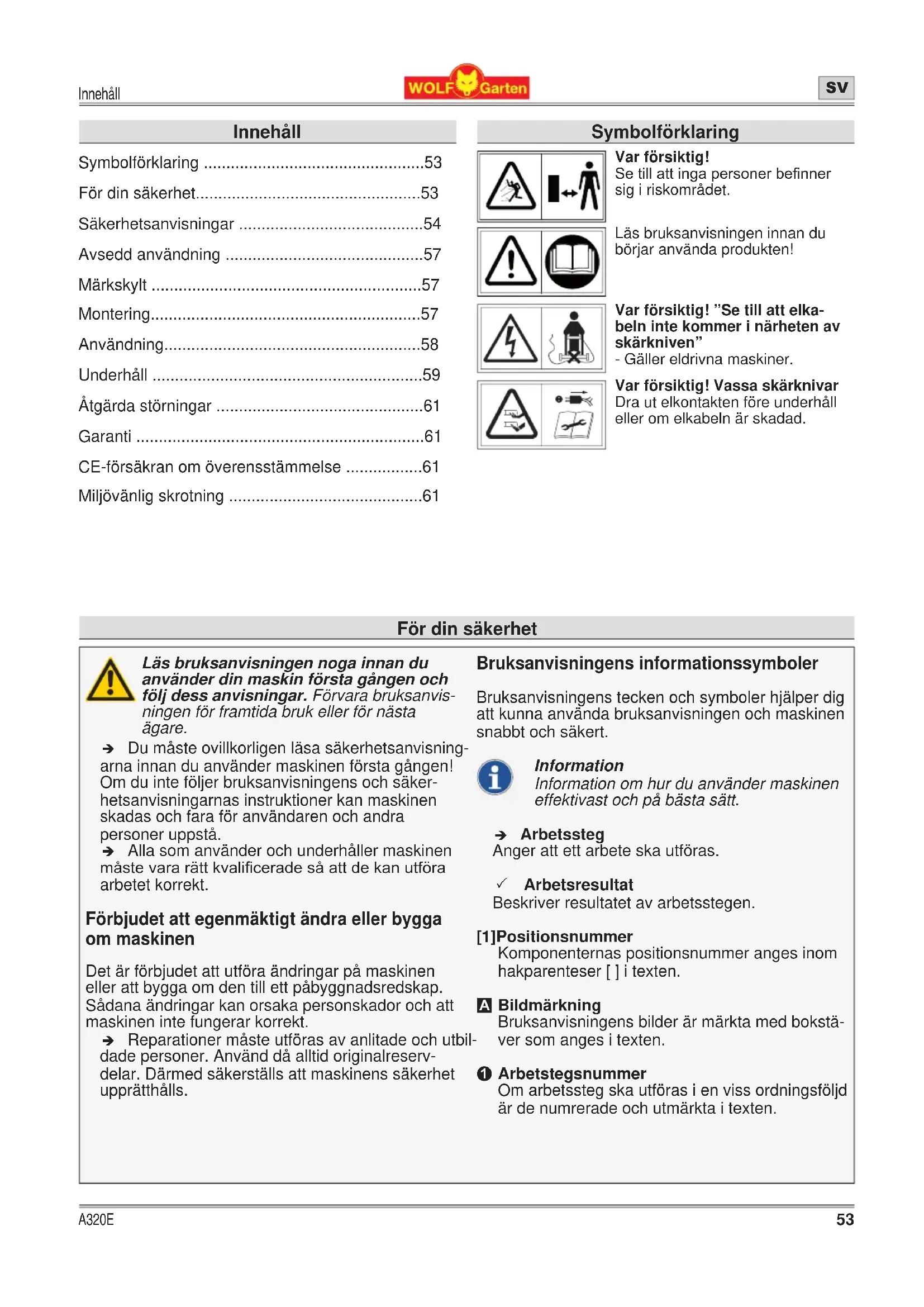 - Miljövänlig skrotning För din säkerhet Symbolförklaring Var försiktig! Se till att inga personer benner sig i riskområdet. Läs bruksanvisningen innan du börjar använda produkten! Var försiktig! ”Se till att elka- beln inte kommer i närheten av skärkniven” - Gäller eldrivna maskiner. Var försiktig! Vassa skärknivar Dra ut elkontakten före underhåll eller om elkabeln är skadad.54 A320E Säkerhetsanvisningar p. 61