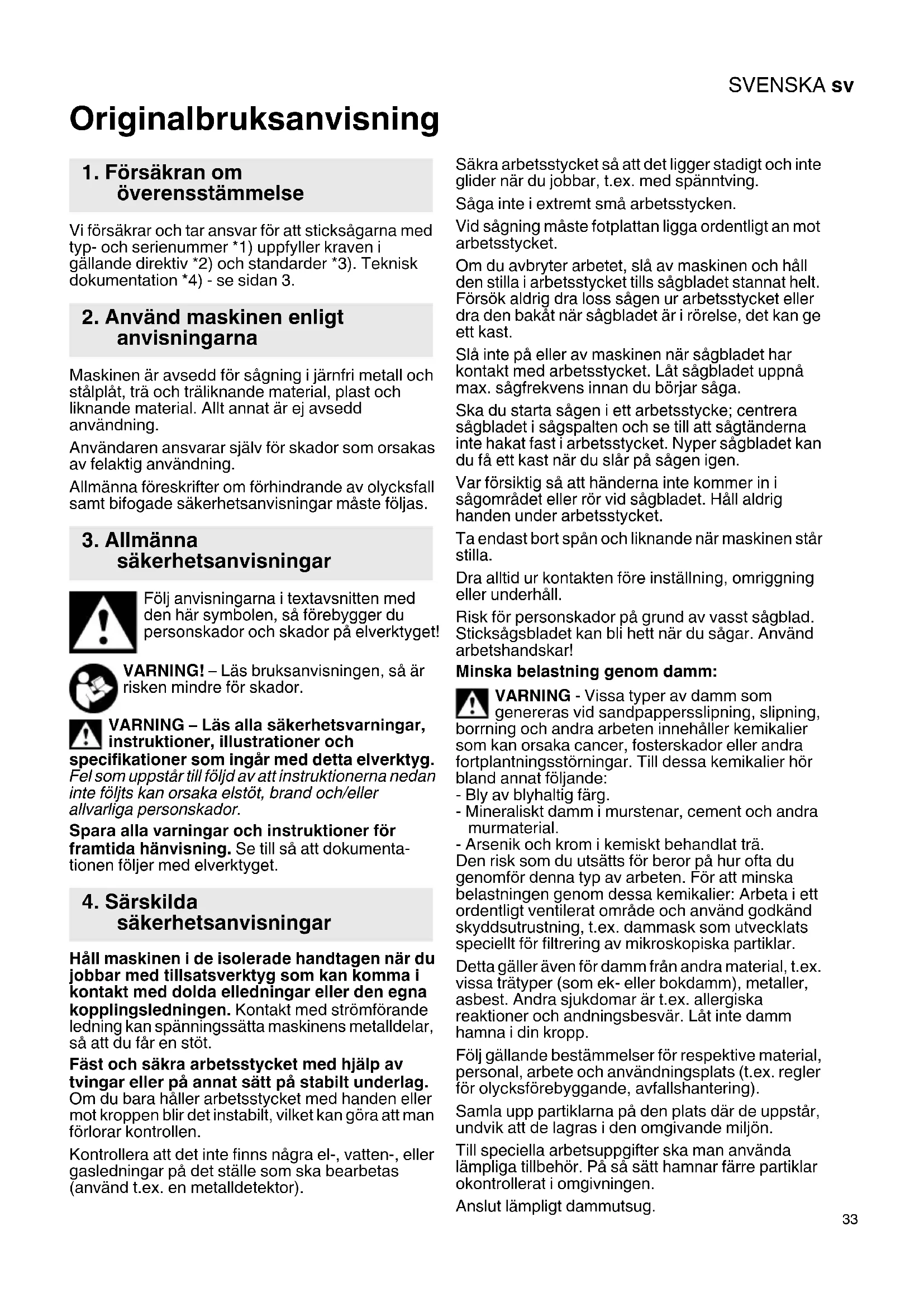 Originalbruksanvisning Vi försäkrar och tar ansvar för att sticksågarna med typ- och serienummer *1) uppfyller kraven i gällande direktiv *2) och standarder *3). Teknisk dokumentation *4) - se sidan 3. Maskinen är avsedd för sågning i järnfri metall och stålplåt, trä och träliknande material, plast och liknande material. Allt annat är ej avsedd användning. Användaren ansvarar själv för skador som orsakas av felaktig användning. Allmänna föreskrifter om förhindrande av olycksfall samt bifogade säkerhetsanvisningar måste följas. Följ anvisningarna i textavsnitten med den här symbolen, så förebygger du personskador och skador på elverktyget! VARNING! – Läs bruksanvisningen, så är risken mindre för skador. VARNING – Läs alla säkerhetsvarningar, instruktioner, illustrationer och specifikationer som ingår med detta elverktyg. Fel som uppstår till följd av att instruktionerna nedan inte följts kan orsaka elstöt, brand och/eller allvarliga personskador. Spara alla varningar och instruktioner för framtida hänvisning. Se till så att dokumenta- tionen följer med elverktyget. Håll maskinen i de isolerade handtagen när du jobbar med tillsatsverktyg som kan komma i kontakt med dolda elledningar eller den egna kopplingsledningen. Kontakt med strömförande ledning kan spänningssätta maskinens metalldelar, så att du får en stöt. Fäst och säkra arbetsstycket med hjälp av tvingar eller på annat sätt på stabilt underlag. Om du bara håller arbetsstycket med handen eller mot kroppen blir det instabilt, vilket kan göra att man förlorar kontrollen. Kontrollera att det inte finns några el-, vatten-, eller gasledningar på det ställe som ska bearbetas (använd t.ex. en metalldetektor). Säkra arbetsstycket så att det ligger stadigt och inte glider när du jobbar, t.ex. med spänntving. Såga inte i extremt små arbetsstycken. Vid sågning måste fotplattan ligga ordentligt an mot arbetsstycket. Om du avbryter arbetet, slå av maskinen och håll den stilla i arbetsstycket tills sågbladet stannat helt. Försök aldrig dra loss sågen ur arbetsstycket eller dra den bakåt när sågbladet är i rörelse, det kan ge ett kast. Slå inte på eller av maskinen när sågbladet har kontakt med arbetsstycket. Låt sågbladet uppnå max. sågfrekvens innan du börjar såga. Ska du starta sågen i ett arbetsstycke; centrera sågbladet i sågspalten och se till att sågtänderna inte hakat fast i arbetsstycket. Nyper sågbladet kan du få ett kast när du slår på sågen igen. Var försiktig så att händerna inte kommer in i sågområdet eller rör vid sågbladet. Håll aldrig handen under arbetsstycket. Ta endast bort spån och liknande när maskinen står stilla. Dra alltid ur kontakten före inställning, omriggning eller underhåll. Risk för personskador på grund av vasst sågblad. Sticksågsbladet kan bli hett när du sågar. Använd arbetshandskar! Minska belastning genom damm: VARNING - Vissa typer av damm som genereras vid sandpappersslipning, slipning, borrning och andra arbeten innehåller kemikalier som kan orsaka cancer, fosterskador eller andra fortplantningsstörningar. Till dessa kemikalier hör bland annat följande: - Bly av blyhaltig färg. - Mineraliskt damm i murstenar, cement och andra murmaterial. - Arsenik och krom i kemiskt behandlat trä. Den risk som du utsätts för beror på hur ofta du genomför denna typ av arbeten. För att minska belastningen genom dessa kemikalier: Arbeta i ett ordentligt ventilerat område och använd godkänd skyddsutrustning, t.ex. dammask som utvecklats speciellt för filtrering av mikroskopiska partiklar. Detta gäller även för damm från andra material, t.ex. vissa trätyper (som ek- eller bokdamm), metaller, asbest. Andra sjukdomar är t.ex. allergiska reaktioner och andningsbesvär. Låt inte damm hamna i din kropp. Följ gällande bestämmelser för respektive material, personal, arbete och användningsplats (t.ex. regler för olycksförebyggande, avfallshantering). Samla upp partiklarna på den plats där de uppstår, undvik att de lagras i den omgivande miljön. Till speciella arbetsuppgifter ska man använda lämpliga tillbehör. På så sätt hamnar färre partiklar okontrollerat i omgivningen. Anslut lämpligt dammutsug.
