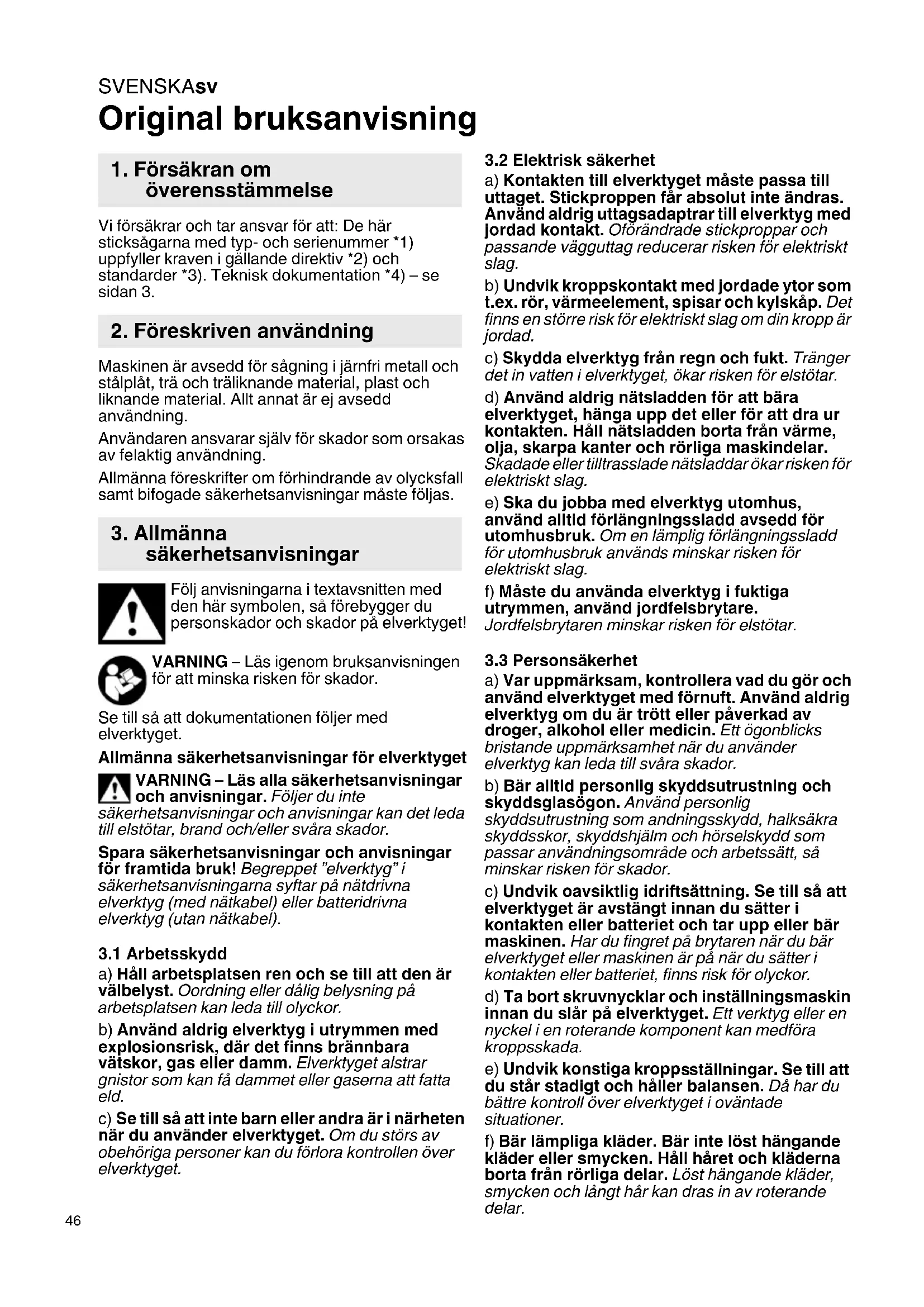 Original bruksanvisning Vi försäkrar och tar ansvar för att: De här sticksågarna med typ- och serienummer *1) uppfyller kraven i gällande direktiv *2) och standarder *3). Teknisk dokumentation *4) – se sidan 3. Maskinen är avsedd för sågning i järnfri metall och stålplåt, trä och träliknande material, plast och liknande material. Allt annat är ej avsedd användning. Användaren ansvarar själv för skador som orsakas av felaktig användning. Allmänna föreskrifter om förhindrande av olycksfall samt bifogade säkerhetsanvisningar måste följas. Följ anvisningarna i textavsnitten med den här symbolen, så förebygger du personskador och skador på elverktyget! VARNING – Läs igenom bruksanvisningen för att minska risken för skador. Se till så att dokumentationen följer med elverktyget. Allmänna säkerhetsanvisningar för elverktyget VARNING – Läs alla säkerhetsanvisningar och anvisningar. Följer du inte säkerhetsanvisningar och anvisningar kan det leda till elstötar, brand och/eller svåra skador. Spara säkerhetsanvisningar och anvisningar för framtida bruk! Begreppet ”elverktyg” i säkerhetsanvisningarna syftar på nätdrivna elverktyg (med nätkabel) eller batteridrivna elverktyg (utan nätkabel).