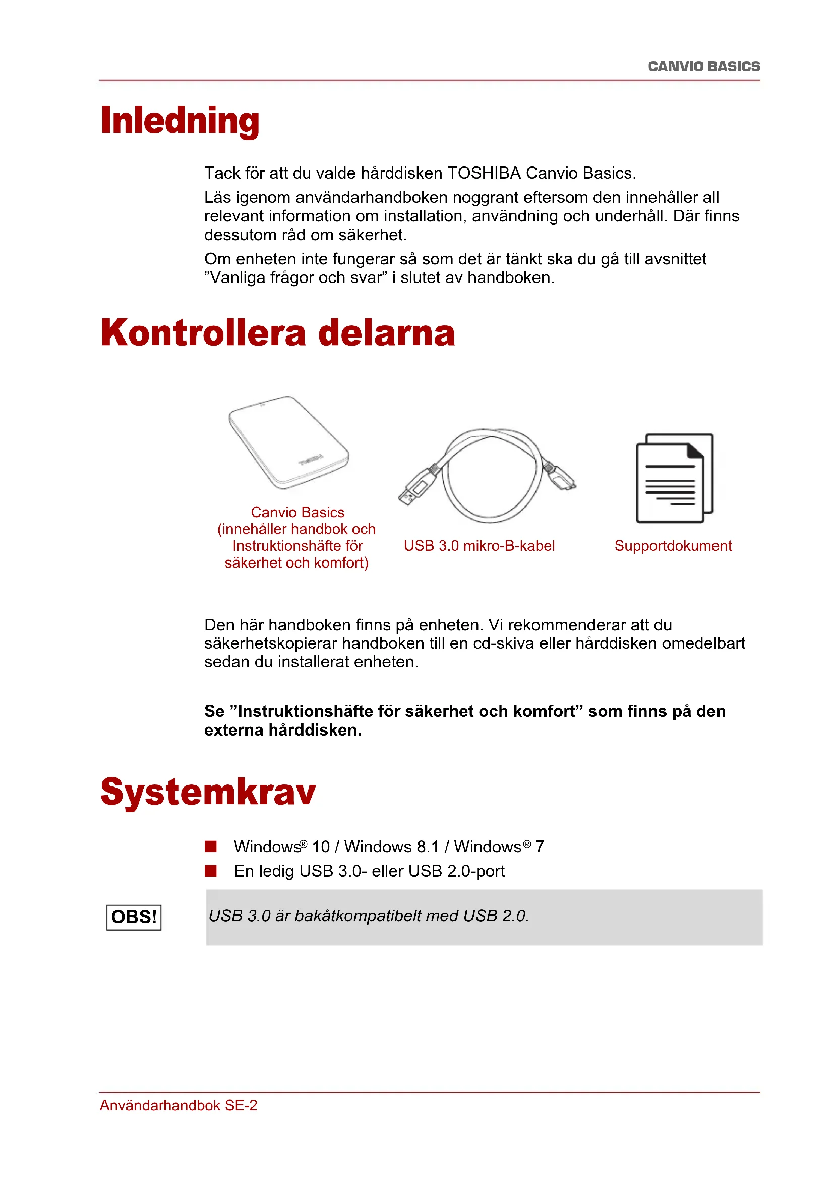 - Bestämmelser Användarhandbok SE-2 CANVIO BASICS Inledning Tack för att du valde hårddisken TOSHIBA Canvio Basics. Läs igenom användarhandboken noggrant eftersom den innehåller all relevant information om installation, användning och underhåll. Där finns dessutom råd om säkerhet. Om enheten inte fungerar så som det är tänkt ska du gå till avsnittet ”Vanliga frågor och svar” i slutet av handboken. Kontrollera delarna Den här handboken finns på enheten. Vi rekommenderar att du säkerhetskopierar handboken till en cd-skiva eller hårddisken omedelbart sedan du installerat enheten. Se ”Instruktionshäfte för säkerhet och komfort” som finns på den externa hårddisken. Systemkrav ■ Windows p. 7