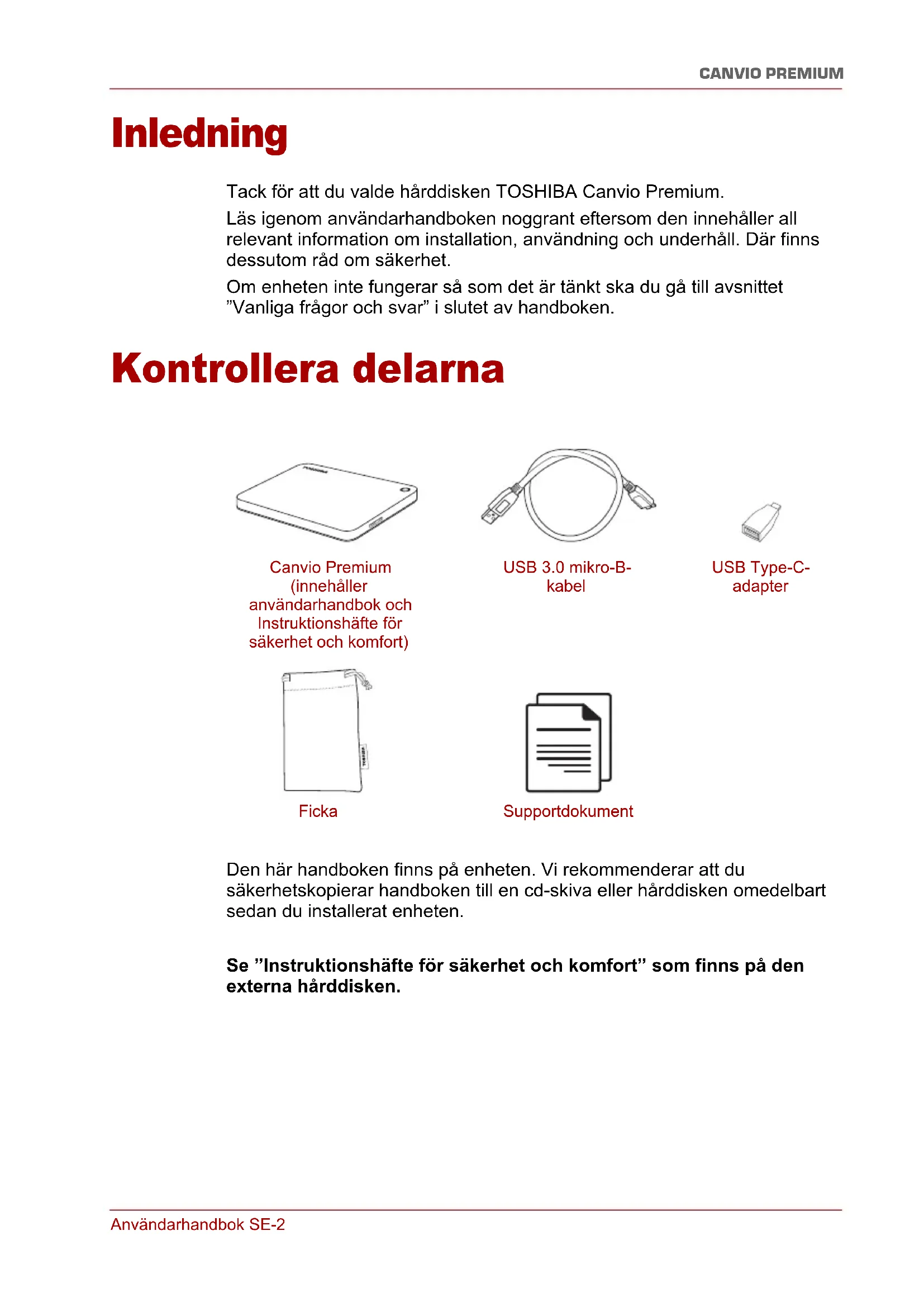 - Bestämmelser Användarhandbok SE-2 CANVIO PREMIUM Inledning Tack för att du valde hårddisken TOSHIBA Canvio Premium. Läs igenom användarhandboken noggrant eftersom den innehåller all relevant information om installation, användning och underhåll. Där finns dessutom råd om säkerhet. Om enheten inte fungerar så som det är tänkt ska du gå till avsnittet ”Vanliga frågor och svar” i slutet av handboken. Kontrollera delarna Den här handboken finns på enheten. Vi rekommenderar att du säkerhetskopierar handboken till en cd-skiva eller hårddisken omedelbart sedan du installerat enheten. Se ”Instruktionshäfte för säkerhet och komfort” som finns på den externa hårddisken. Canvio Premium (innehåller användarhandbok och Instruktionshäfte för säkerhet och komfort) USB 3.0 mikro-B- kabel Ficka USB Type-C- adapter SupportdokumentAnvändarhandbok SE-3 CANVIO PREMIUM Systemkrav ■ Windows p. 8
